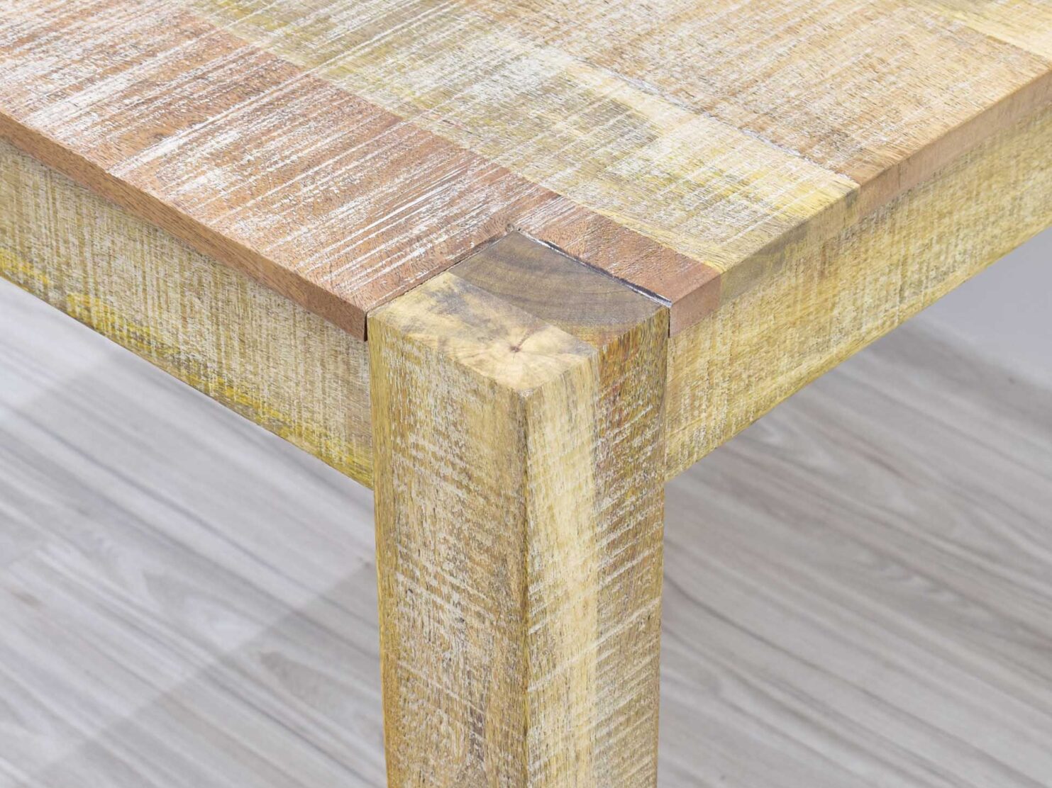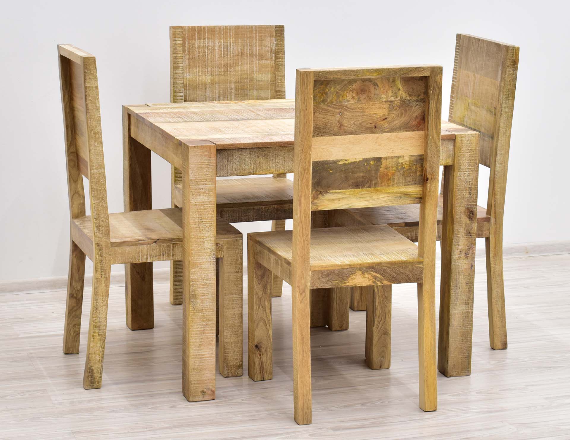 Komplet obiadowy do salonu zawierający stół oraz cztery krzesła z pełnymi oparciami. Cały komplet obiadowy wykonany został w 100% z litego drewna mango. Drewno mango ma bardzo wyrazistą strukturę i naturalnie jasny kolor, co wpływa na surowy wygląd wykonanych z niego mebli.  Ten obiadowy zestaw mebli wpisuje się w stylistykę bardzo nowoczesną, minimalistyczną.