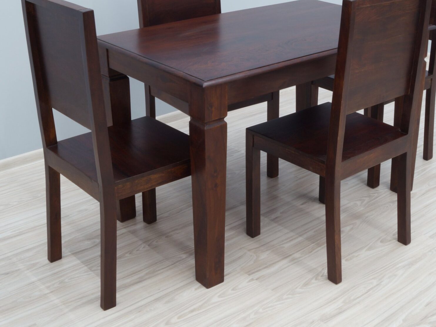 Komplet obiadowy składający się ze stołu oraz czterech krzeseł. Zestaw został stworzony w 100% z litego drewna palisandru indyjskiego. Duże płaszczyzny stołu eksponują unikatowe usłojenie drewna. Stół posiada frezowane nogi co nadaje jemu klasyczny, elegancki styl. Jego wymiary to 120/75/76 cm. Krzesła wyposażone zostały w pełne, nieozdobione oparcia i mają całkowitą wysokość 100cm, a siedzisko wymiary 45/45cm.