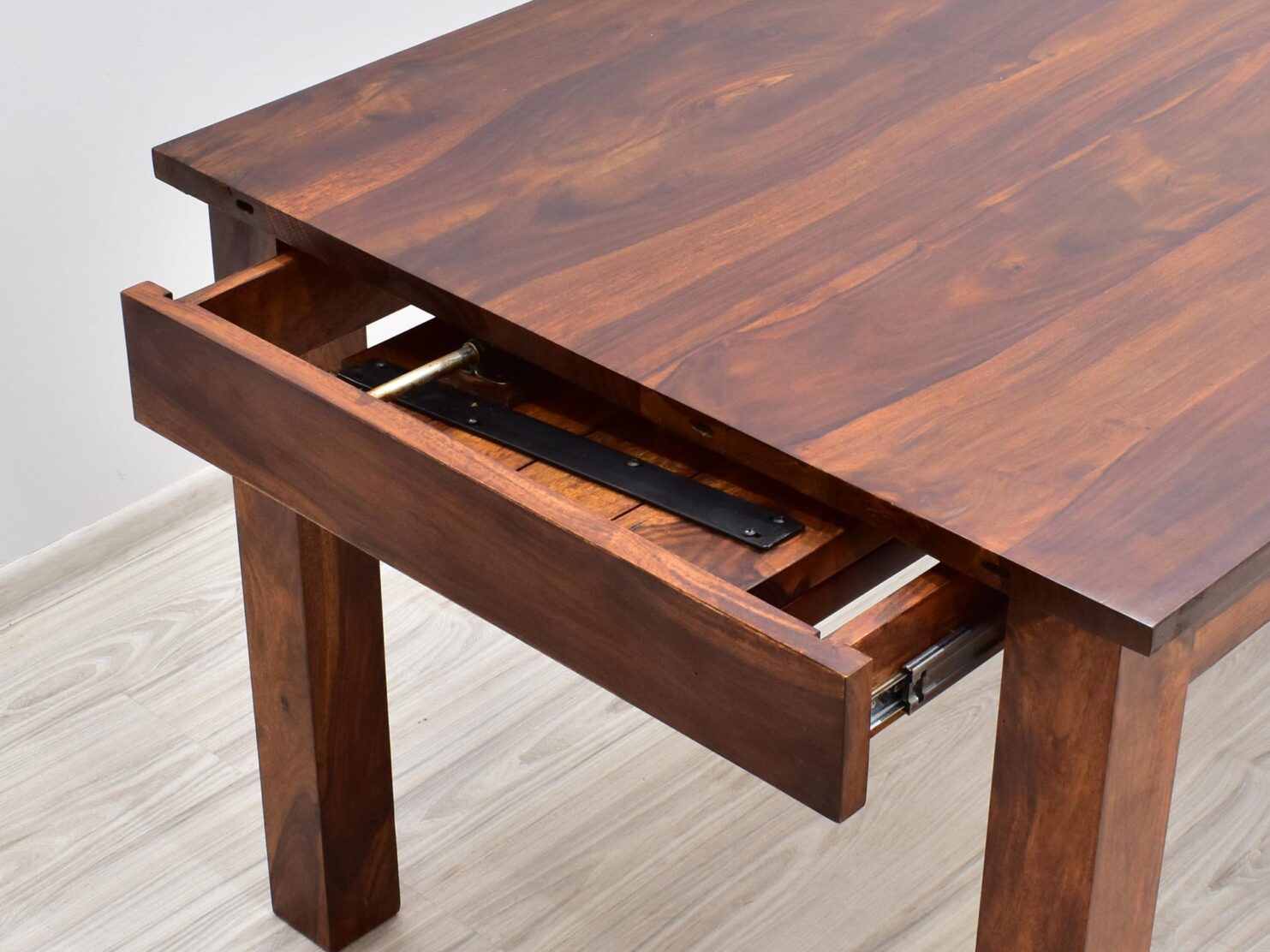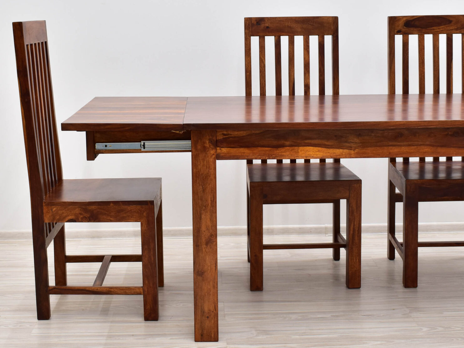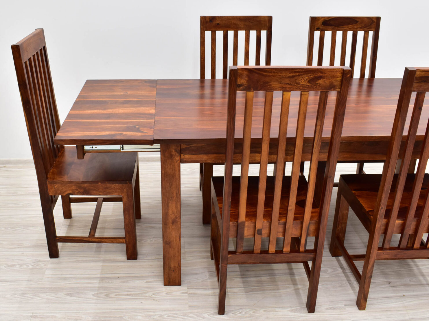 Zestaw składający się z dużego stołu oraz kompletu sześciu krzeseł. Całość wykonana została w 100% z litego drewna palisandru indyjskiego, zabejcowanego na ciepły, miodowy odcień brązu. Stół można rozłożyć, poprzez dołożenie dostawek, z długości 145cm na 225cm, natomiast krzesła mają stylowe, wysokie oparcia. Są one profilowane i posiadają ażurowy, wykonany z deseczek, wzór.