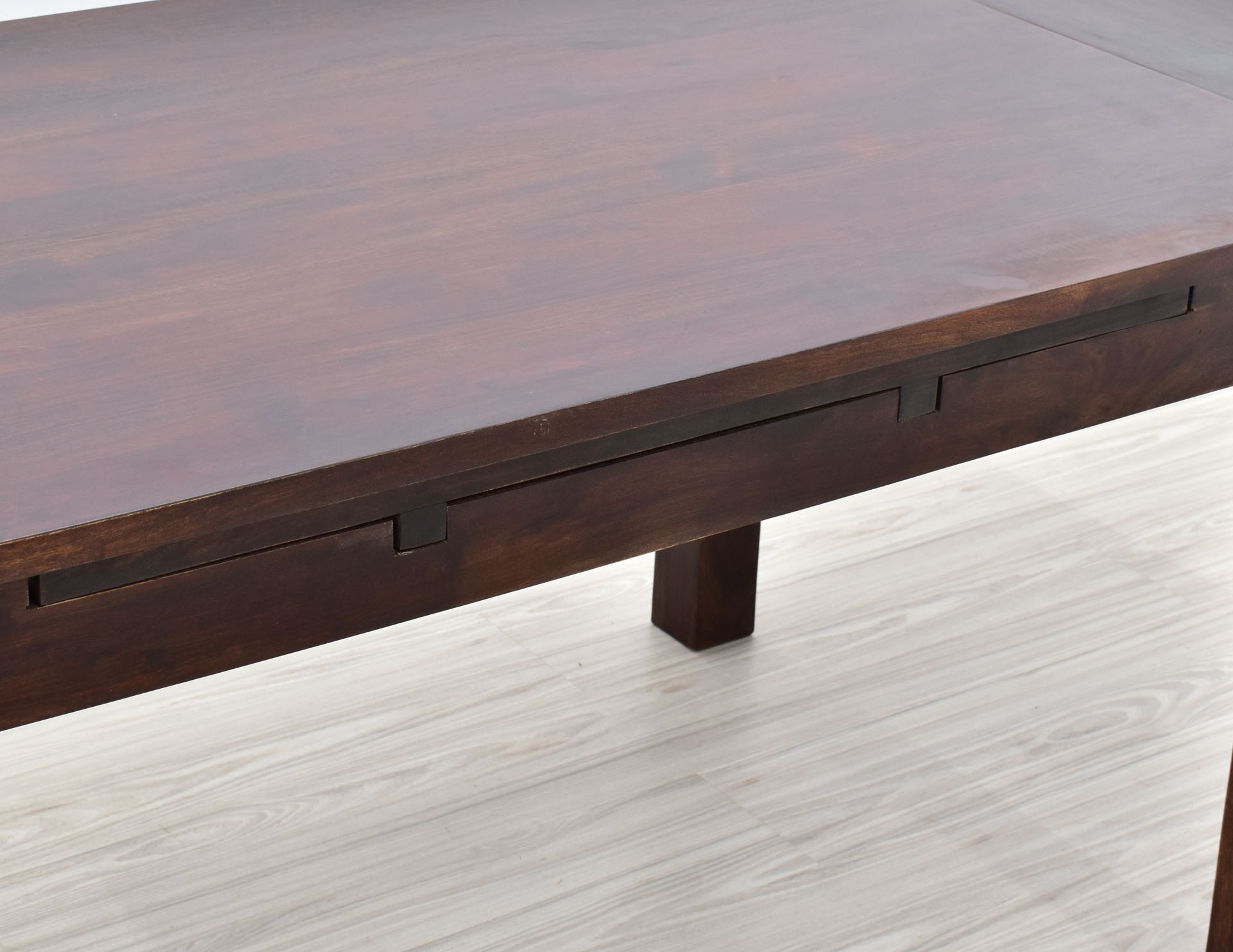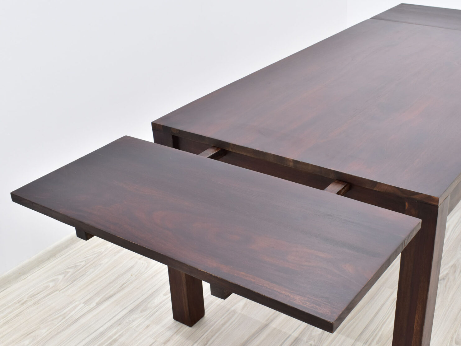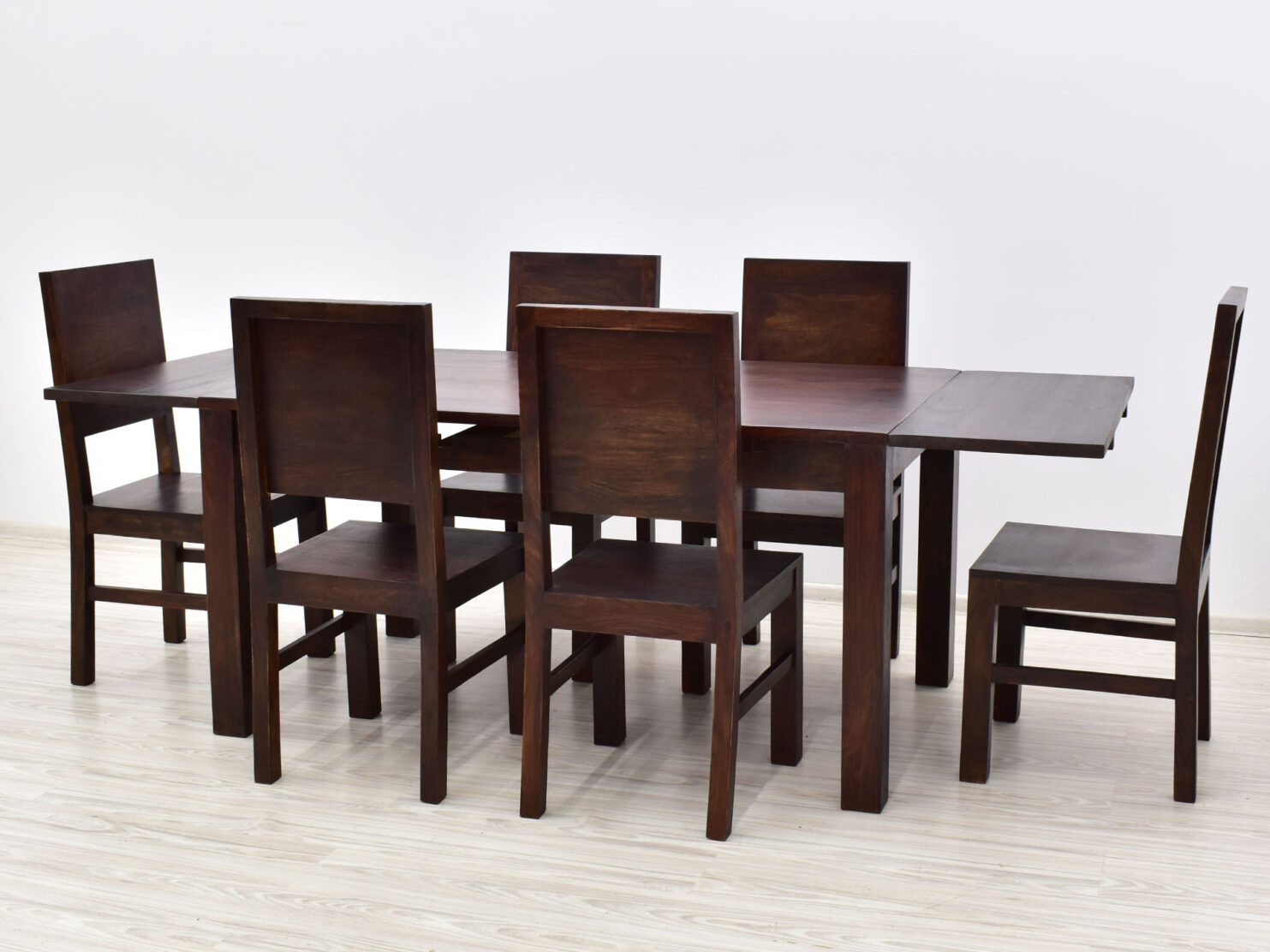 Komplet obiadowy, składający się z rozkładanego stołu oraz sześciu krzeseł, wykonany został w 100% z litego drewna palisandru indyjskiego. Stół oraz indyjskie krzesła mają ciemny kolor. Palisander indyjski posiada ciekawe usłojenie, które nadaje zestawowi modernistycznego wyglądu. Stół posiada funkcję rozłożenia z rozmiaru 150/90/76 cm na 230/90/76cm. Krzesła mają pełne oparcia, które nadają całemu zestawowi surowość. Ich wysokość to 100cm, a siedzisko ma wymiary 45/45cm.