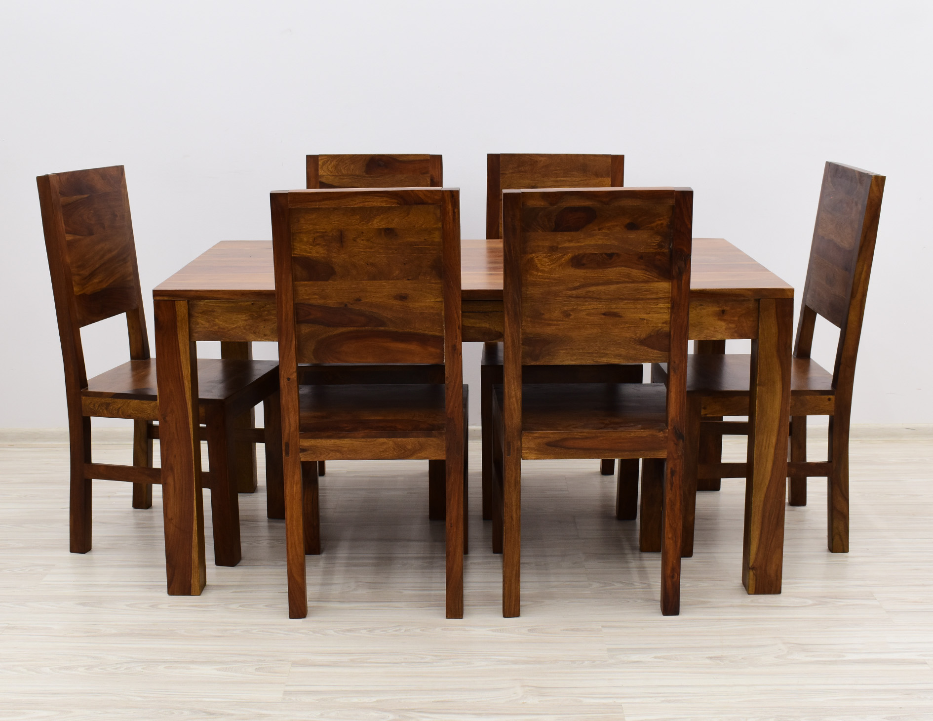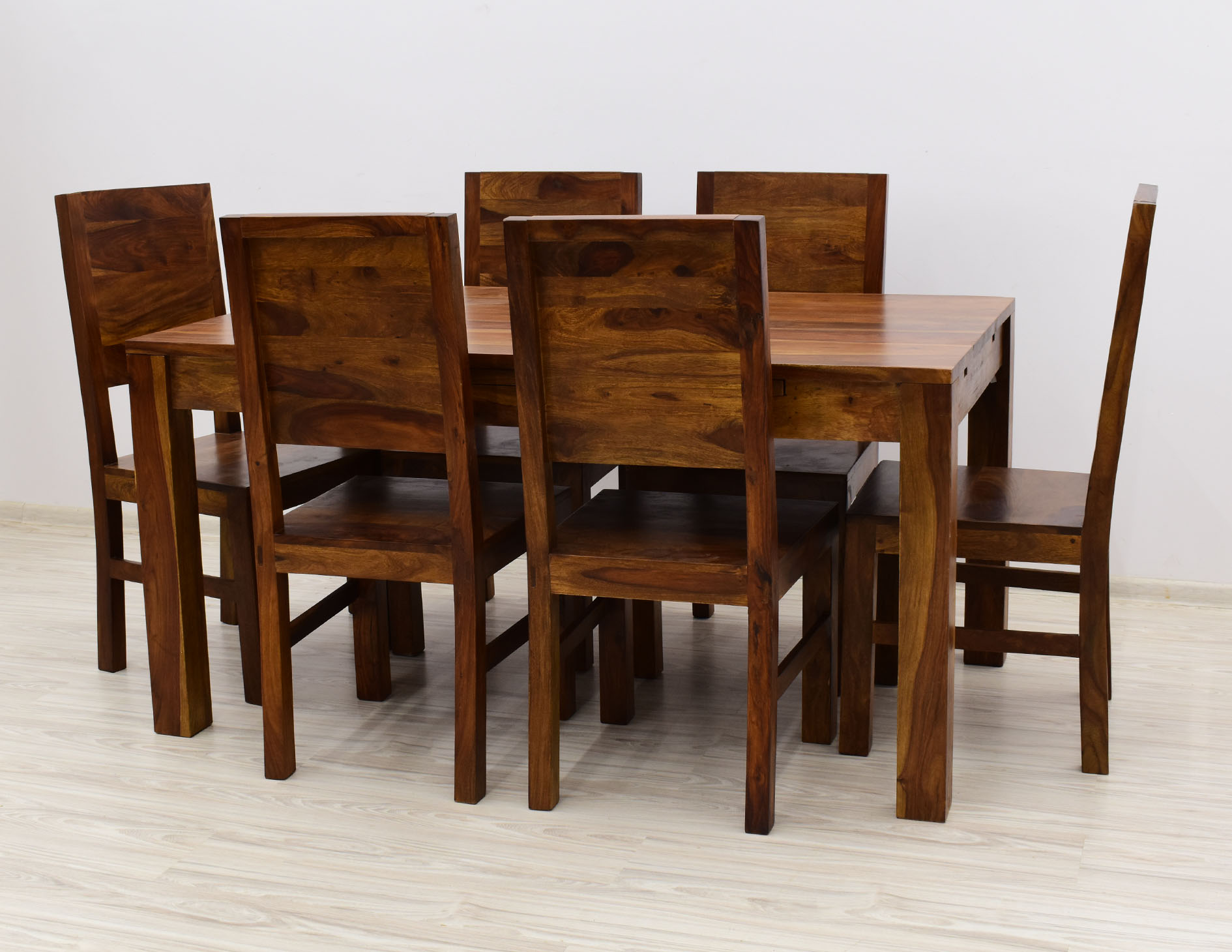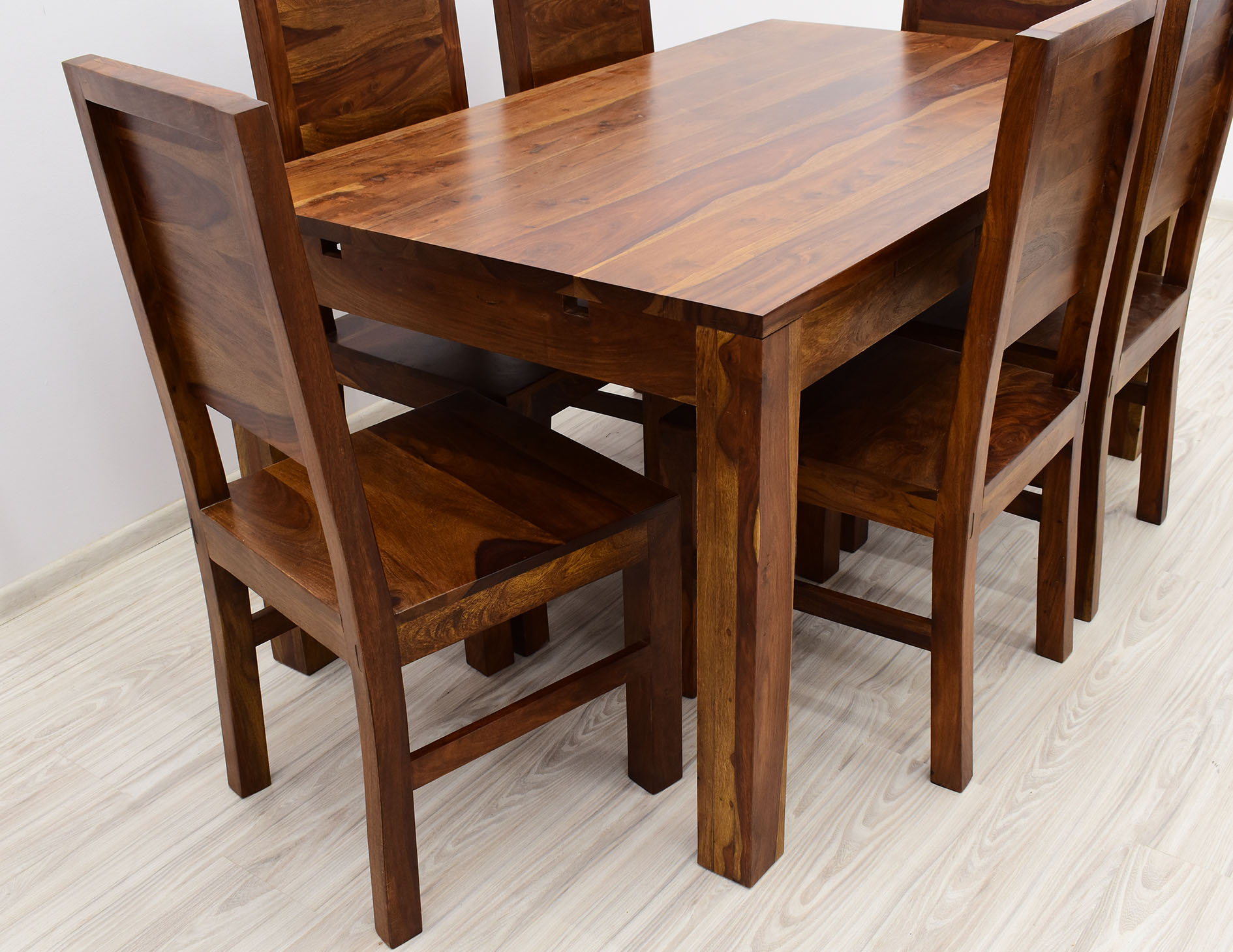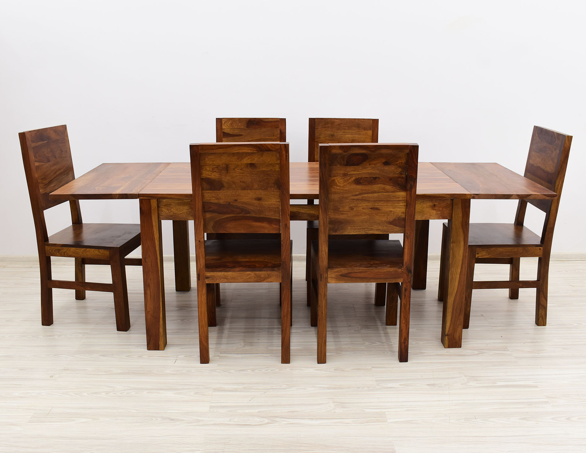 Komplet obiadowy, w skład którego wchodzi rozkładany ze 150/90/76 cm do 230/90/76 cm, masywny stół oraz sześć krzeseł. Całość wykonana w 100% z litego drewna palisandru indyjskiego, wybarwiona na jasny odcień brązu. Nieozdobione płaszczyzny mebli eksponują nieregularne, oleiste słoje drewna, a co za tym idzie wpisują ten zestaw w aranżację w nowoczesnym, surowym stylu.