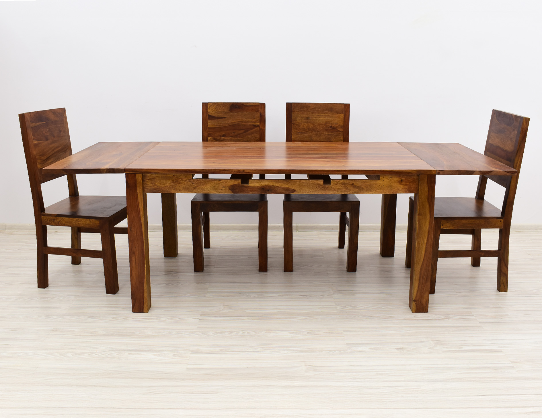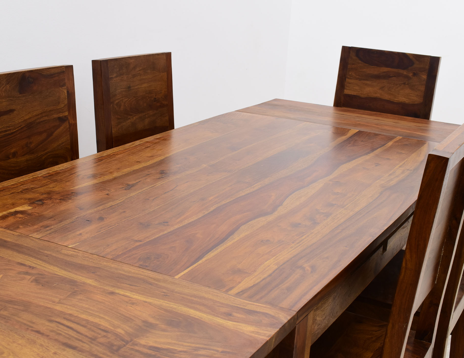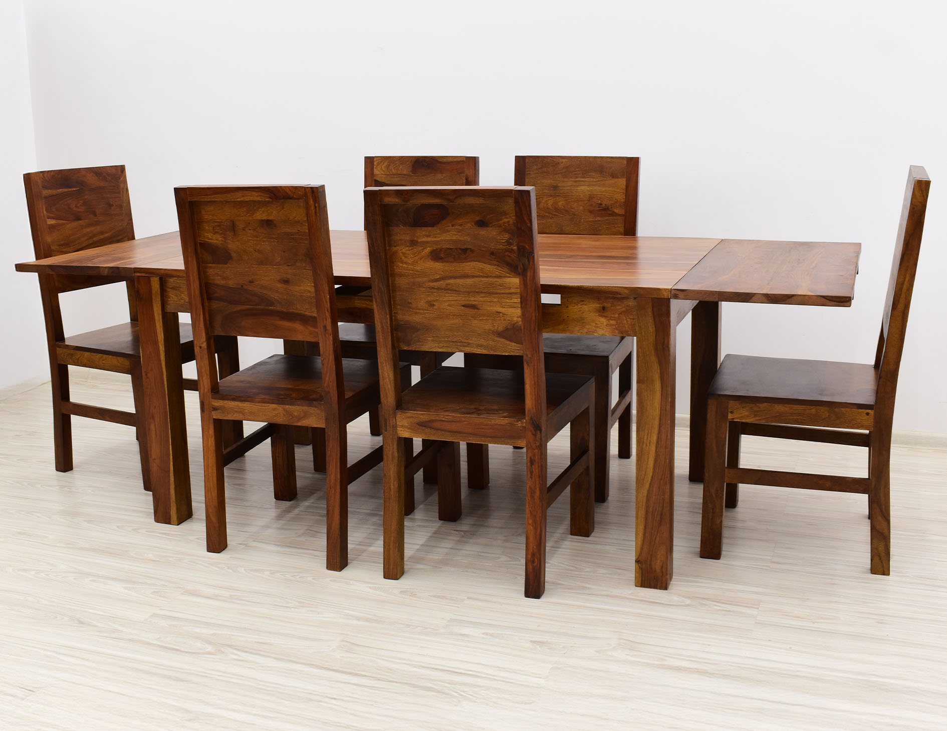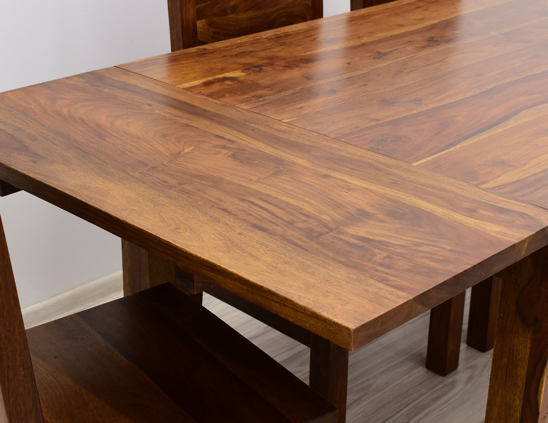 Komplet obiadowy, w skład którego wchodzi rozkładany ze 150/90/76 cm do 230/90/76 cm, masywny stół oraz sześć krzeseł. Całość wykonana w 100% z litego drewna palisandru indyjskiego, wybarwiona na jasny odcień brązu. Nieozdobione płaszczyzny mebli eksponują nieregularne, oleiste słoje drewna, a co za tym idzie wpisują ten zestaw w aranżację w nowoczesnym, surowym stylu.