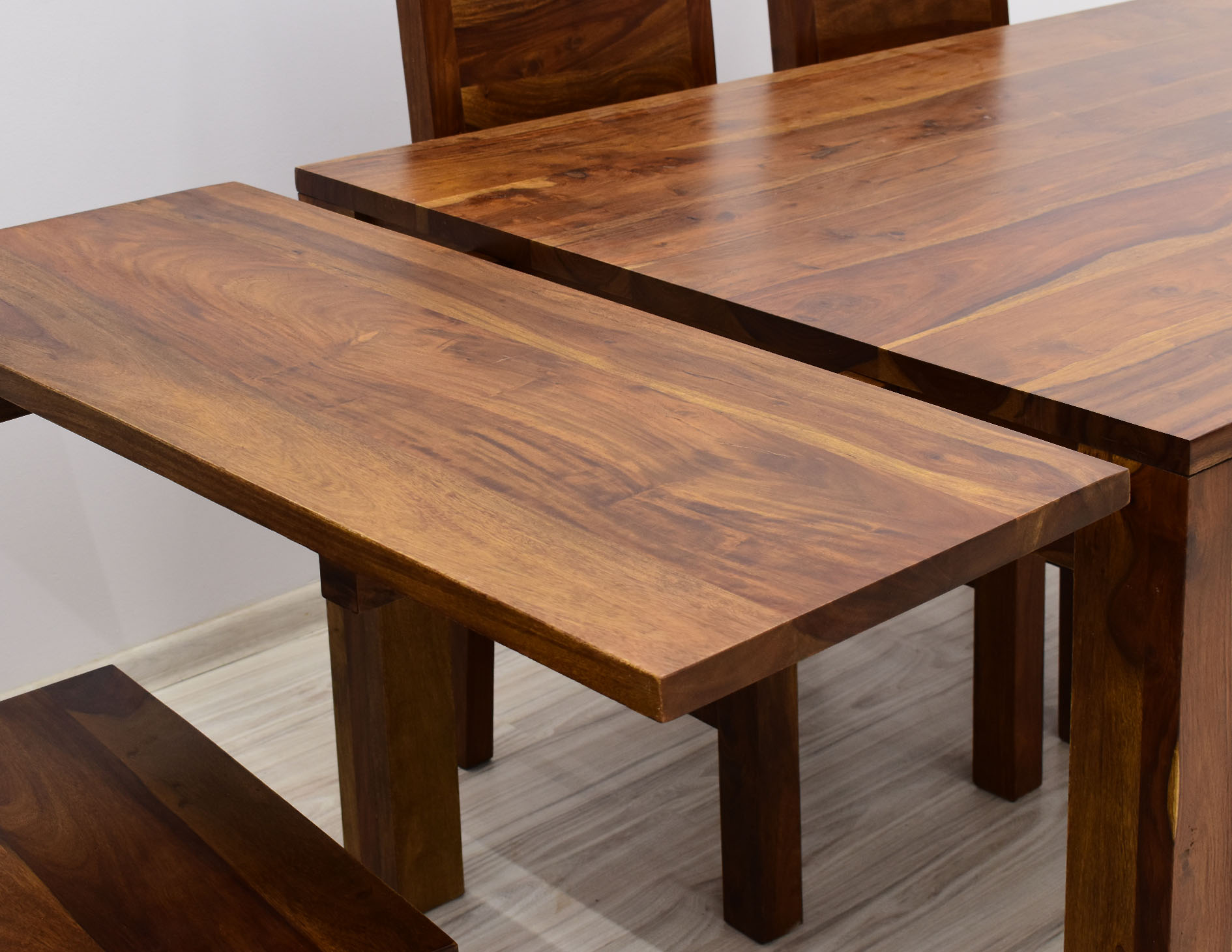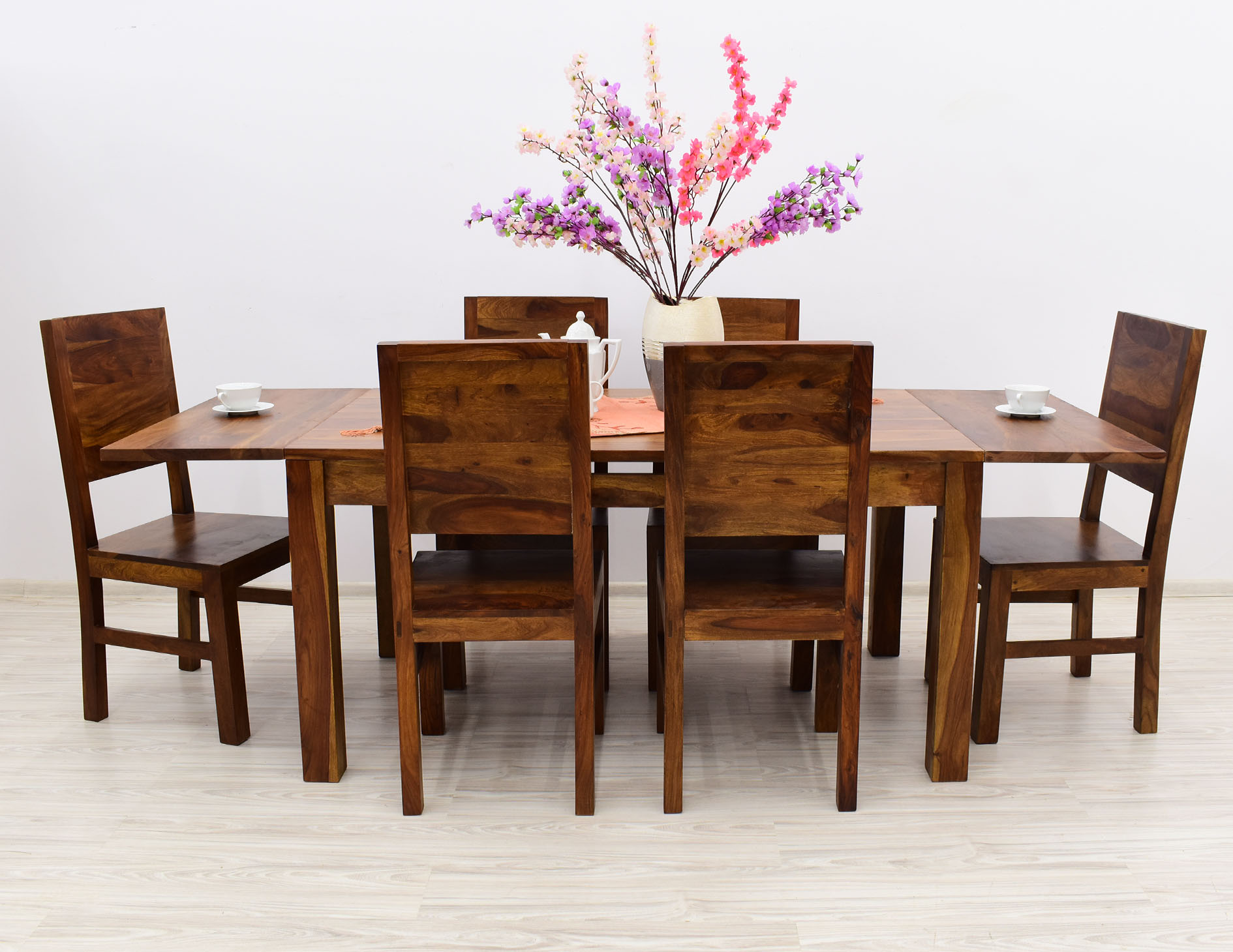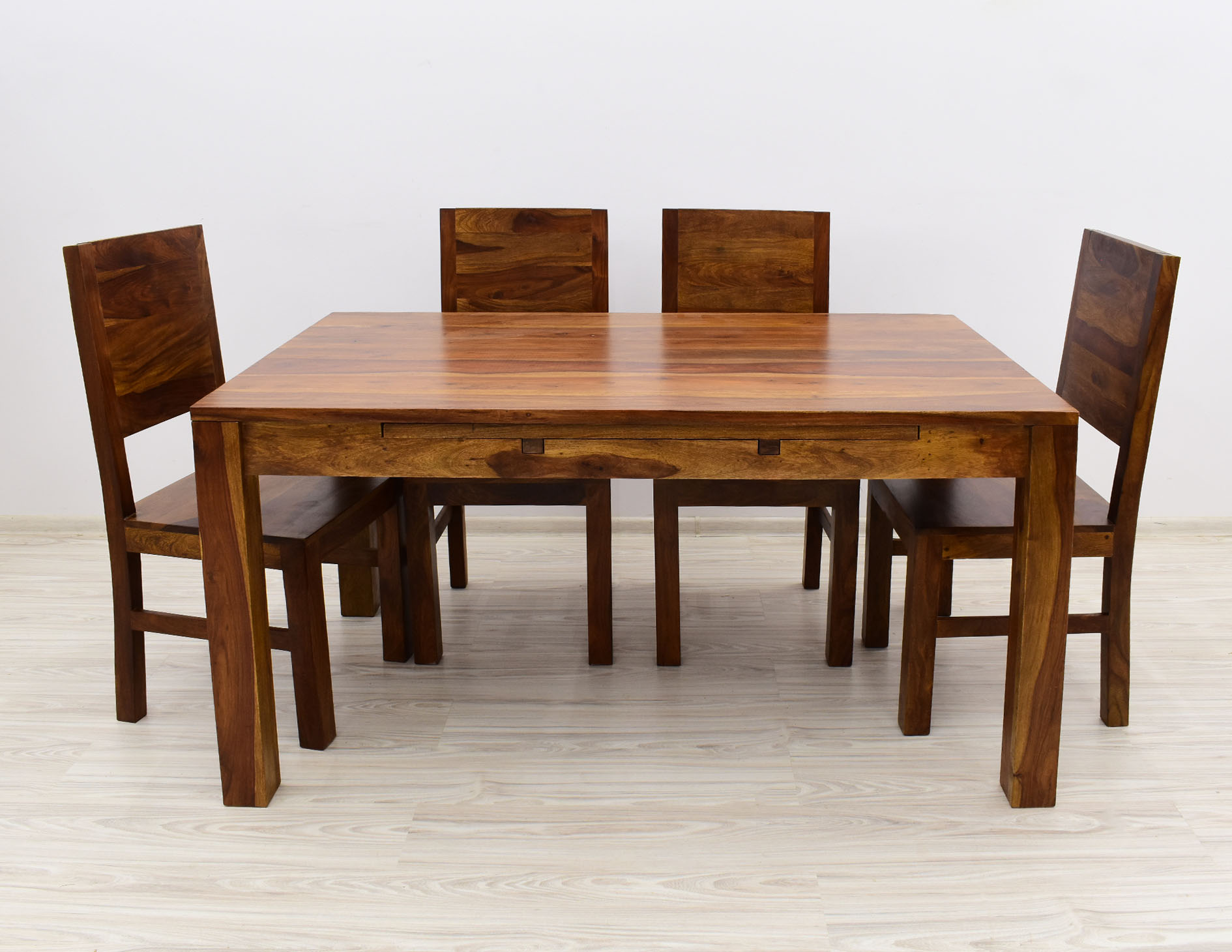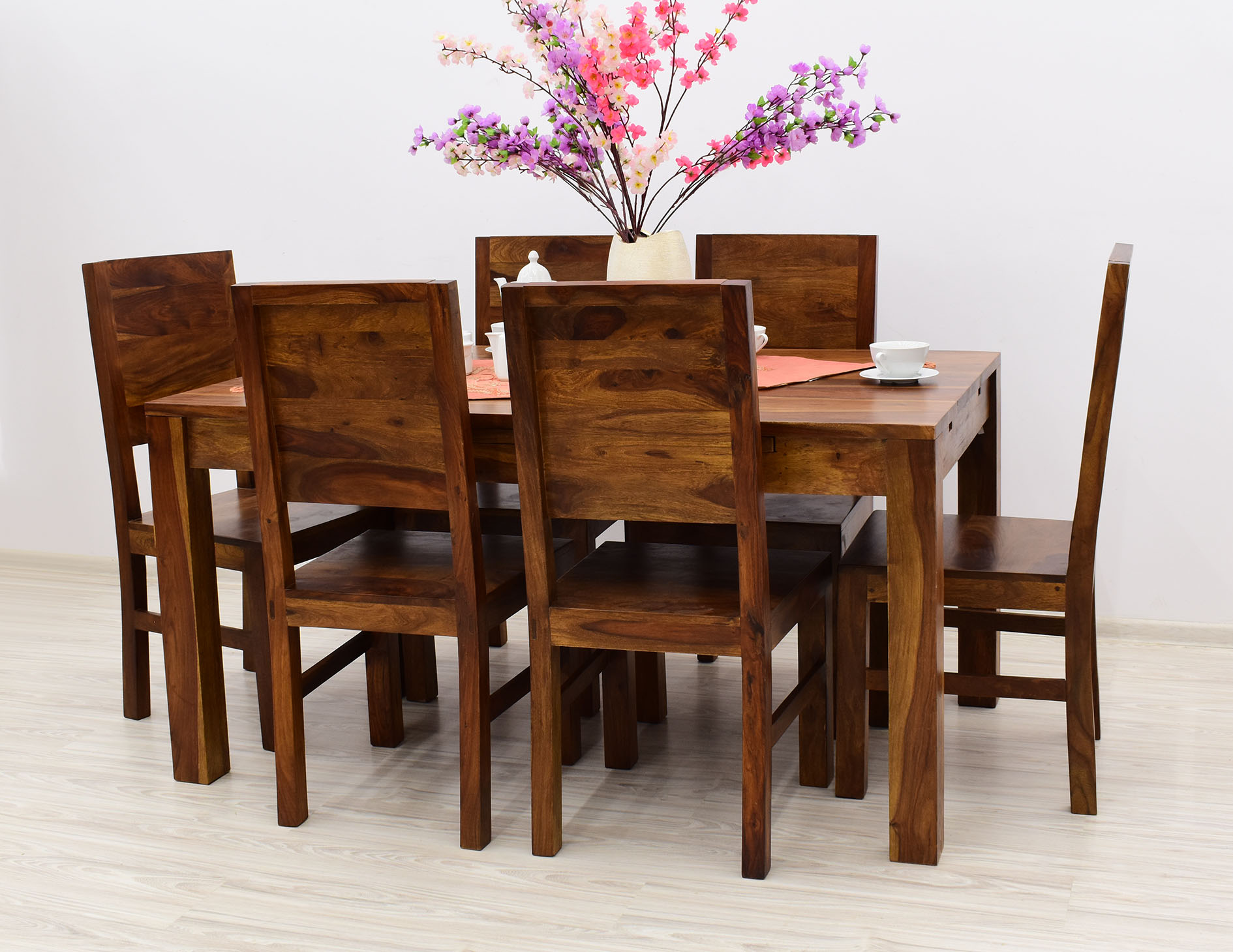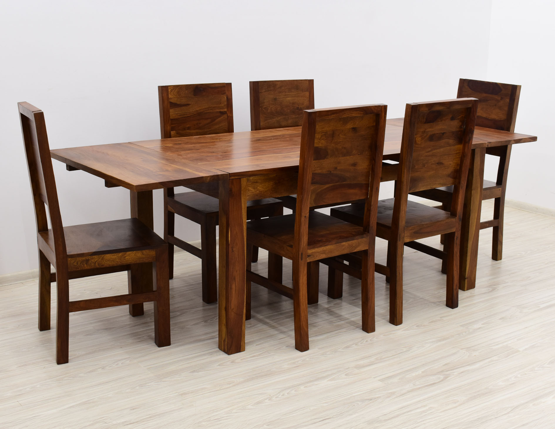 Komplet obiadowy, w skład którego wchodzi rozkładany ze 150/90/76 cm do 230/90/76 cm, masywny stół oraz sześć krzeseł. Całość wykonana w 100% z litego drewna palisandru indyjskiego, wybarwiona na jasny odcień brązu. Nieozdobione płaszczyzny mebli eksponują nieregularne, oleiste słoje drewna, a co za tym idzie wpisują ten zestaw w aranżację w nowoczesnym, surowym stylu.
