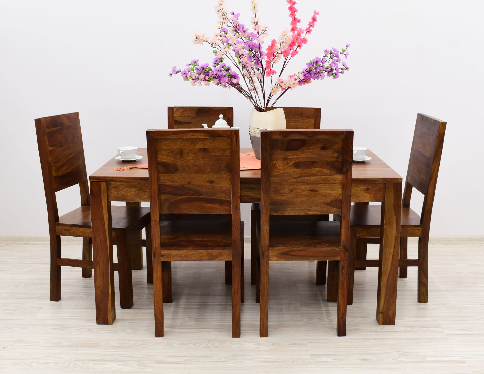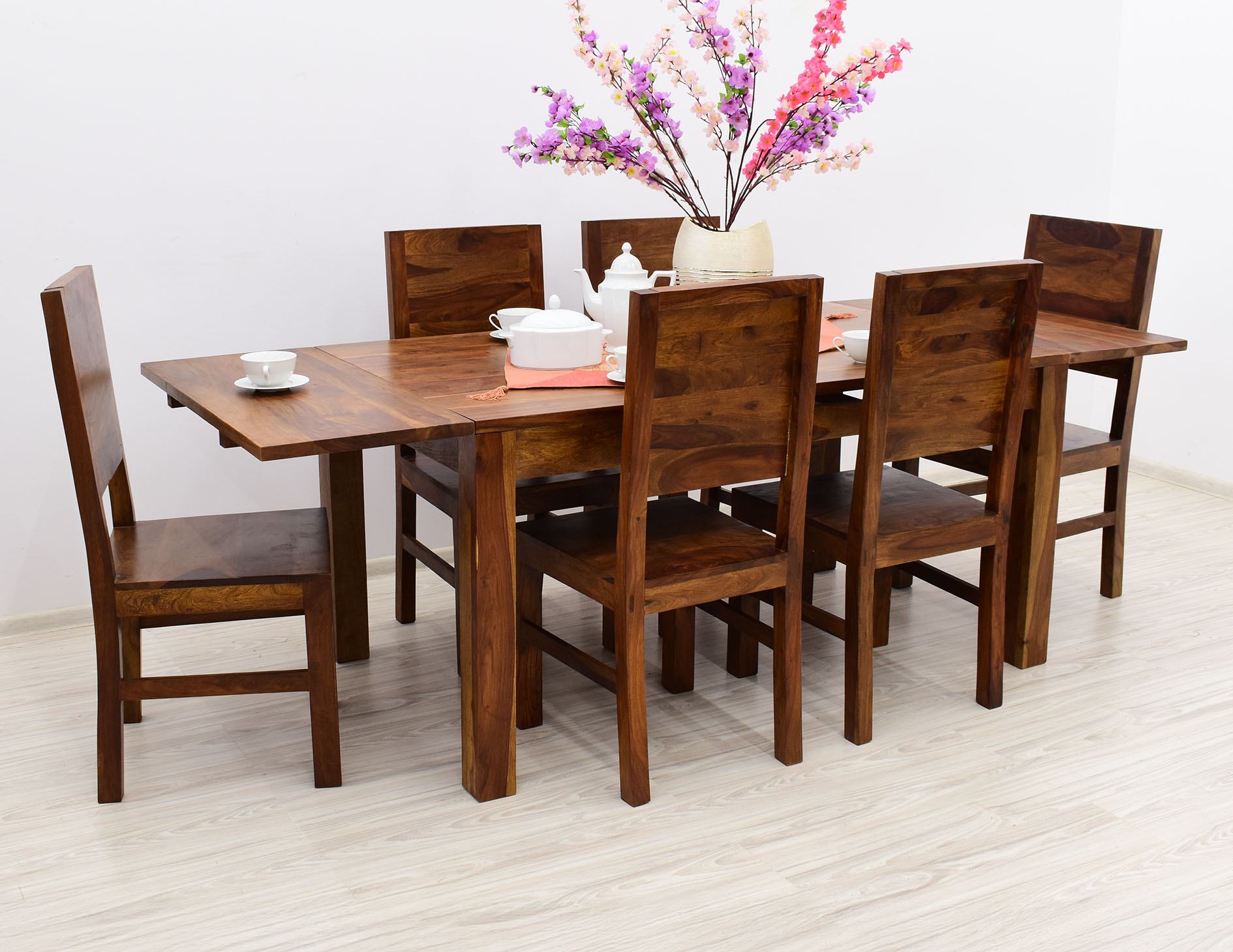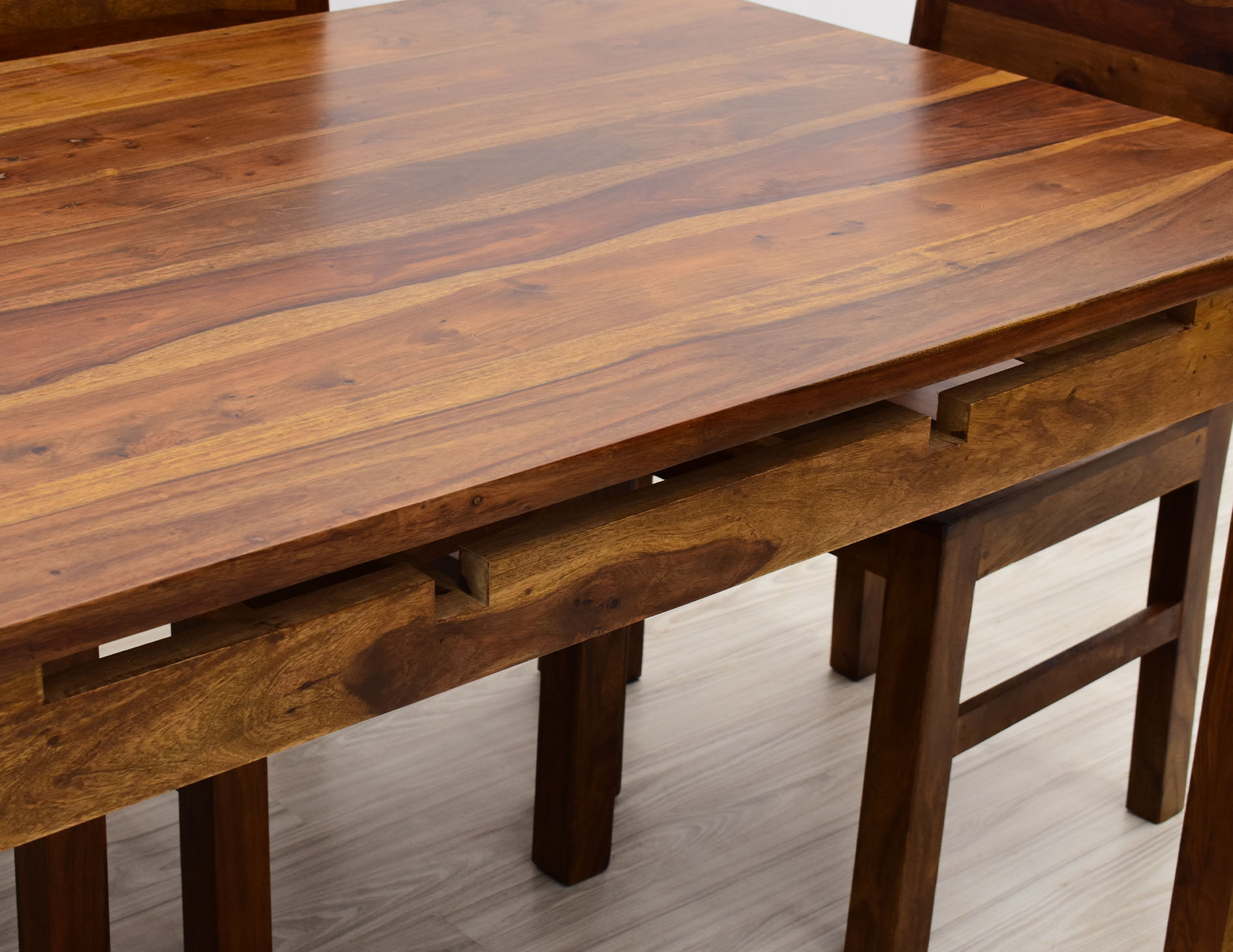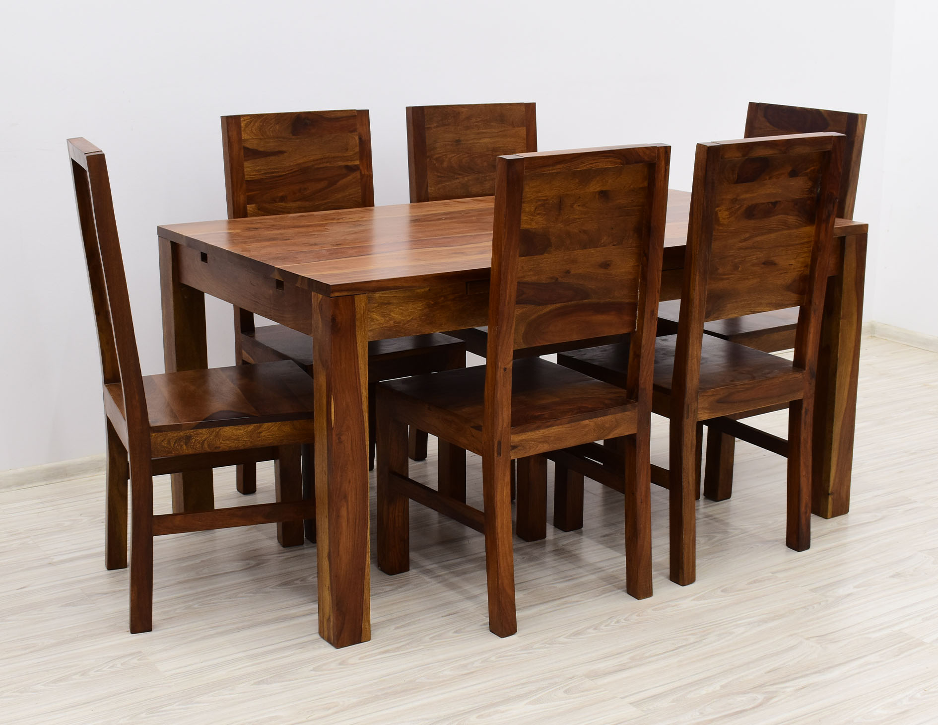 Komplet obiadowy, w skład którego wchodzi rozkładany ze 150/90/76 cm do 230/90/76 cm, masywny stół oraz sześć krzeseł. Całość wykonana w 100% z litego drewna palisandru indyjskiego, wybarwiona na jasny odcień brązu. Nieozdobione płaszczyzny mebli eksponują nieregularne, oleiste słoje drewna, a co za tym idzie wpisują ten zestaw w aranżację w nowoczesnym, surowym stylu.