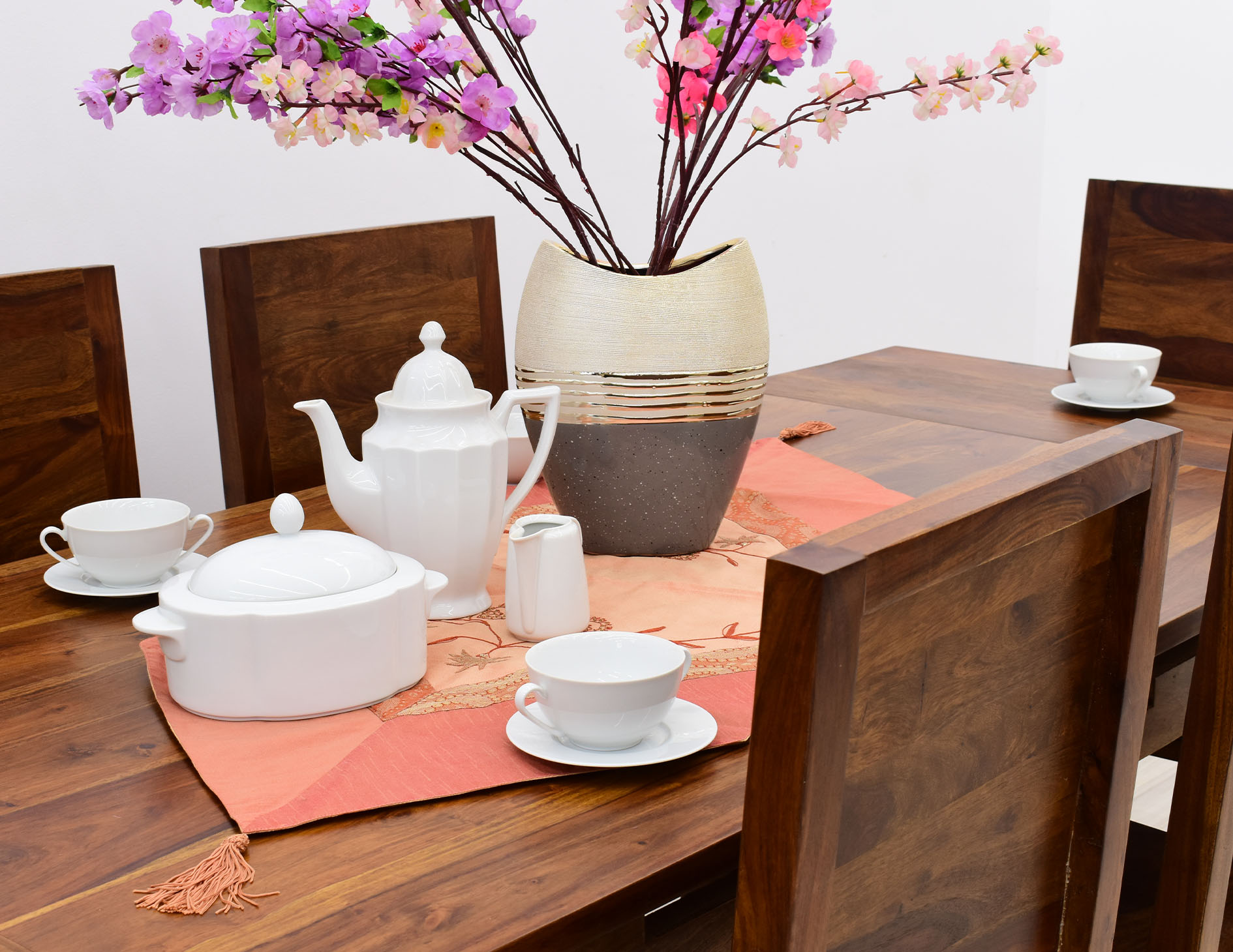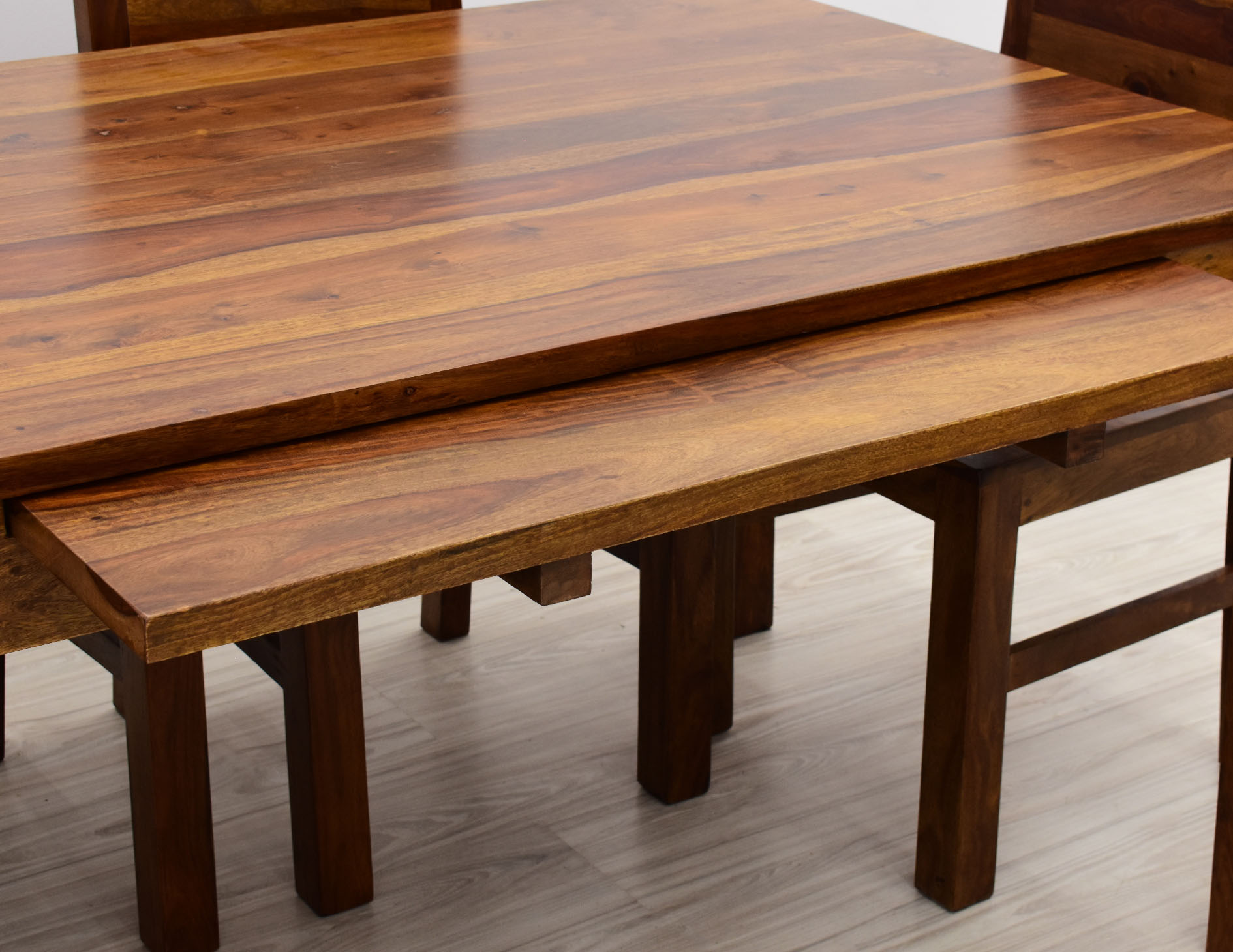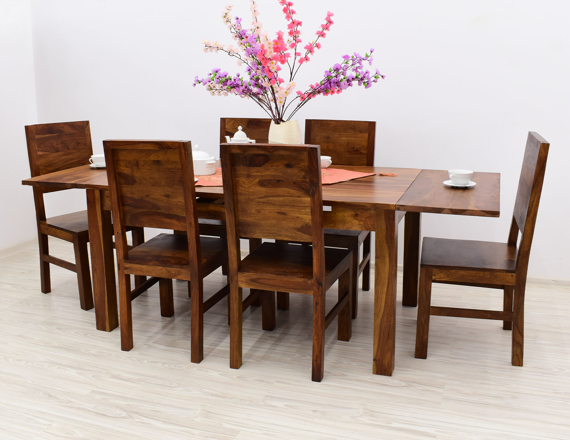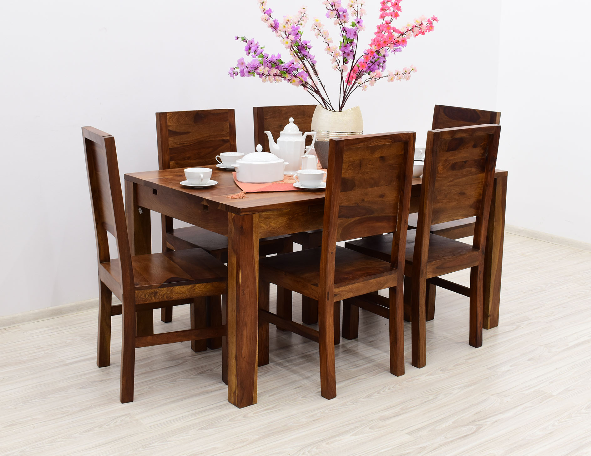 Komplet obiadowy, w skład którego wchodzi rozkładany ze 150/90/76 cm do 230/90/76 cm, masywny stół oraz sześć krzeseł. Całość wykonana w 100% z litego drewna palisandru indyjskiego, wybarwiona na jasny odcień brązu. Nieozdobione płaszczyzny mebli eksponują nieregularne, oleiste słoje drewna, a co za tym idzie wpisują ten zestaw w aranżację w nowoczesnym, surowym stylu.