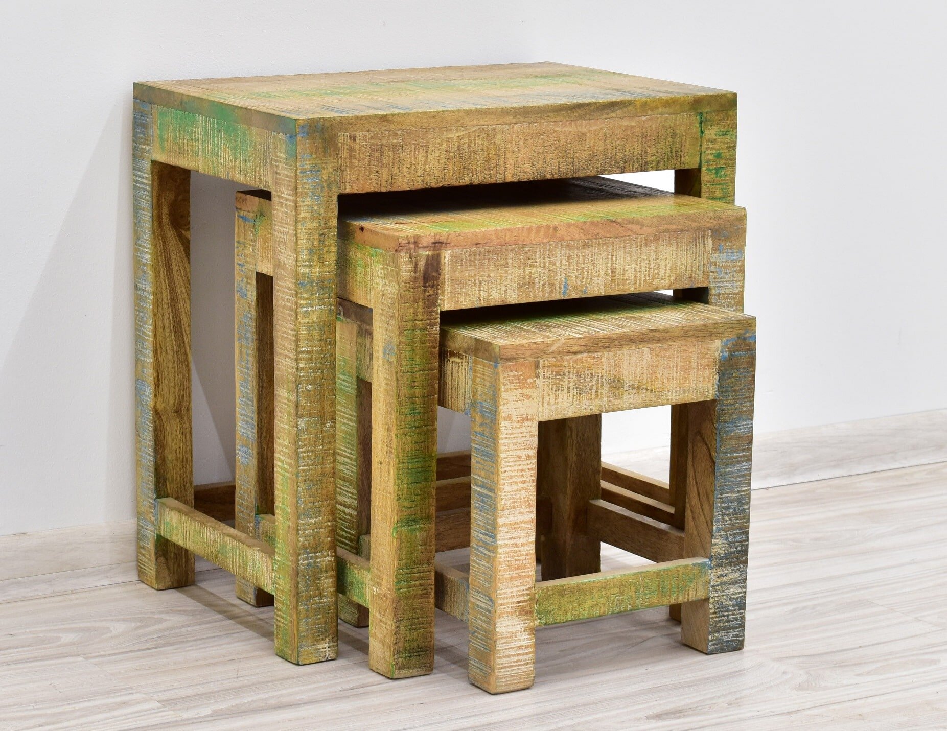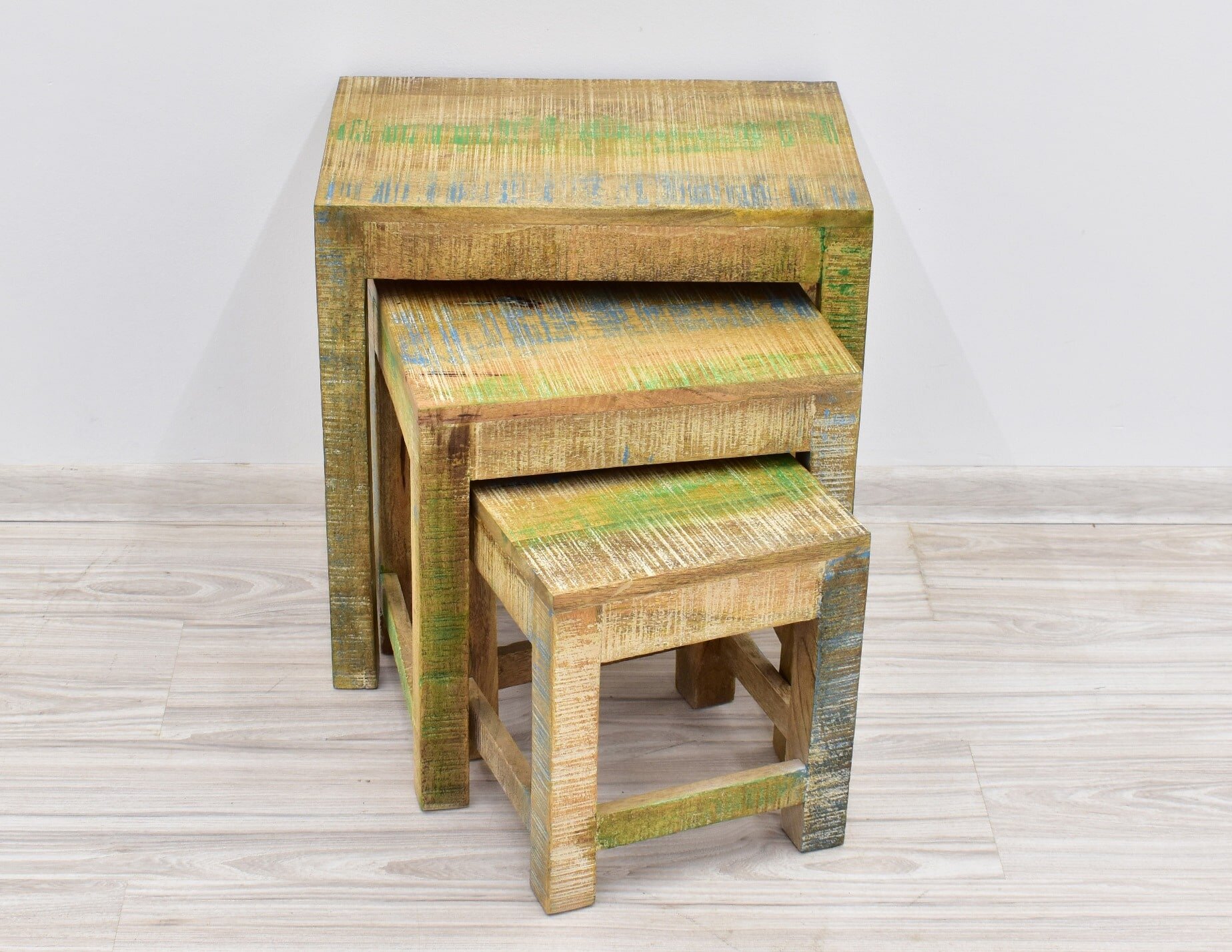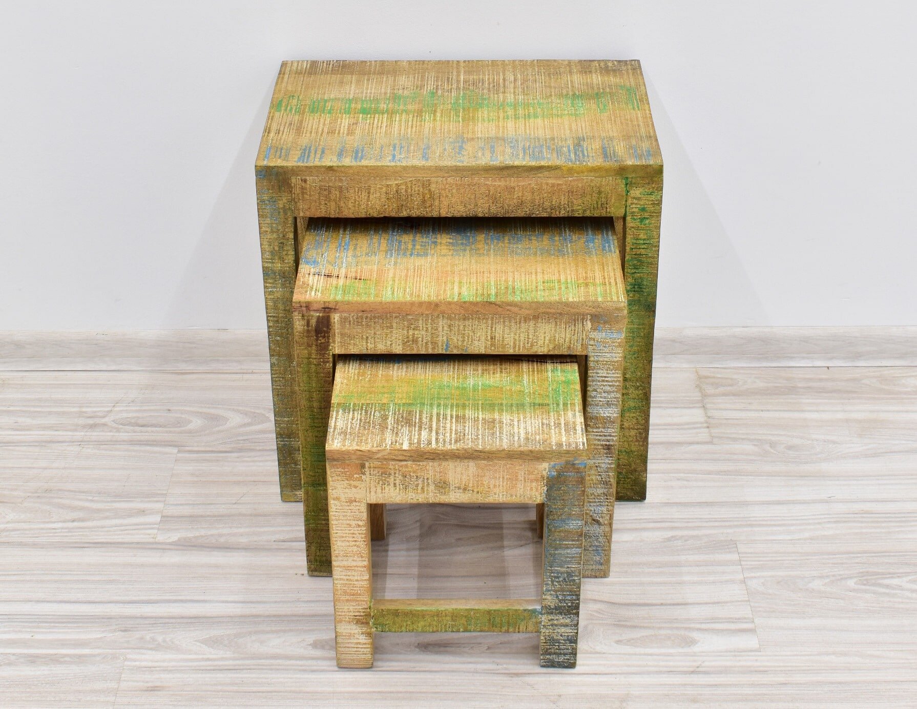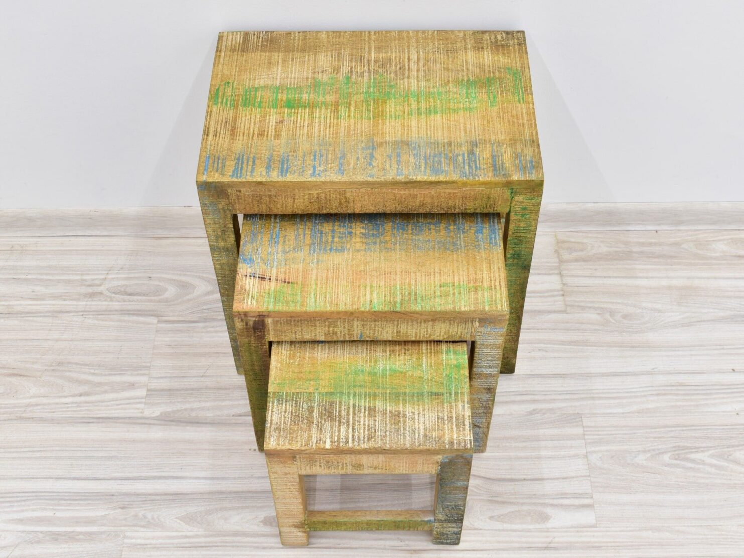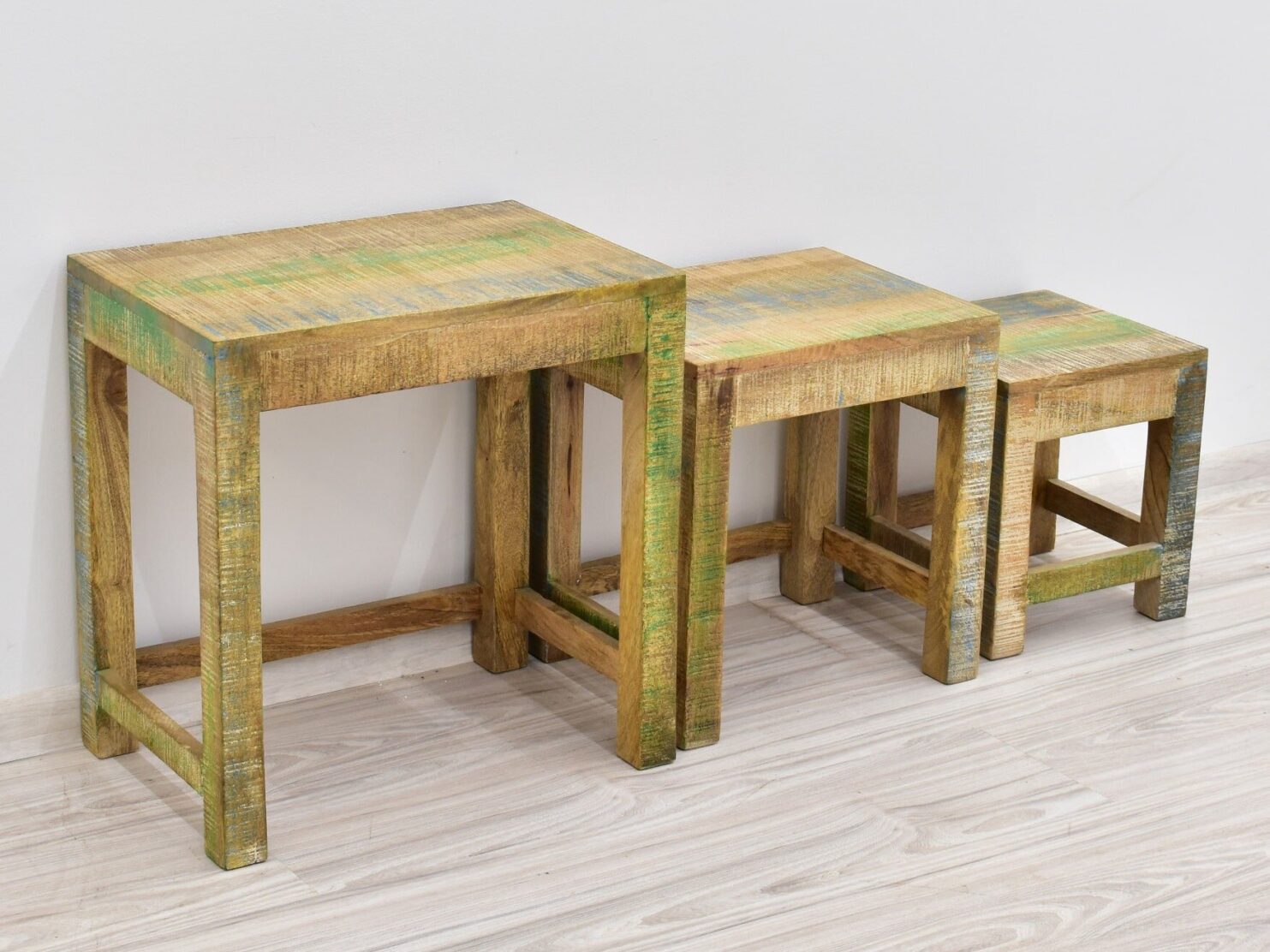 Komplet stylowych taboretów kolonialnych z pastelowymi. W skład zestawu wchodzi najmniejszy taboret w rozmiarze 27x27x30cm, średni o rozmiarach 37x30x38 cm i największy z nich 46x31x45 cm. Wszystkie elementy zestawu są wykonane w 100% z litego drewna mango.