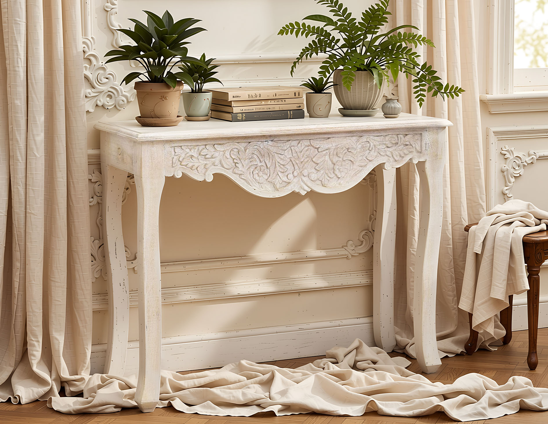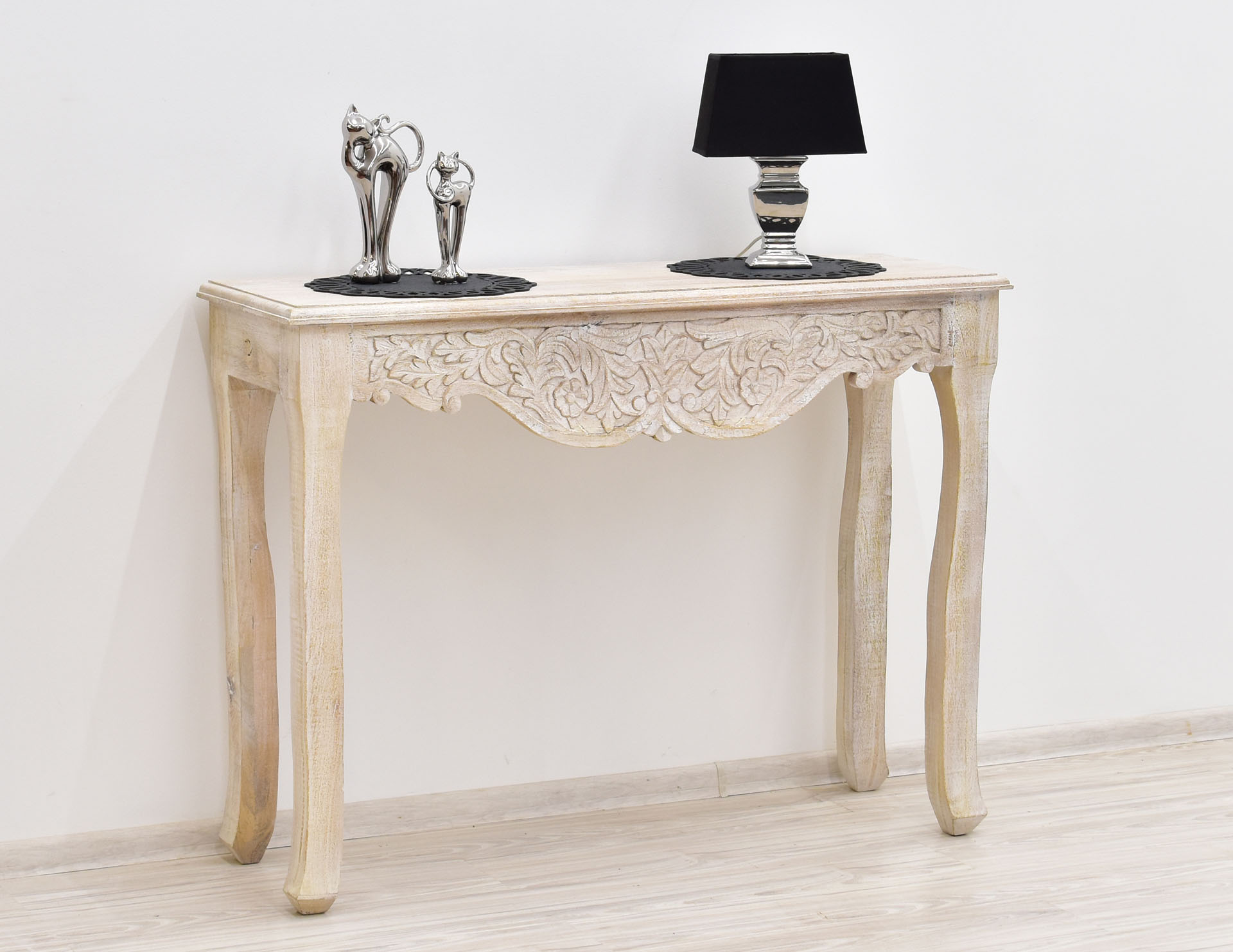 Indyjska konsola kolonialna wykonana ręcznie w jednej z naszych manufaktur. Mebel bardzo stylowy, wykończony pięknym misternym rzeźbieniem na froncie. Całość przecierana, bielona.