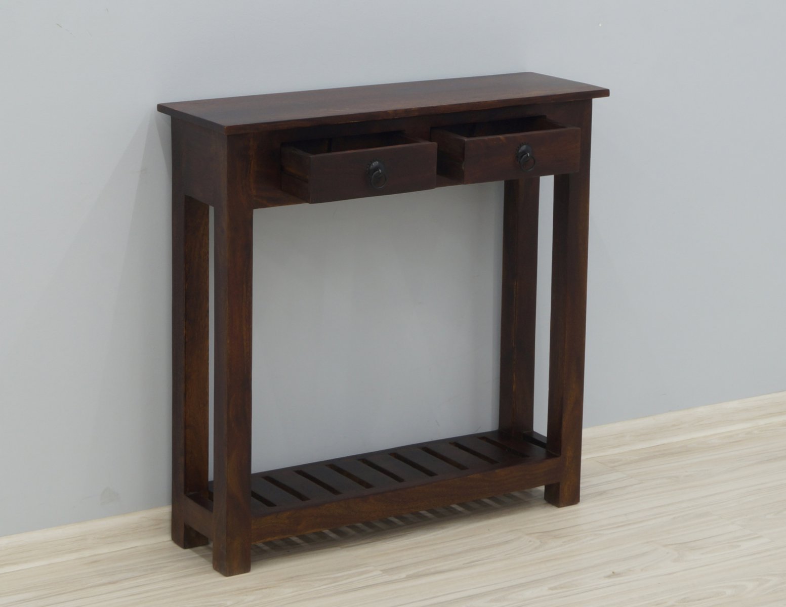 Konsola kolonialna wykonana z palisandru indyjskiego inaczej zwanego drzewem różanym. Jest to w 100% lite drewno. Podręczne dwie szufladki oraz półeczka stanowią funkcjonalny, niepozorny mebel, który odnajdzie się tuż pod lustrem w sypialni lub w przedpokoju. Mebel wykonany z niezwykle trwałego drewna, wybarwiony na ciemny odcień brązu.