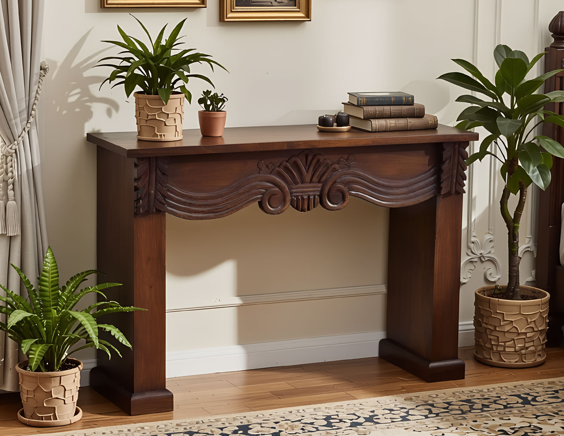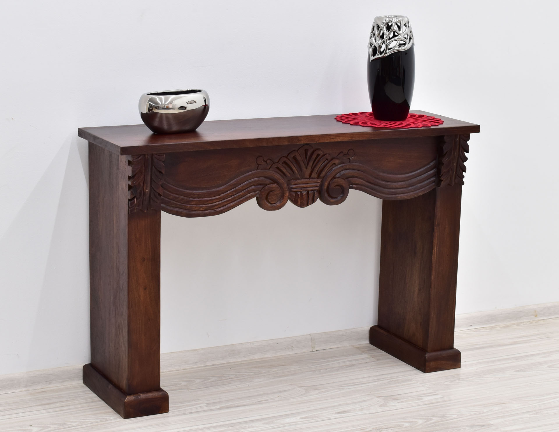Masywna konsola stworzona w 100% z litego palisandru indyjskiego. Posiada solidne nogi oraz stylowe rzeźbienia na froncie, umieszczone tuż pod blatem. Mebel wybarwiono na ciemny odcień brązu.