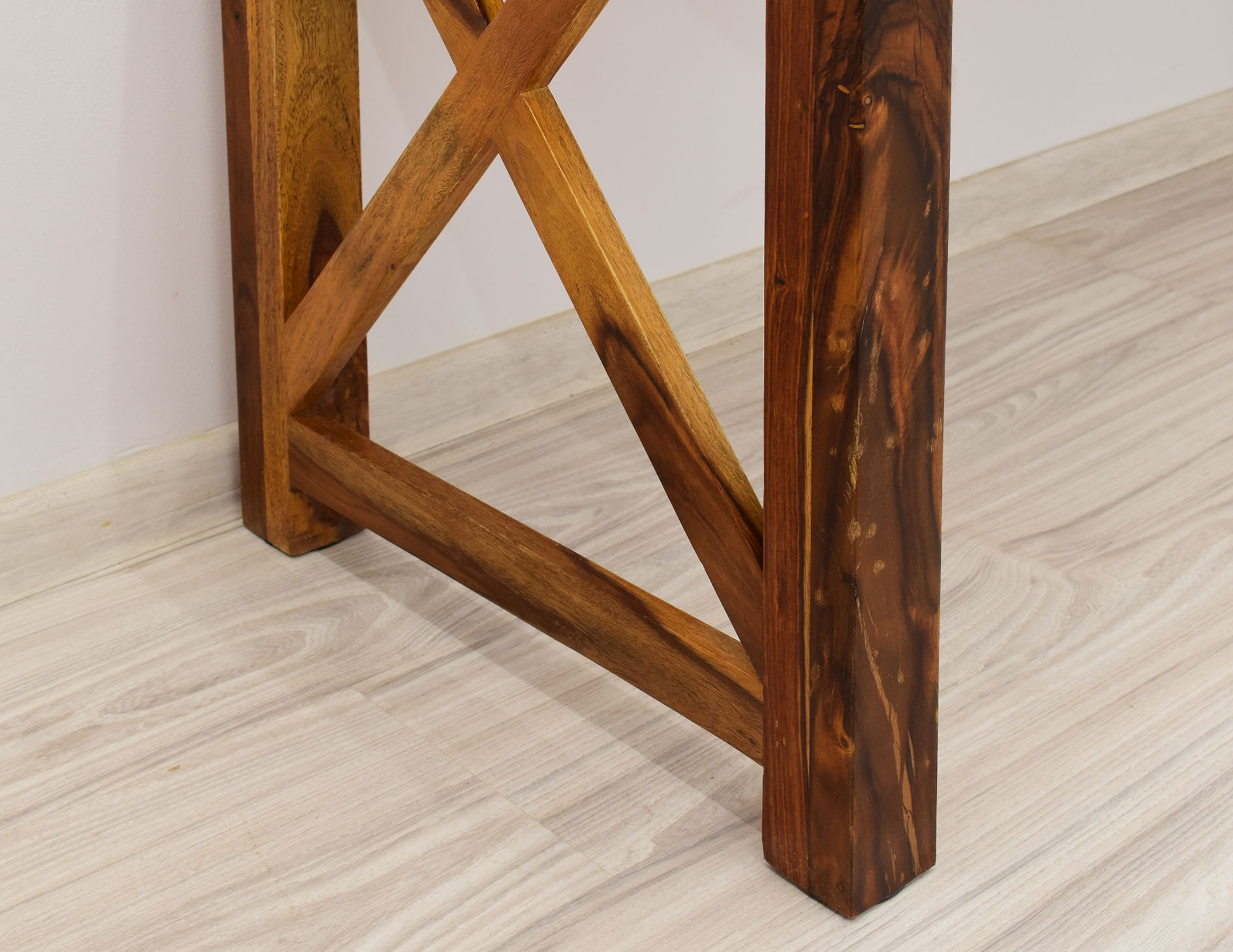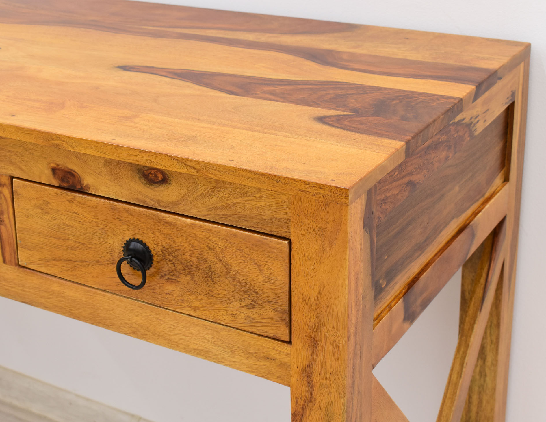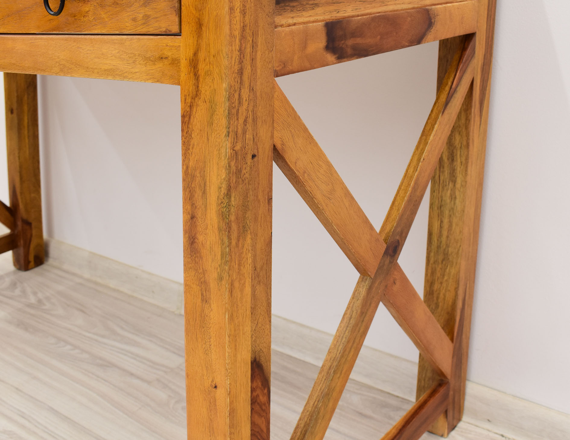 Konsola kolonialna w bardzo wyszukanej formie. Posiada trzy podręczne szufladki wyposażone w delikatne uchwyty. Boki mebla zdobione w ciekawy ażurowy, drewniany motyw. Stworzona nie tylko z myślą o przedpokoju lub sypialnianych aranżacjach. Z powodzeniem może odegrać rolę biurka czy sekretarzyka. Konsola indyjska jest wykonana w 100% z litego drewna palisandru indyjskiego.