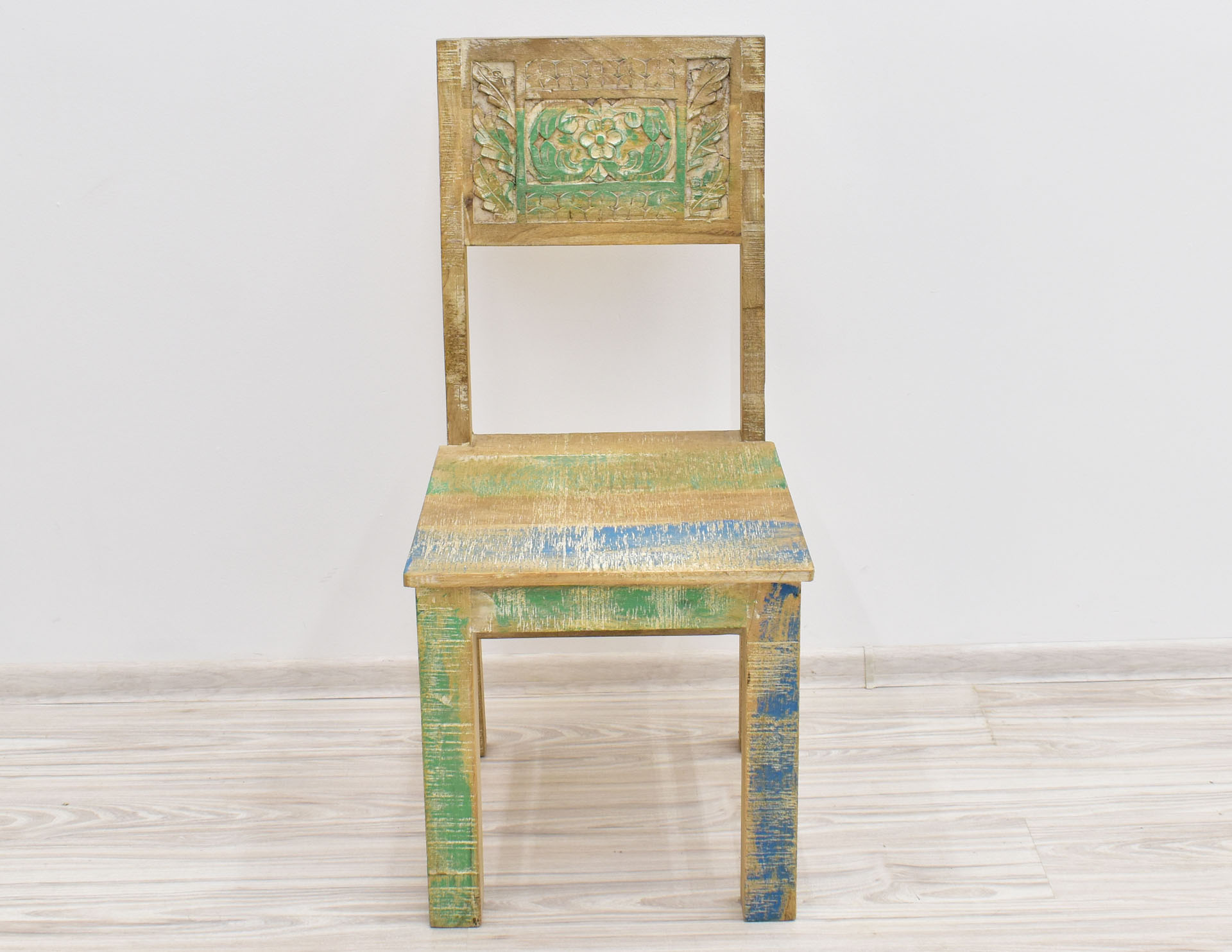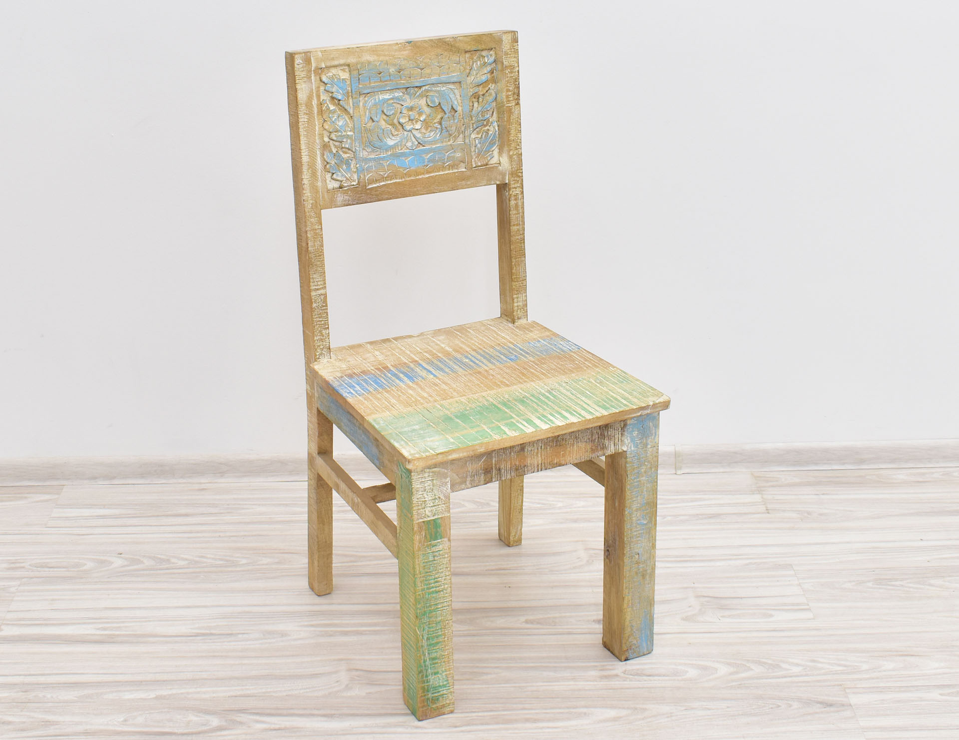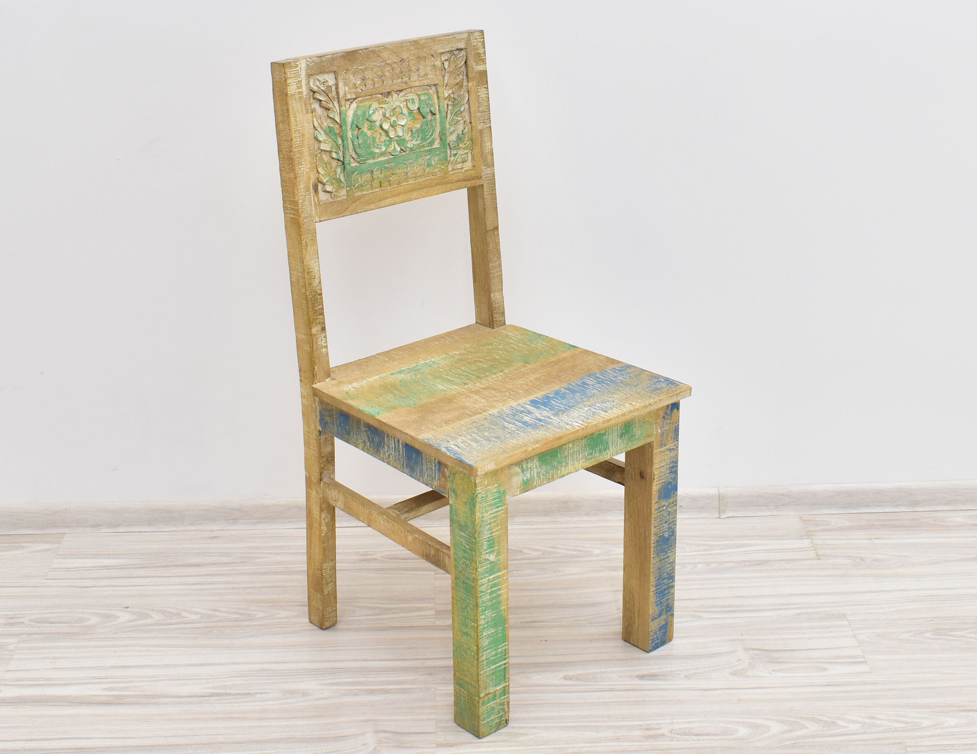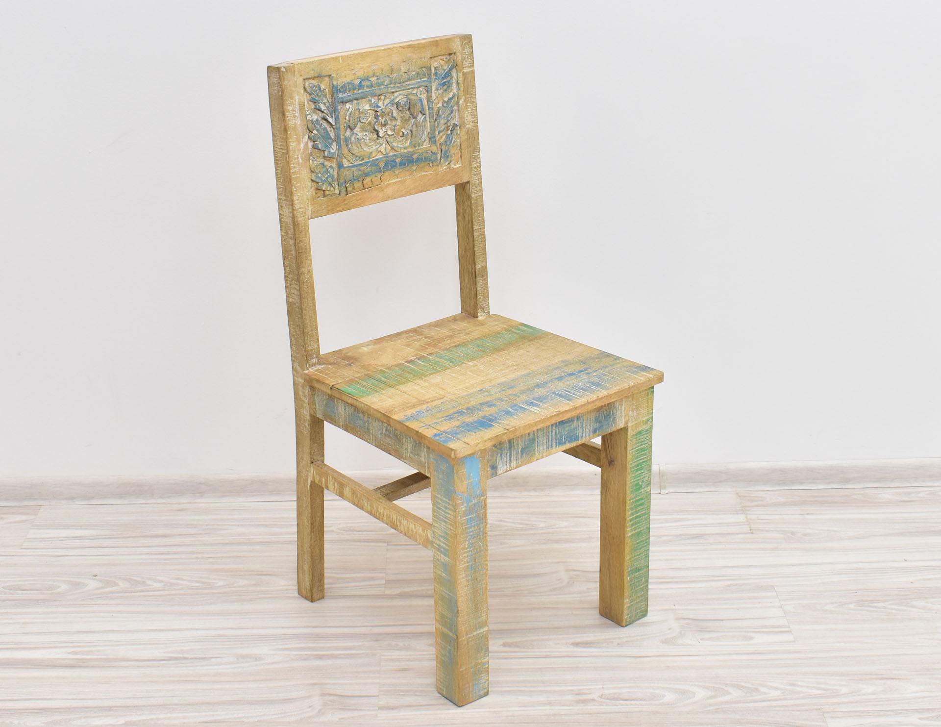 Krzesło stworzone w Indiach z litego drewna mango. Zostało wybarwione w pastelowych kolorach, a następnie przetarte w stylu Shabby Chic. Posiada pełne oparcie, na którym wyrzeźbiono ręcznie wzory przypominające motywy roślinne. Krzesła są sprzedawane w ilościach parzystych.