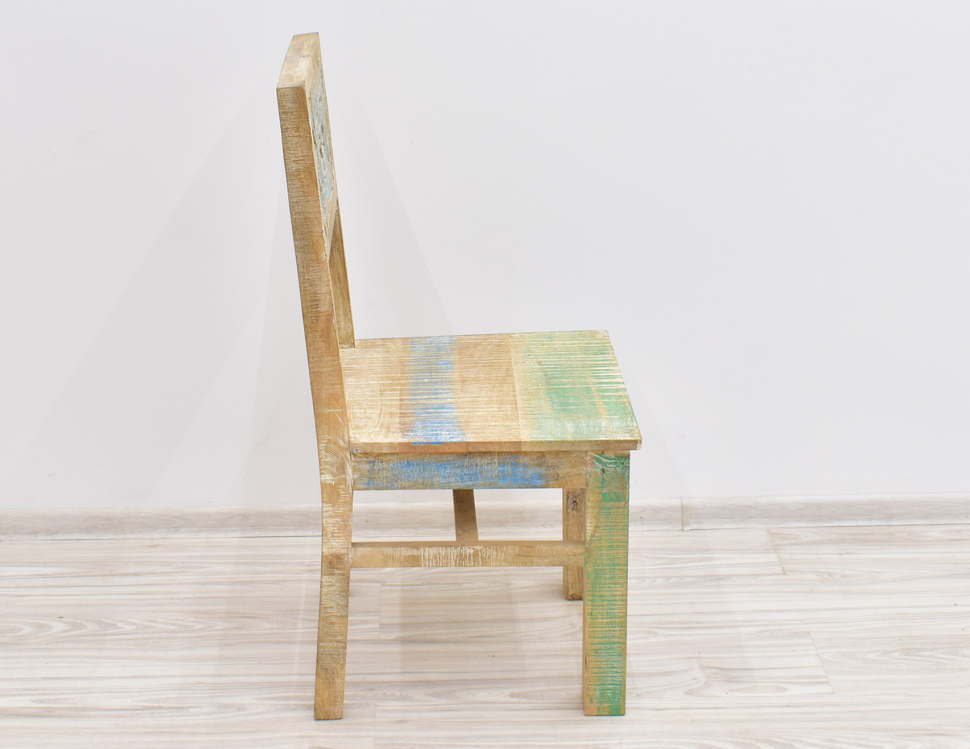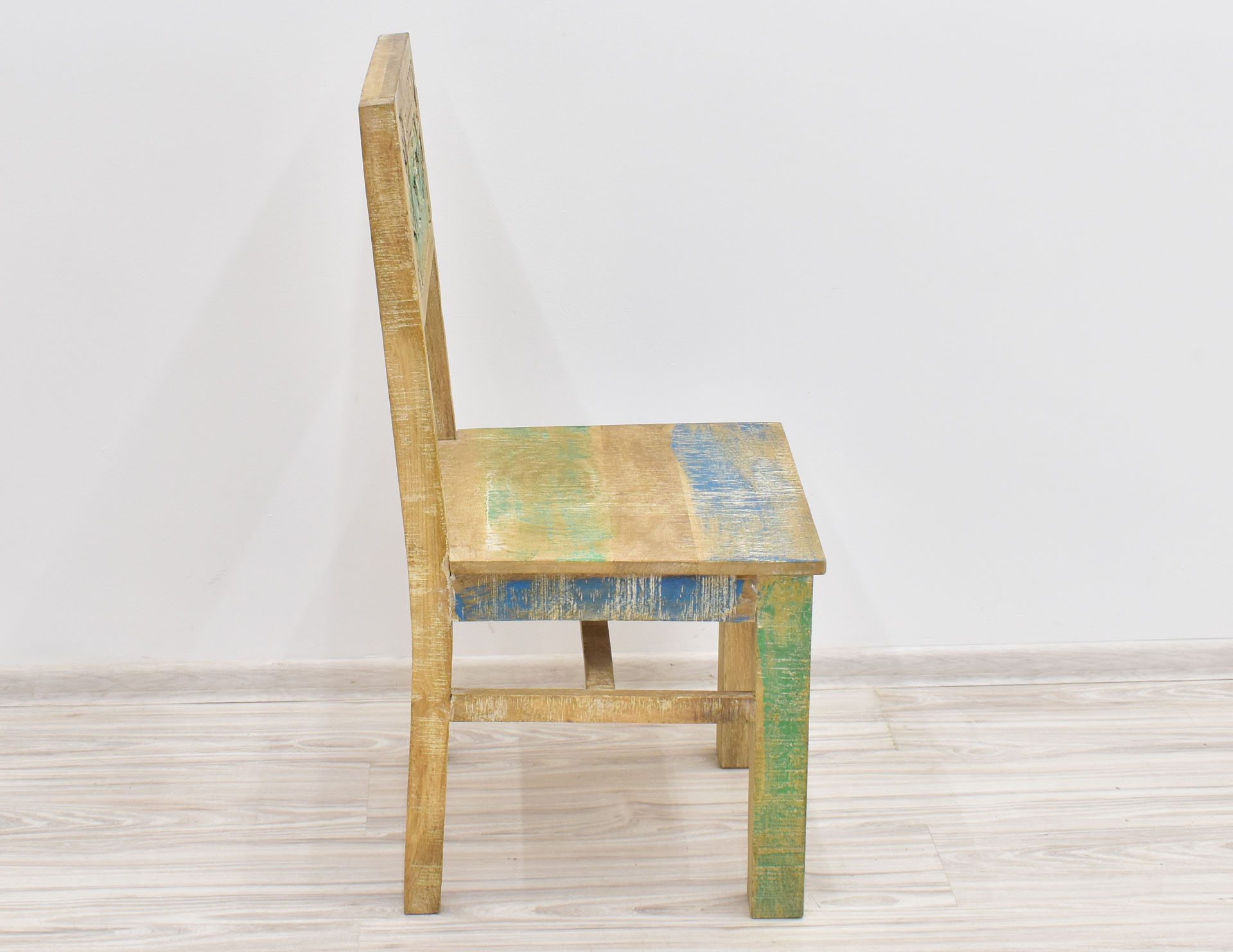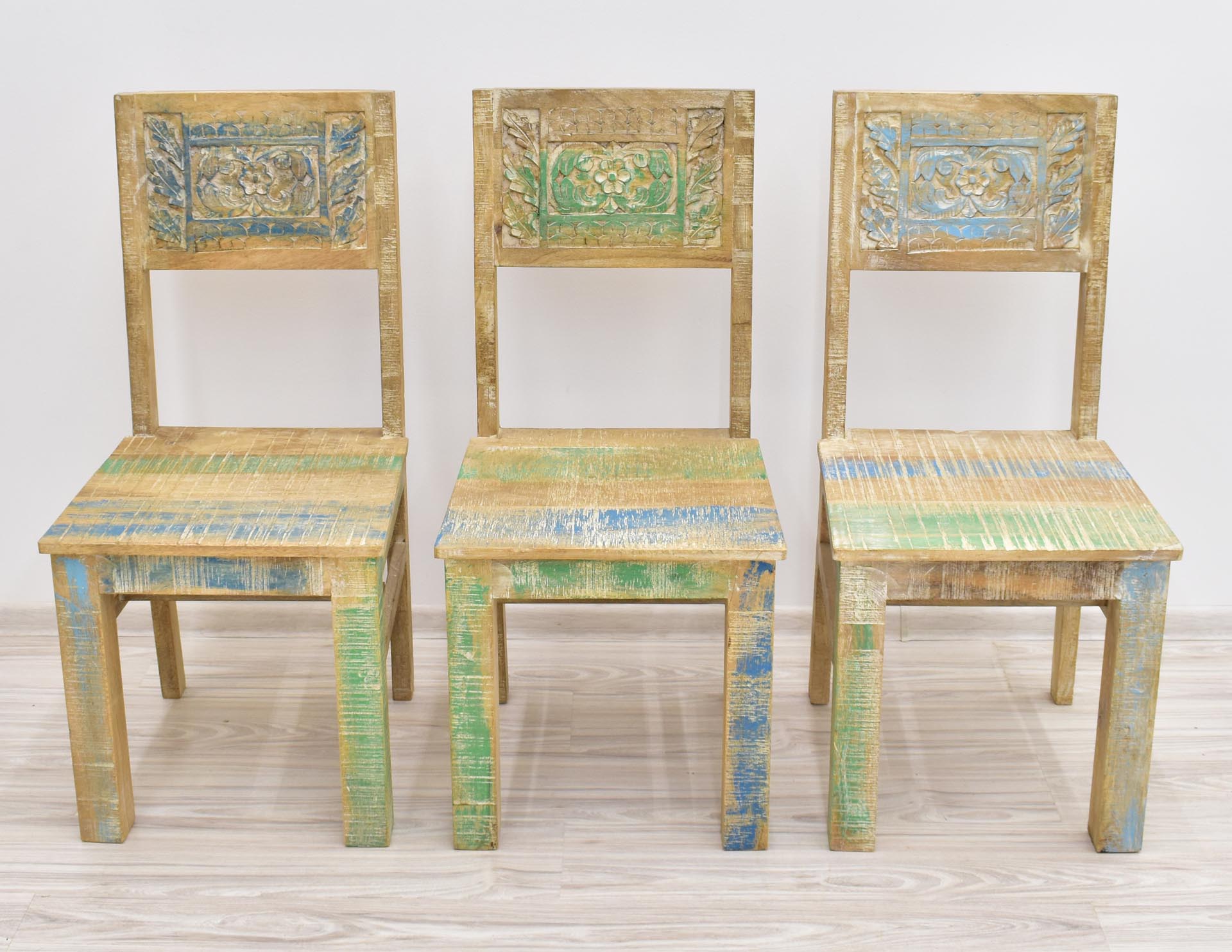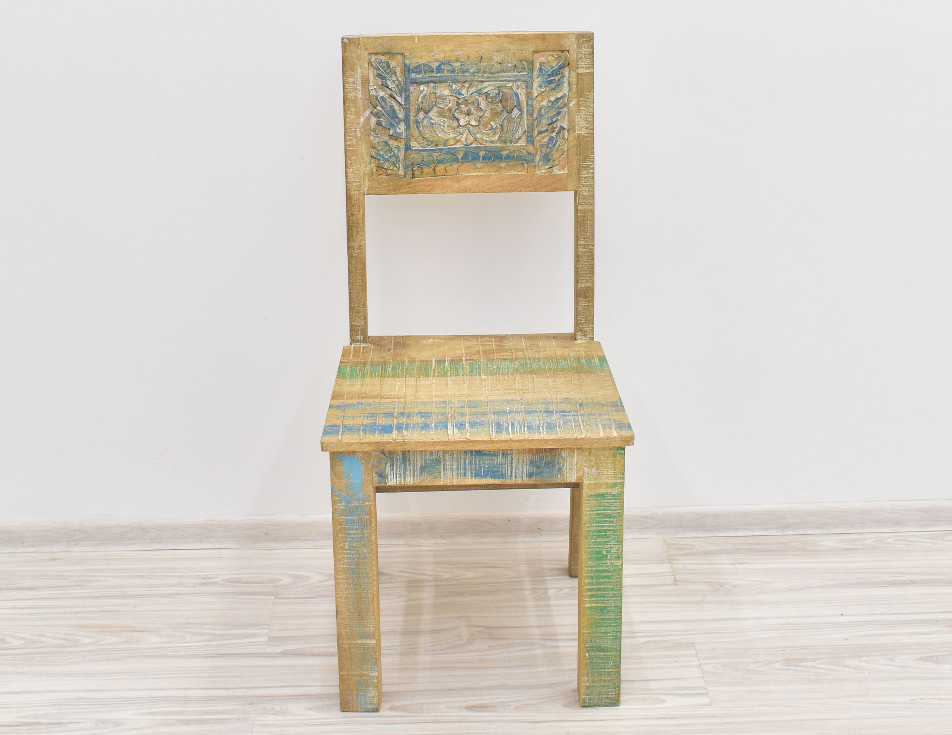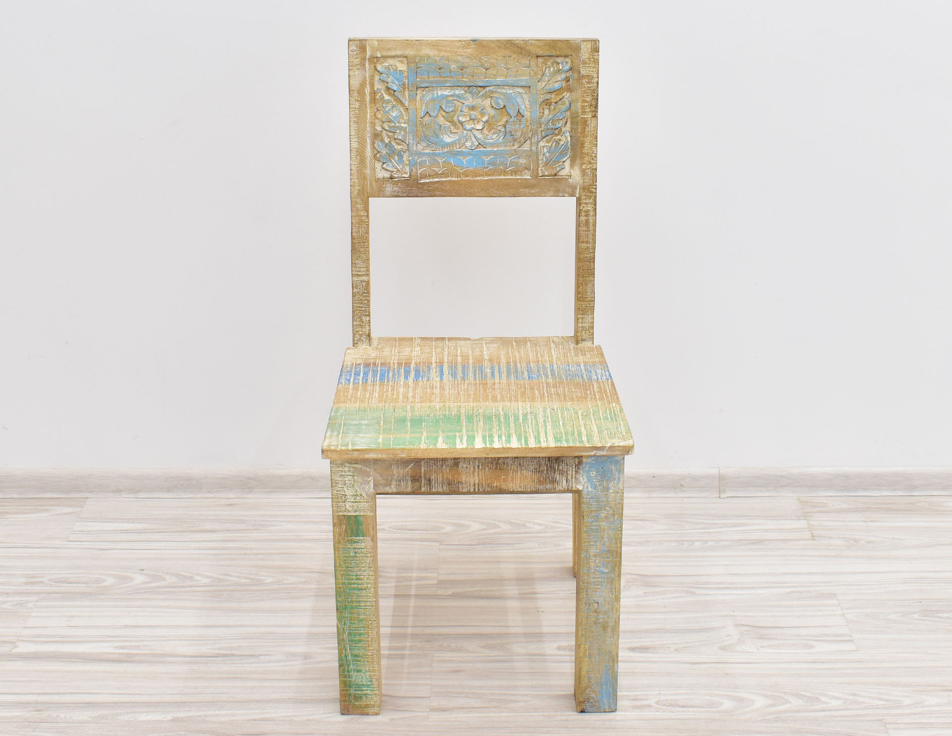 Krzesło stworzone w Indiach z litego drewna mango. Zostało wybarwione w pastelowych kolorach, a następnie przetarte w stylu Shabby Chic. Posiada pełne oparcie, na którym wyrzeźbiono ręcznie wzory przypominające motywy roślinne. Krzesła są sprzedawane w ilościach parzystych.