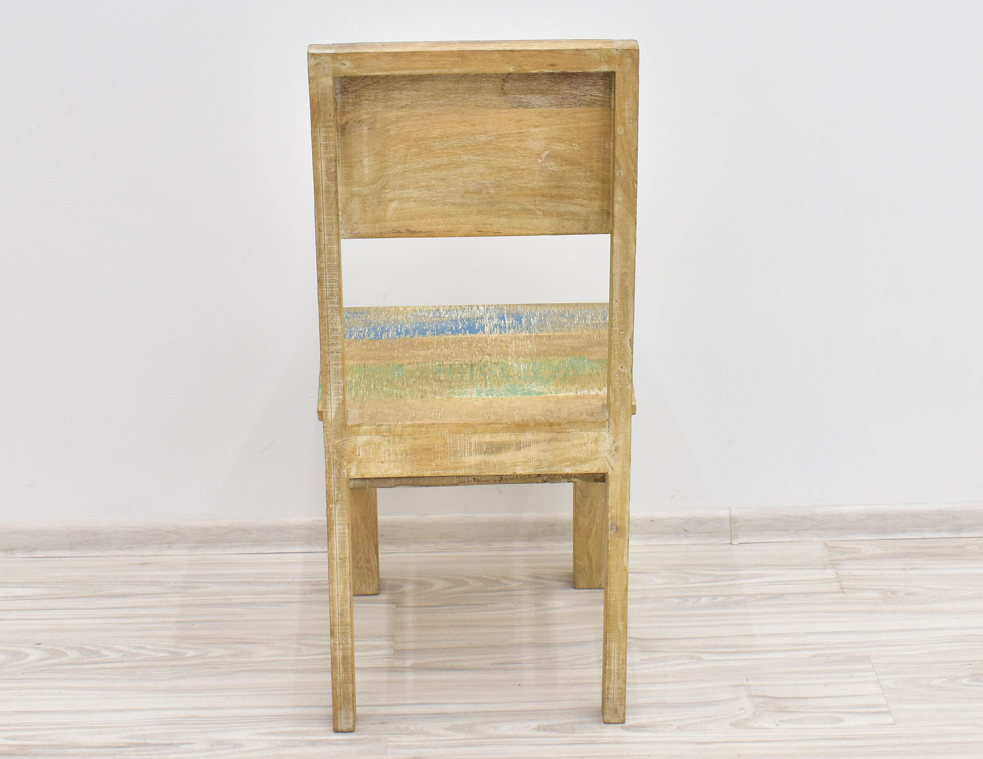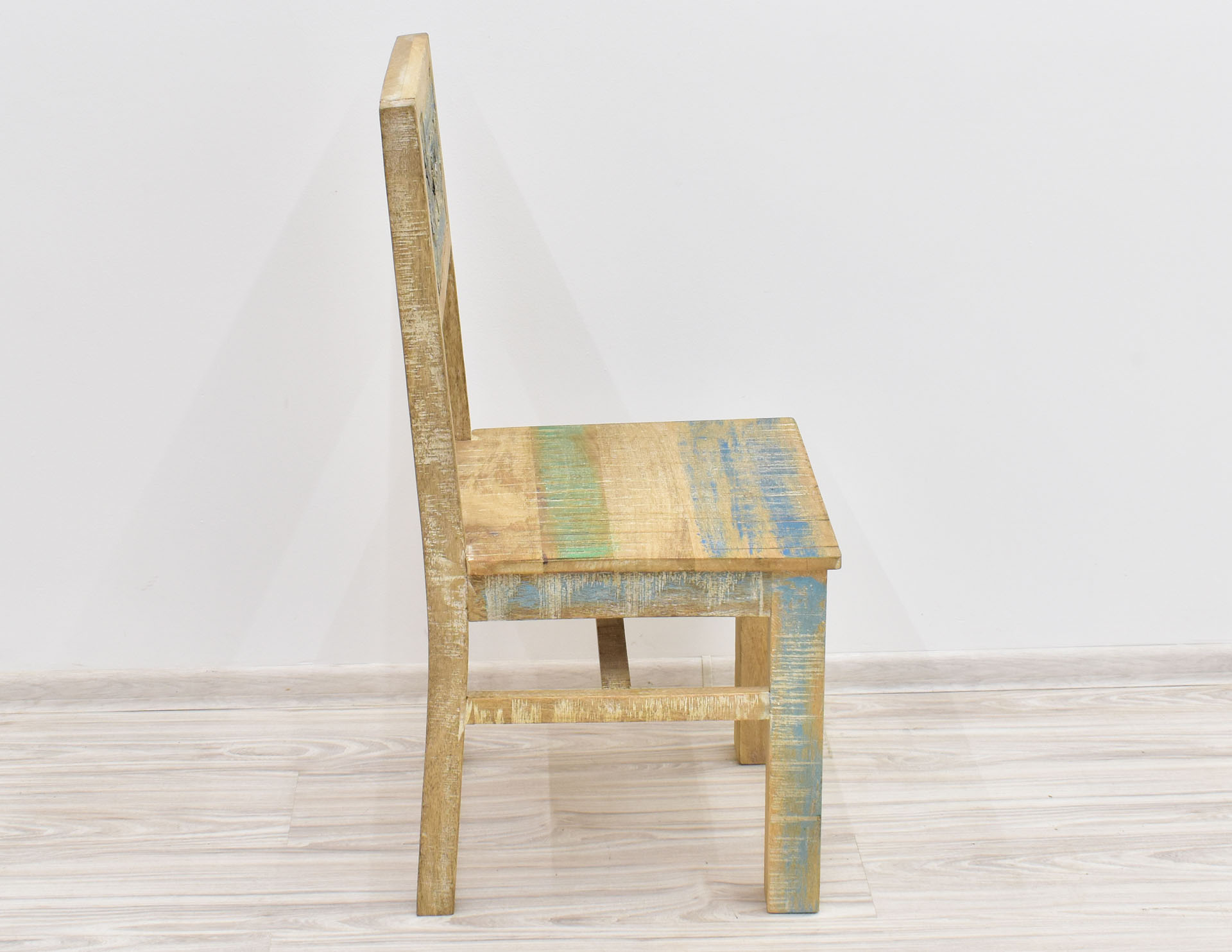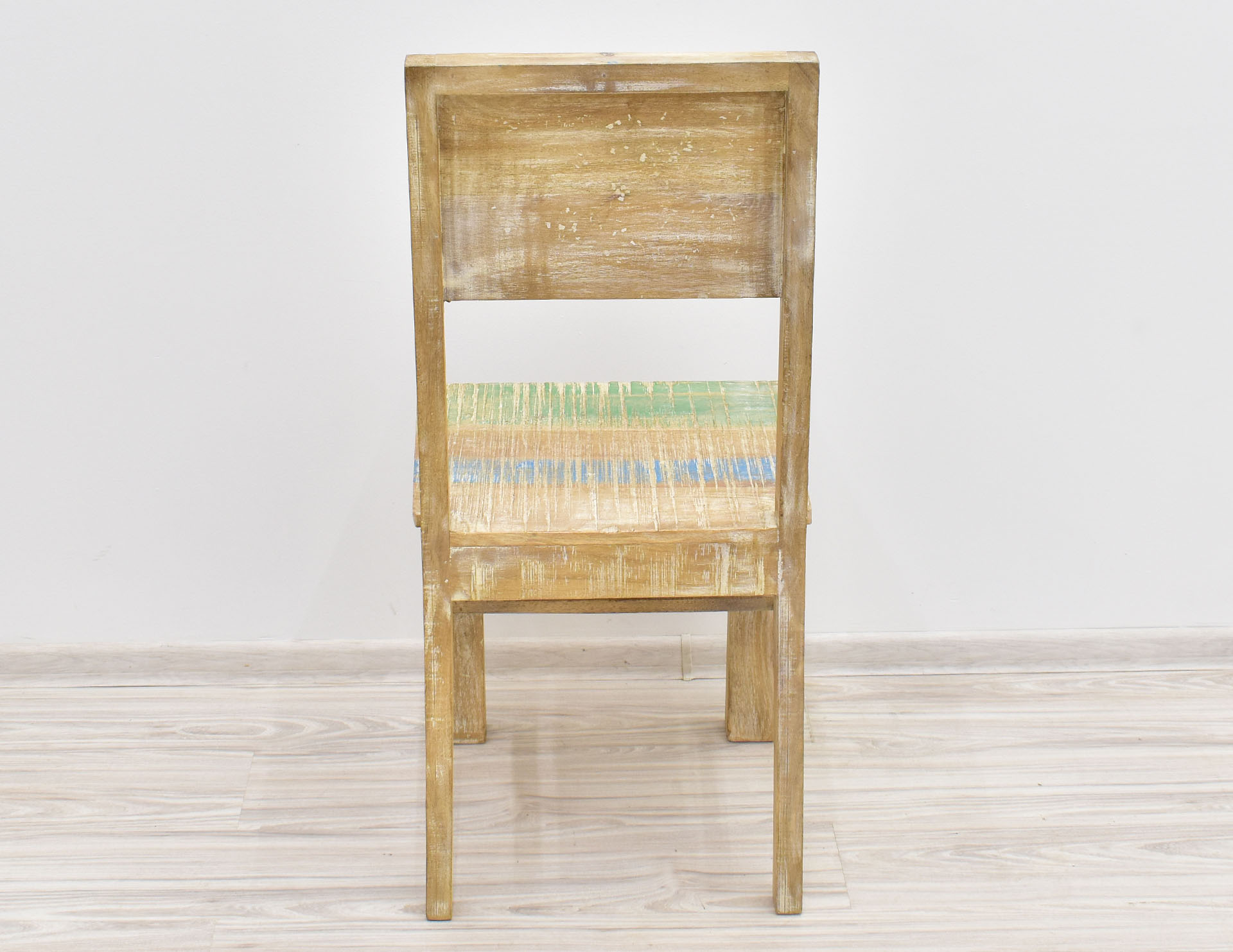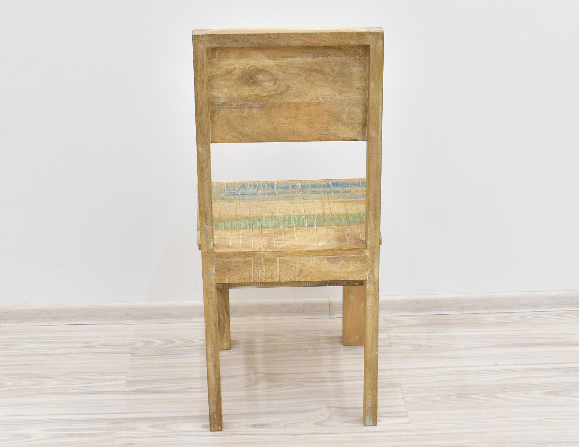 Krzesło stworzone w Indiach z litego drewna mango. Zostało wybarwione w pastelowych kolorach, a następnie przetarte w stylu Shabby Chic. Posiada pełne oparcie, na którym wyrzeźbiono ręcznie wzory przypominające motywy roślinne. Krzesła są sprzedawane w ilościach parzystych.