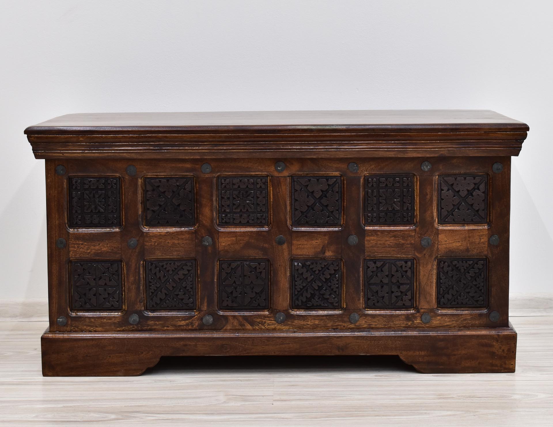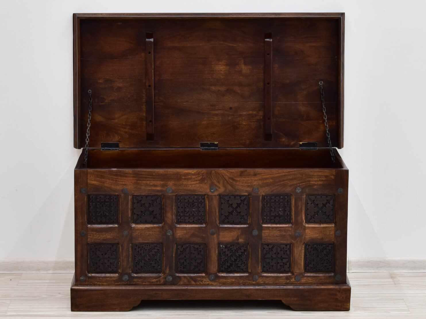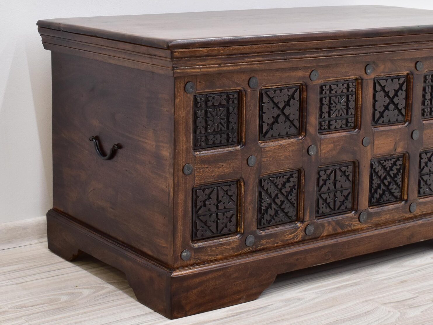 Ręcznie rzeźbiony kufer wykonany w 100% z litego drewna akacji indyjskiej, wybarwiony na ciemny brąz. Misterne ornamenty w ciemniejszym tonie nadają drewnianemu kufrowi tajemniczego, orientalnego charakteru. Indyjska skrzynia z delikatnymi metalowymi uchwytami służyć może do przechowywania, więc może być funkcjonalnym meblem do salonu, sypialni czy przedpokoju. Jej wymiary to 100/50/50 cm. Bogate rzeźbienia wykonane przez indyjskich rzemieślników powodują, że każdy egzemplarz jest niepowtarzalny.
