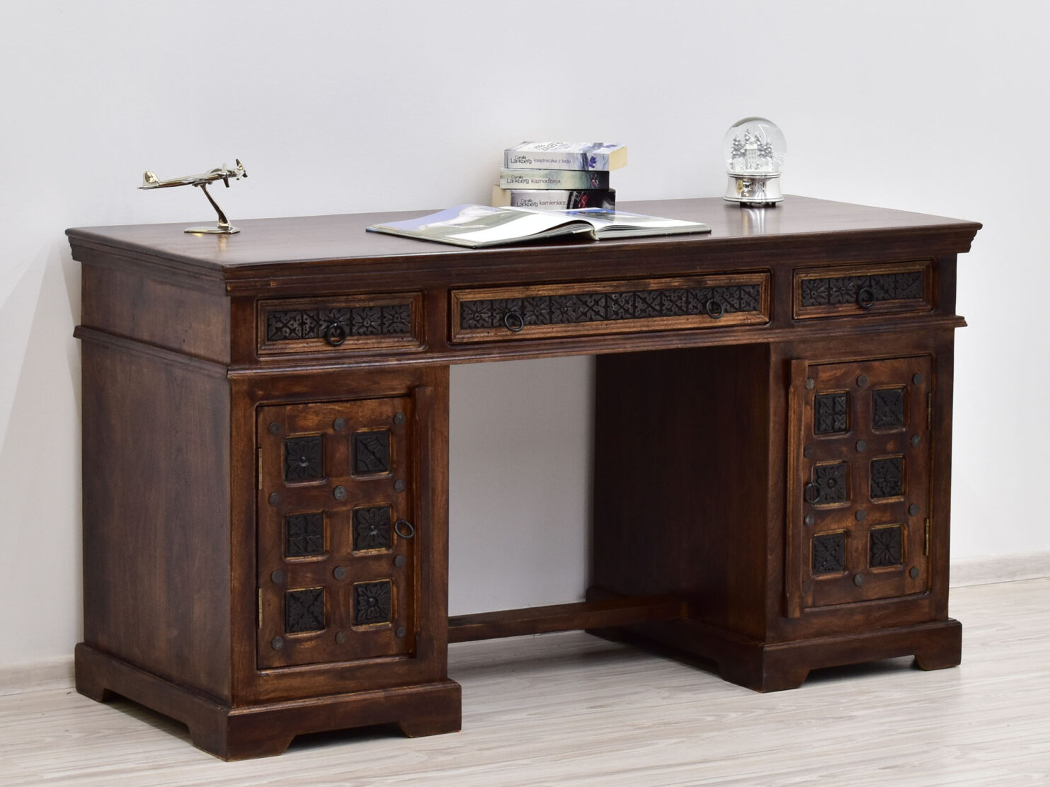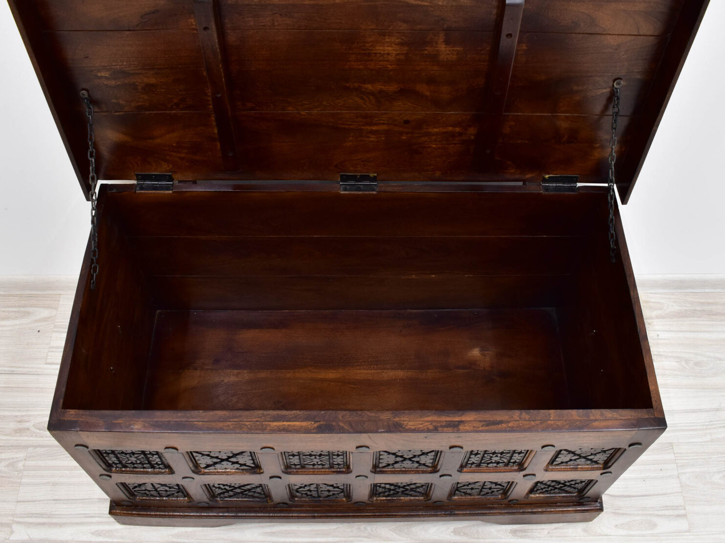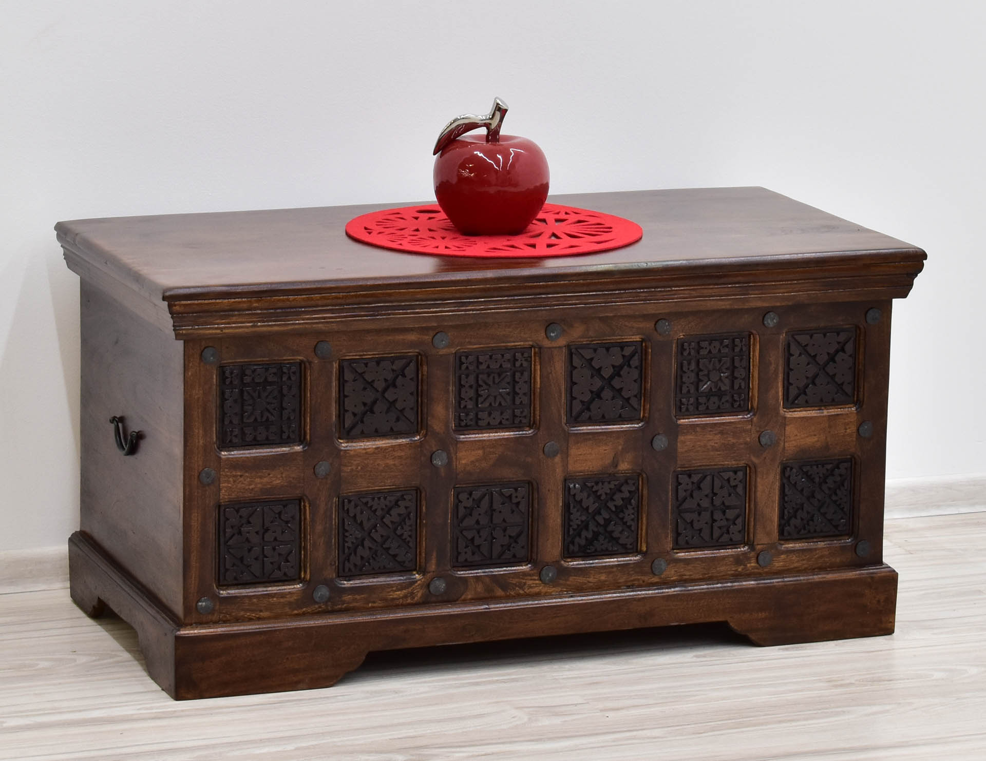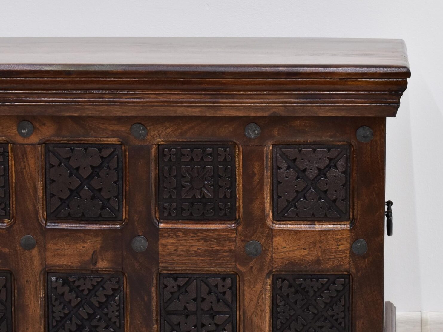Ręcznie rzeźbiony kufer wykonany w 100% z litego drewna akacji indyjskiej, wybarwiony na ciemny brąz. Misterne ornamenty w ciemniejszym tonie nadają drewnianemu kufrowi tajemniczego, orientalnego charakteru. Indyjska skrzynia z delikatnymi metalowymi uchwytami służyć może do przechowywania, więc może być funkcjonalnym meblem do salonu, sypialni czy przedpokoju. Jej wymiary to 100/50/50 cm. Bogate rzeźbienia wykonane przez indyjskich rzemieślników powodują, że każdy egzemplarz jest niepowtarzalny.