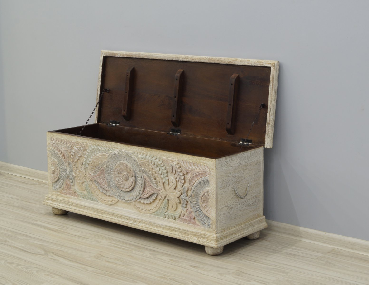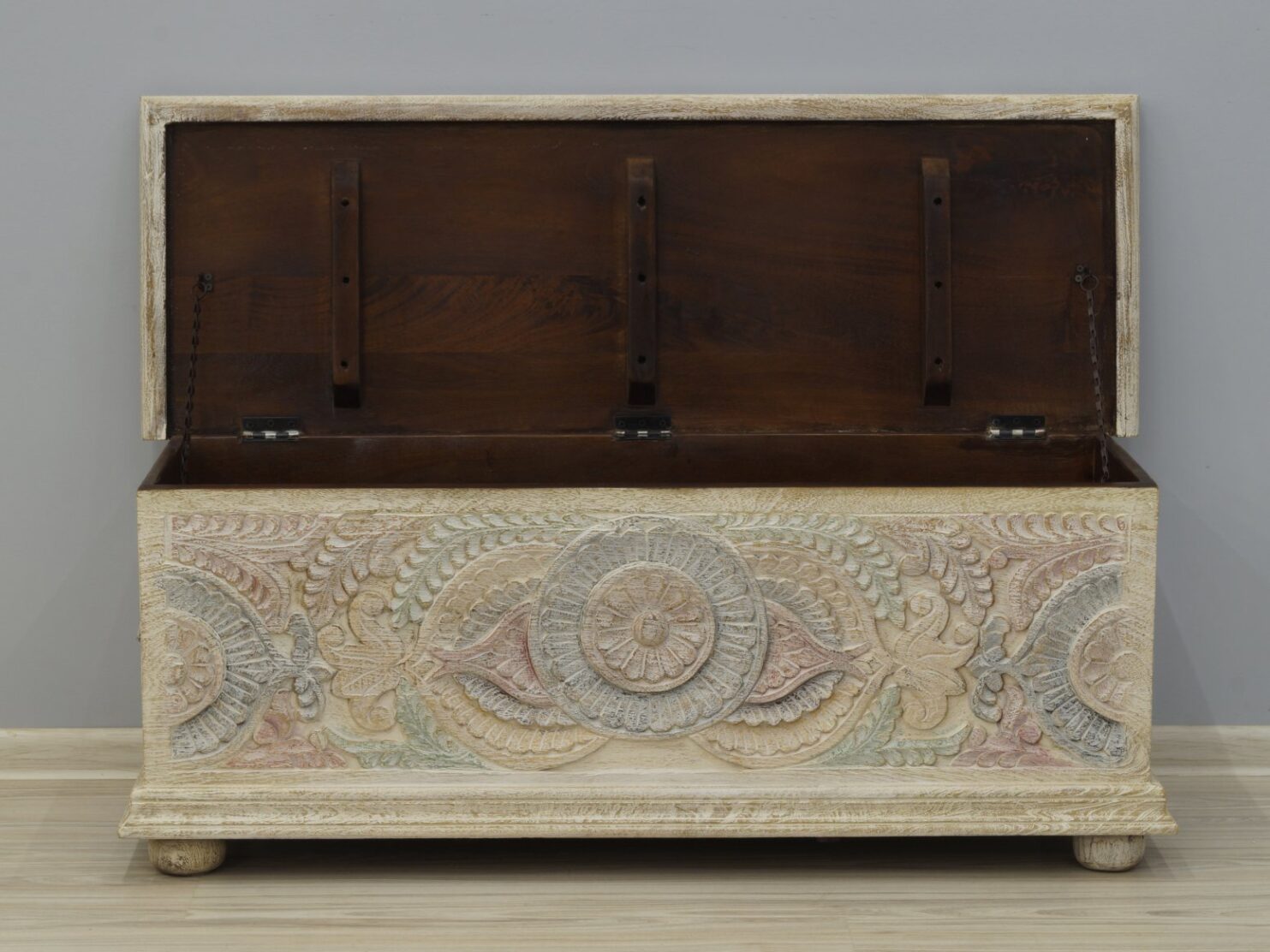 Kufer indyjski z unikatową rzeźbą na froncie mebla. Motywem przewodnim zdobienia jest kwiat. Stworzony został z egzotycznego w 100% litego drewna mango. Skrzynia stoi na małych toczonych nogach i posiada frezowany cokół. Jest to doskonały orientalny akcent, który przyozdobić może stylową, nietuzinkowo zaaranżowaną sypialnię.