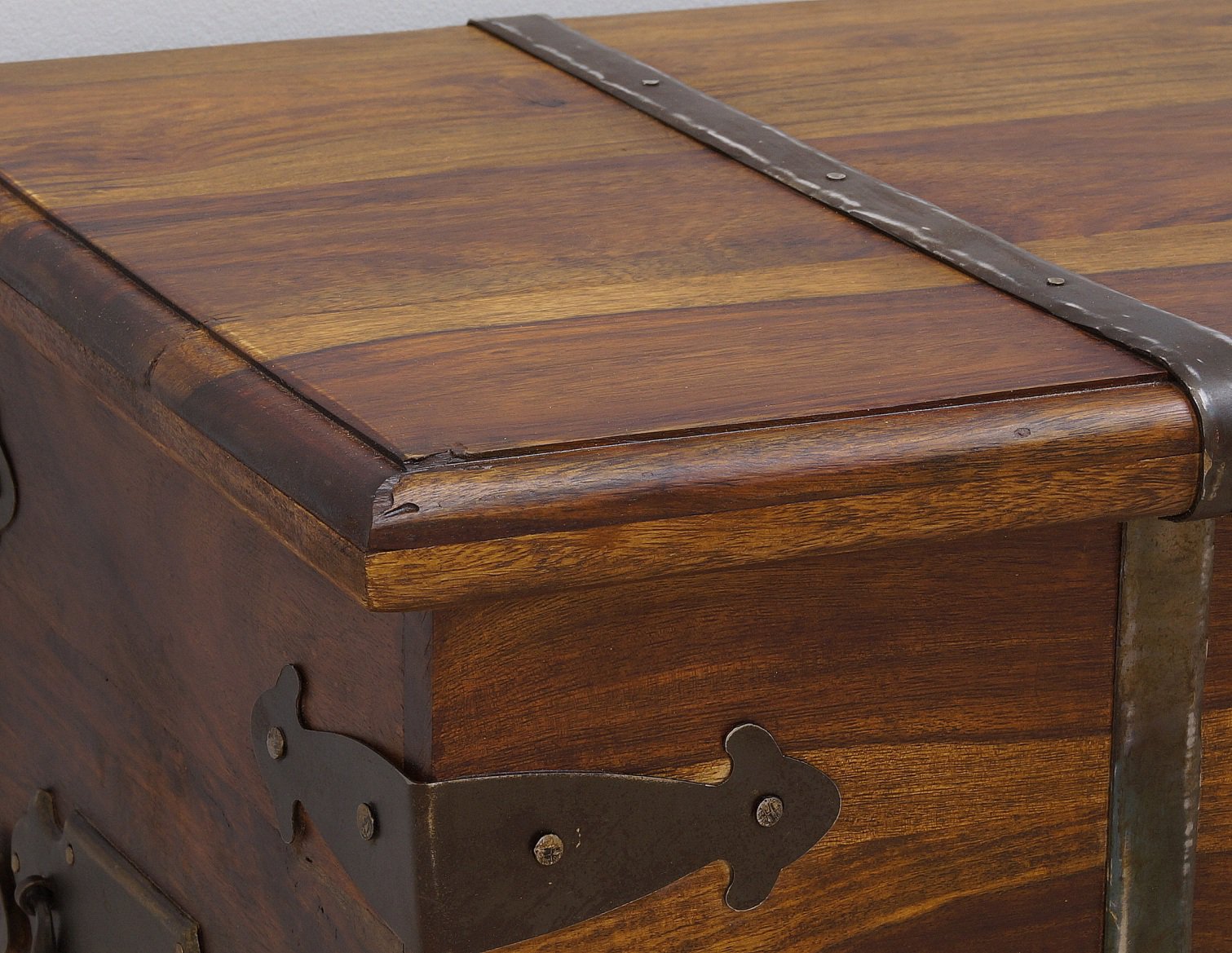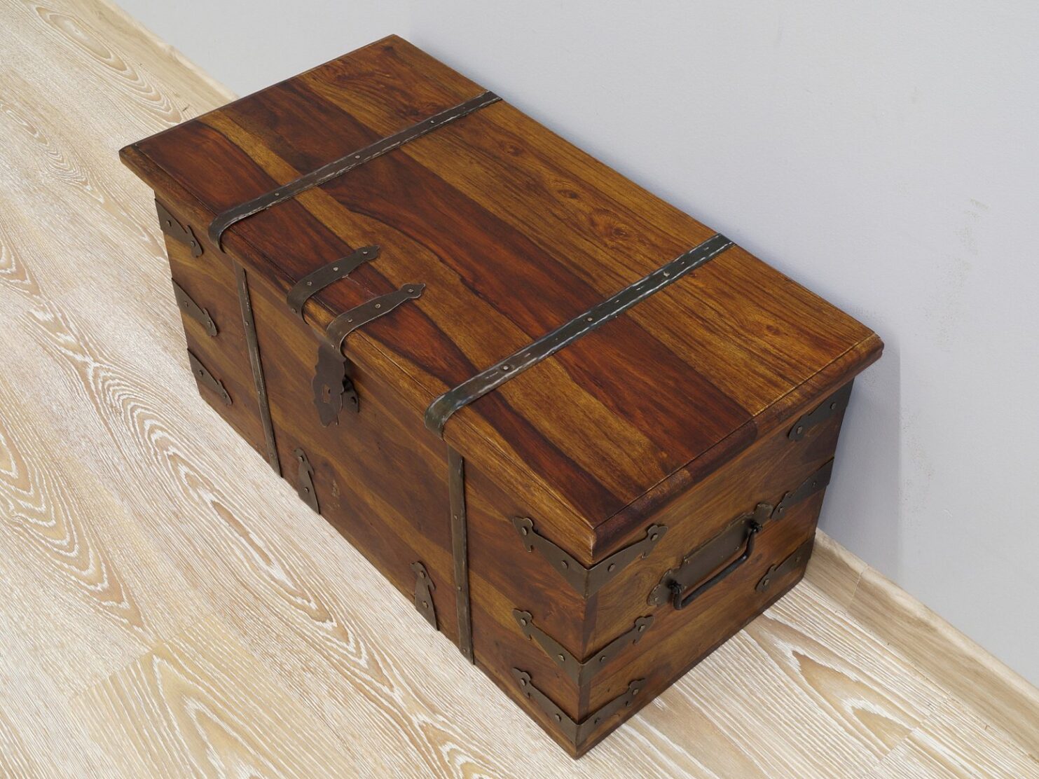 Stylowy kufer kolonialny, o wymiarach 80/40/40cm, został wytworzony ze szlachetnego drewna palisandru indyjskiego. Jest to mebel w 100% wykonany z litego drewna, ozdobiony metalowymi detalami dekoracyjnymi. Kufer posiada jasną barwę, dzięki czemu wyeksponowane zostało piękno naturalnego surowca. Drzewo różane to niezwykle trwałe drewno o wyrazistym, nieregularnym usłojeniu. Ów mebel posiada płaskie wieko, a całość przepasano metalowymi listwami. Mimo, że kufry mają odległą historię, to w tej odsłonie sprawdzą się doskonale w całkiem nowoczesnych wnętrzach.
