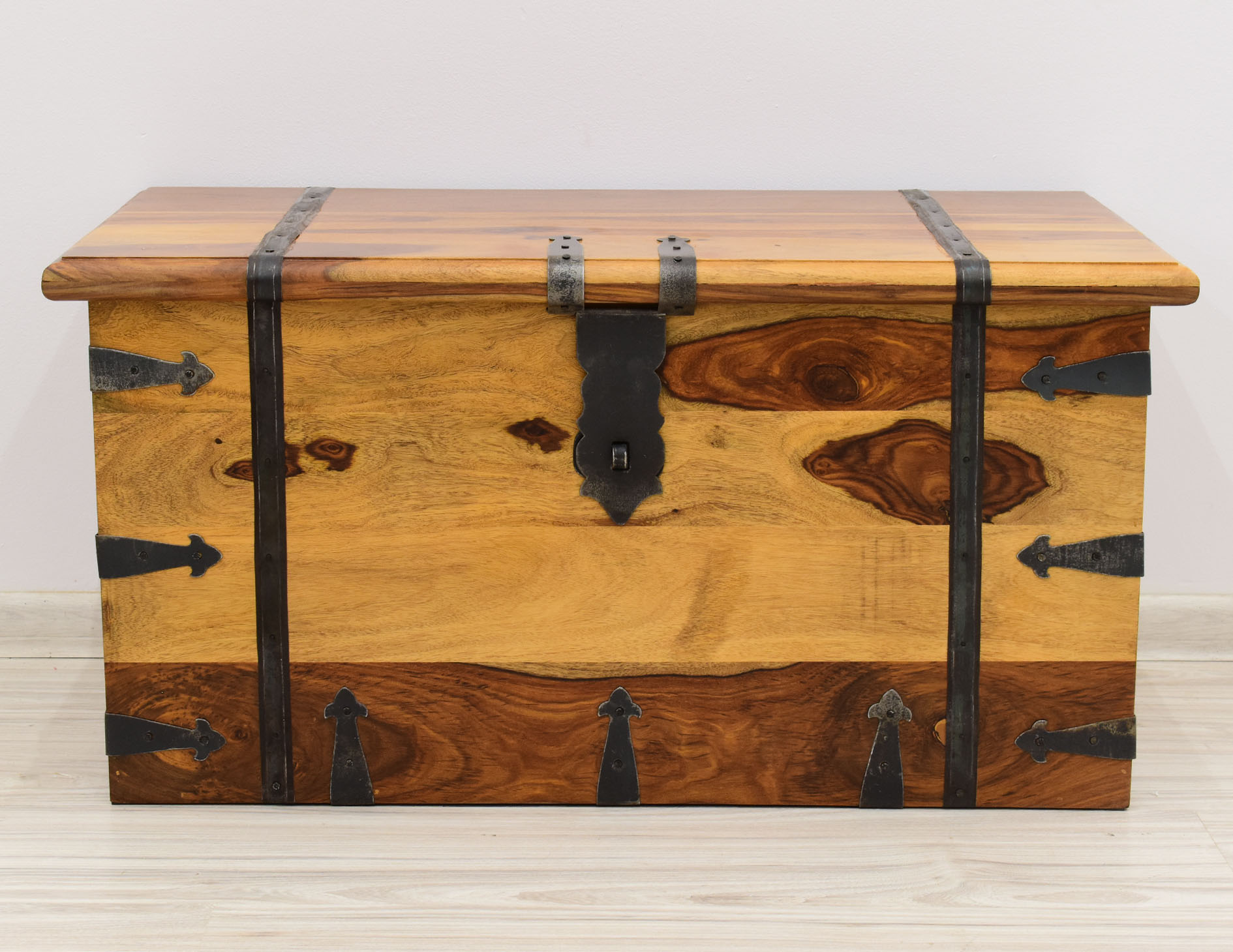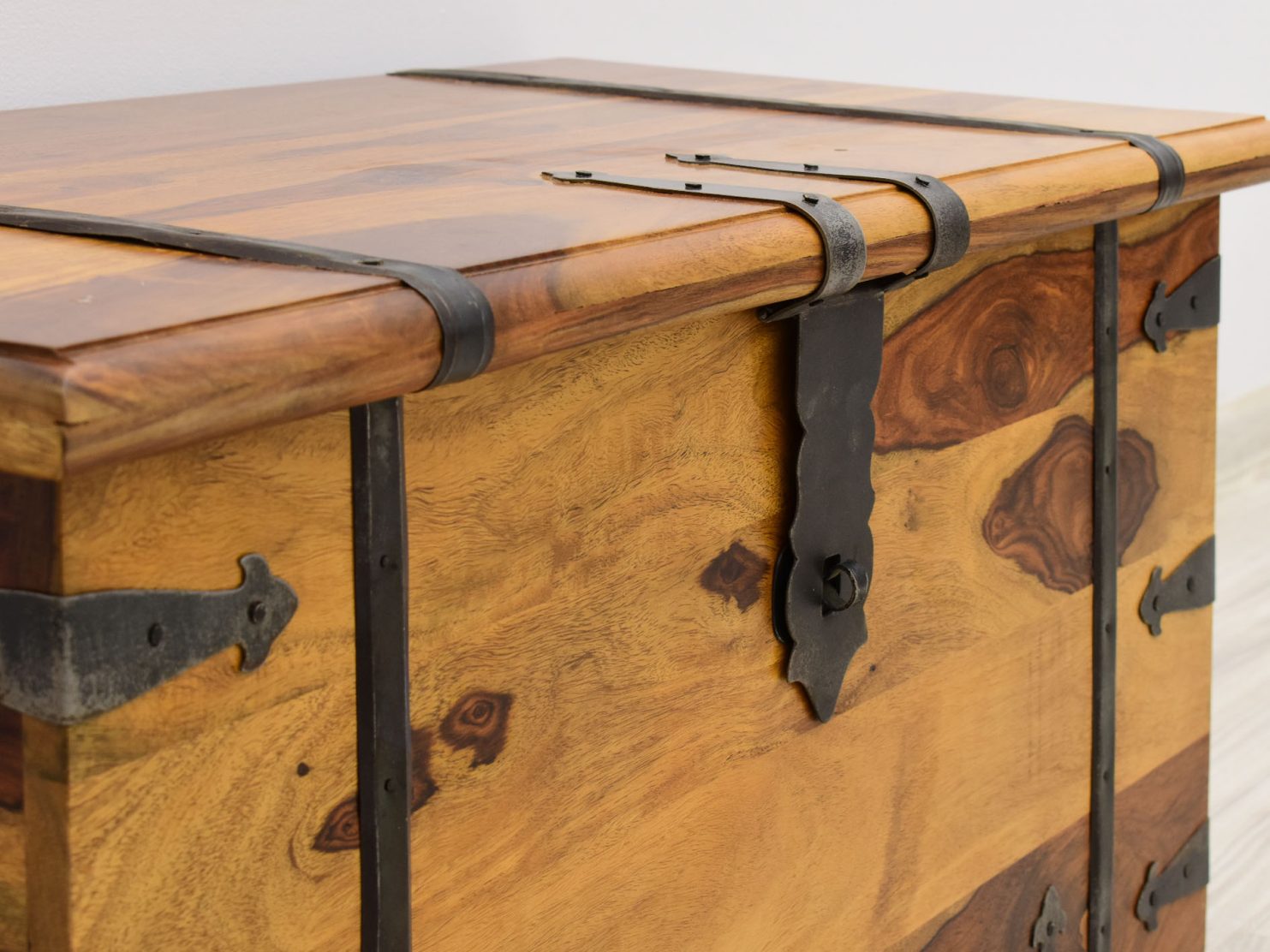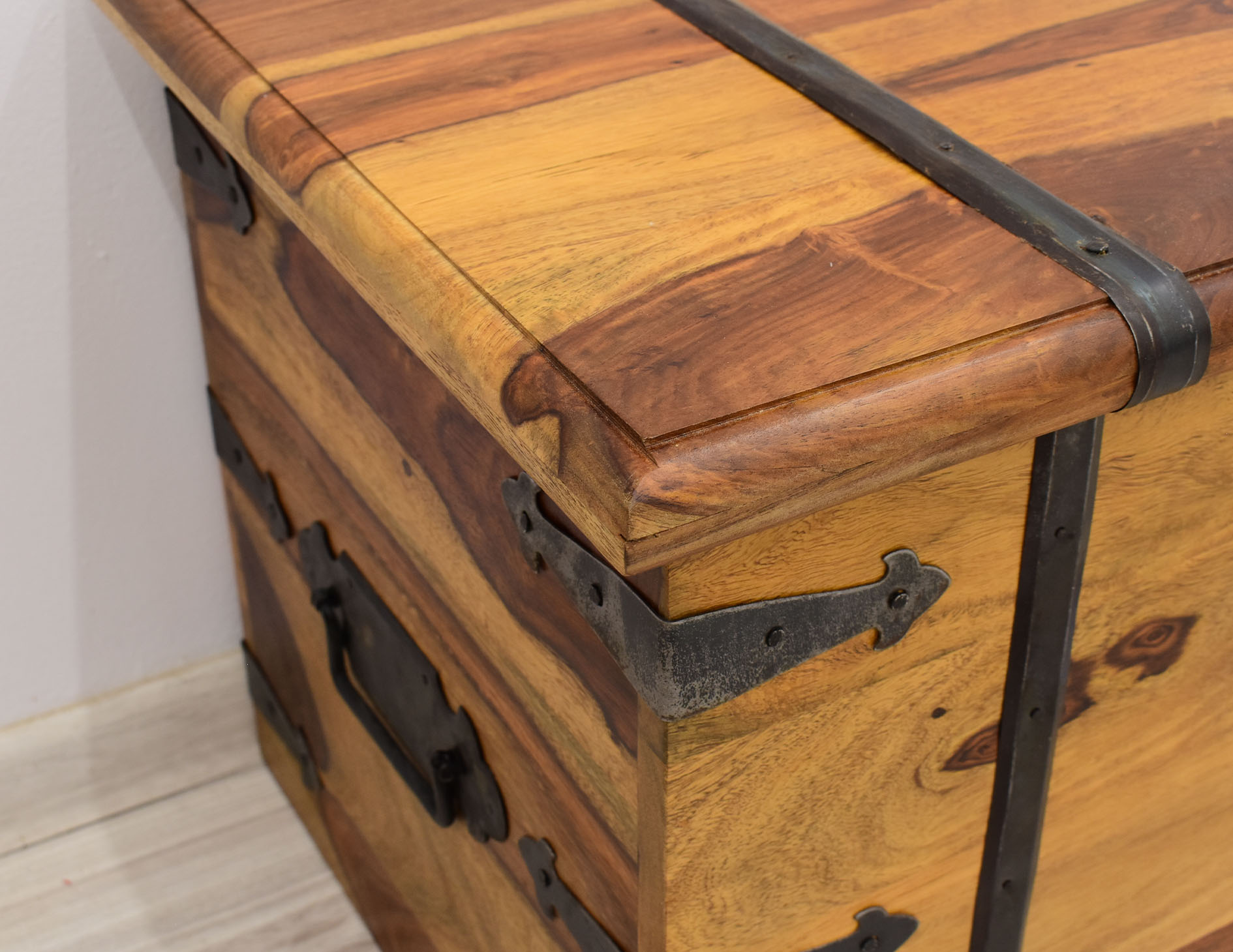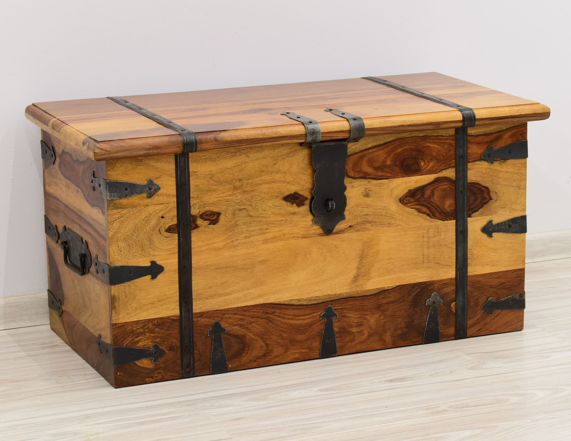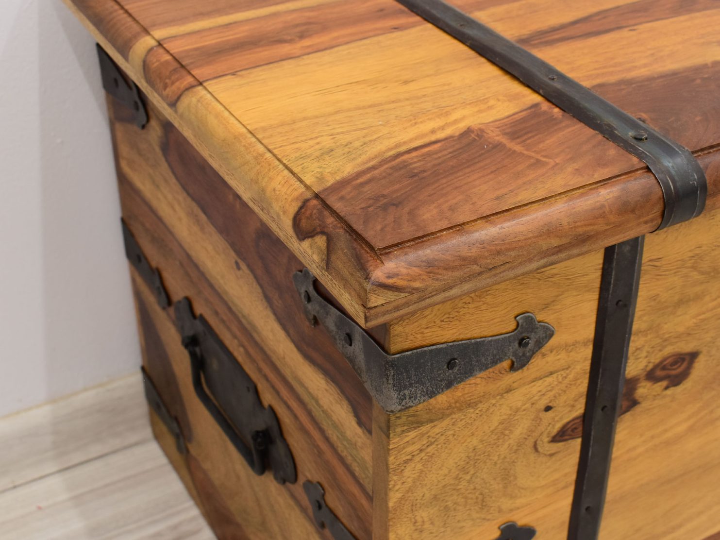 Indyjski kufer został wykonany w 100% z litego drewna palisandru. Jego jasnobrązowa barwa podkreśla unikatowość oleistych, nieregularnych słojów tego indyjskiego drewna. Jest to mebel wykonany w małej manufakturze, ozdobiony metalowymi okuciami, które przepasają cały mebel. Posiada wymiary 80/40/40cm. Będzie on doskonałym elementem aranżacji sypialni lub przedpokoju jako  orientalny schowek.
