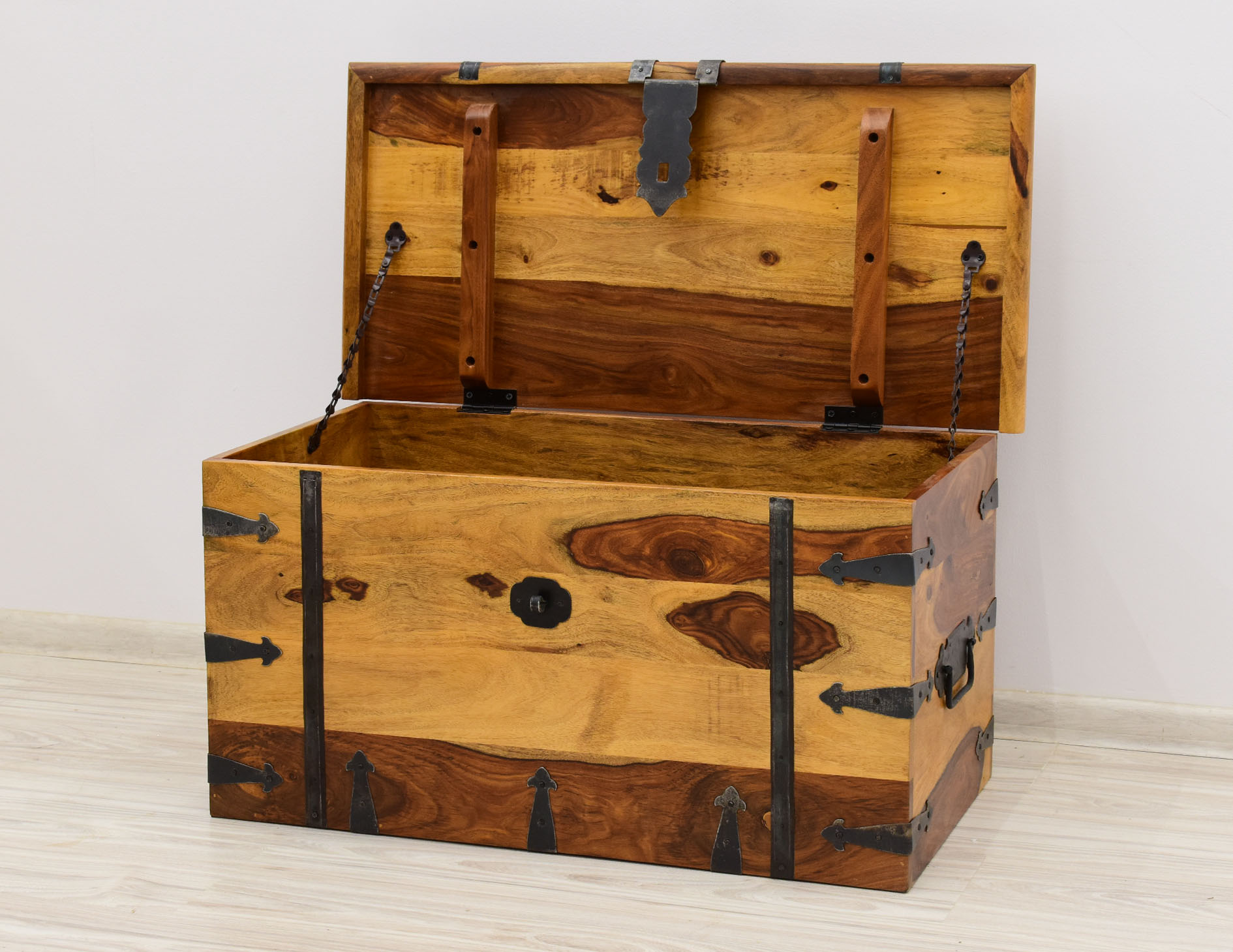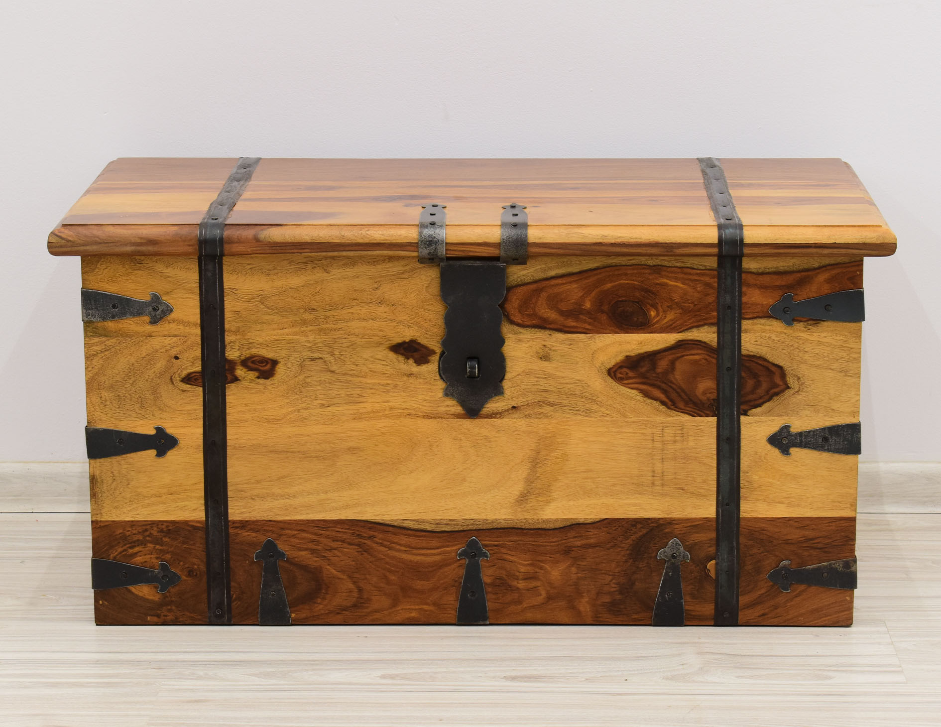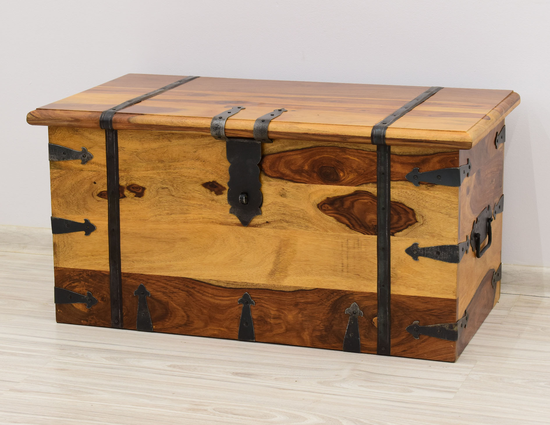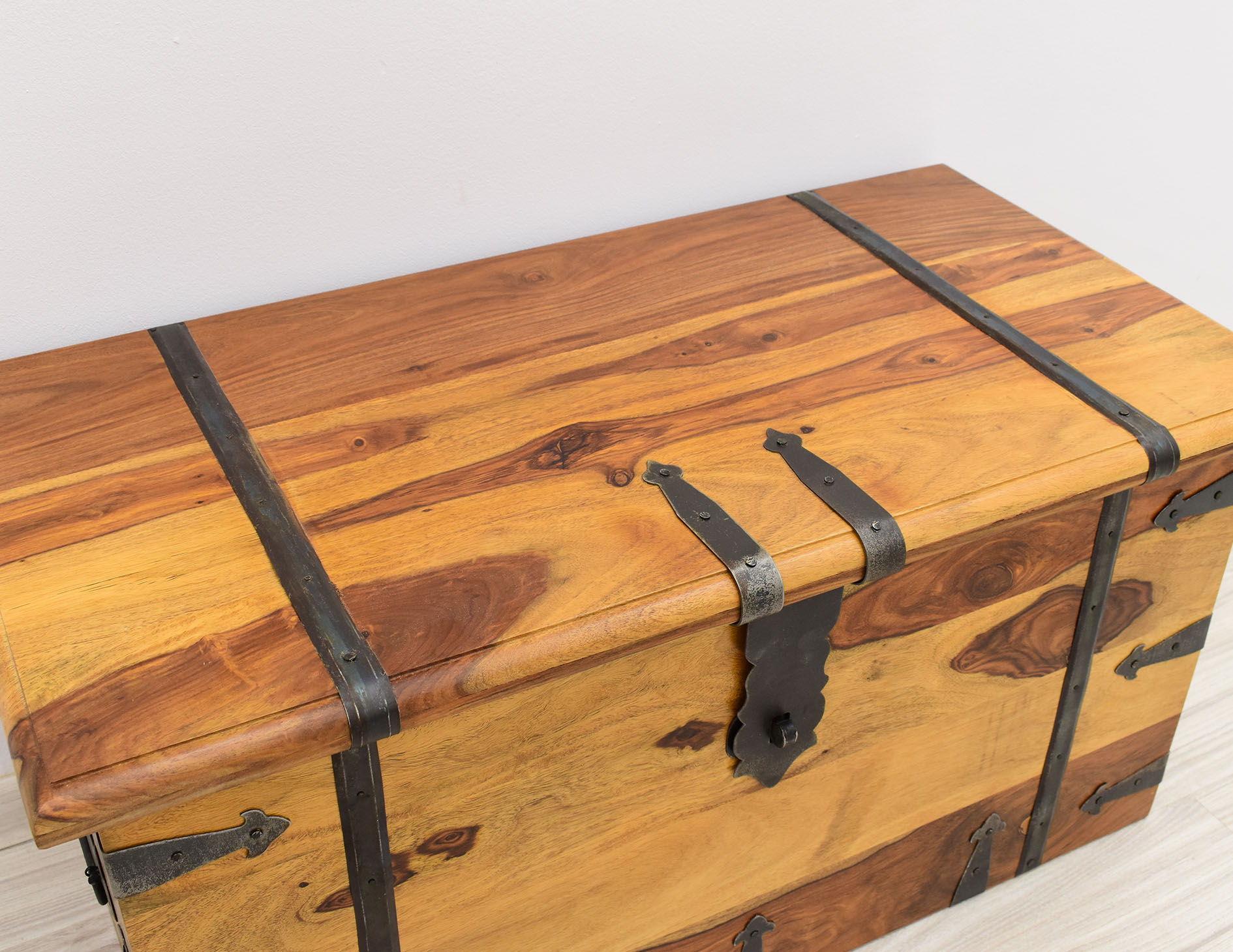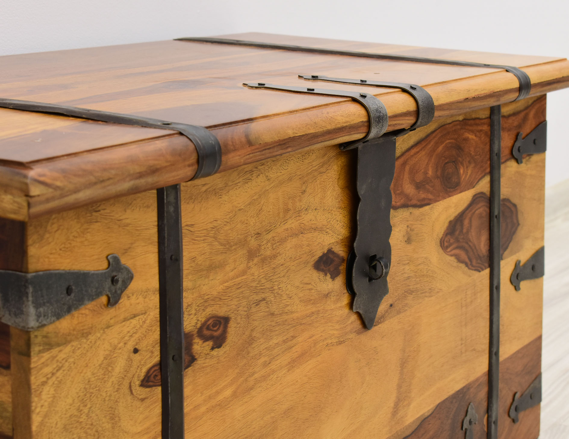 Indyjski kufer został wykonany w 100% z litego drewna palisandru. Jego jasnobrązowa barwa podkreśla unikatowość oleistych, nieregularnych słojów tego indyjskiego drewna. Jest to mebel wykonany w małej manufakturze, ozdobiony metalowymi okuciami, które przepasają cały mebel. Posiada wymiary 80/40/40cm. Będzie on doskonałym elementem aranżacji sypialni lub przedpokoju jako  orientalny schowek.