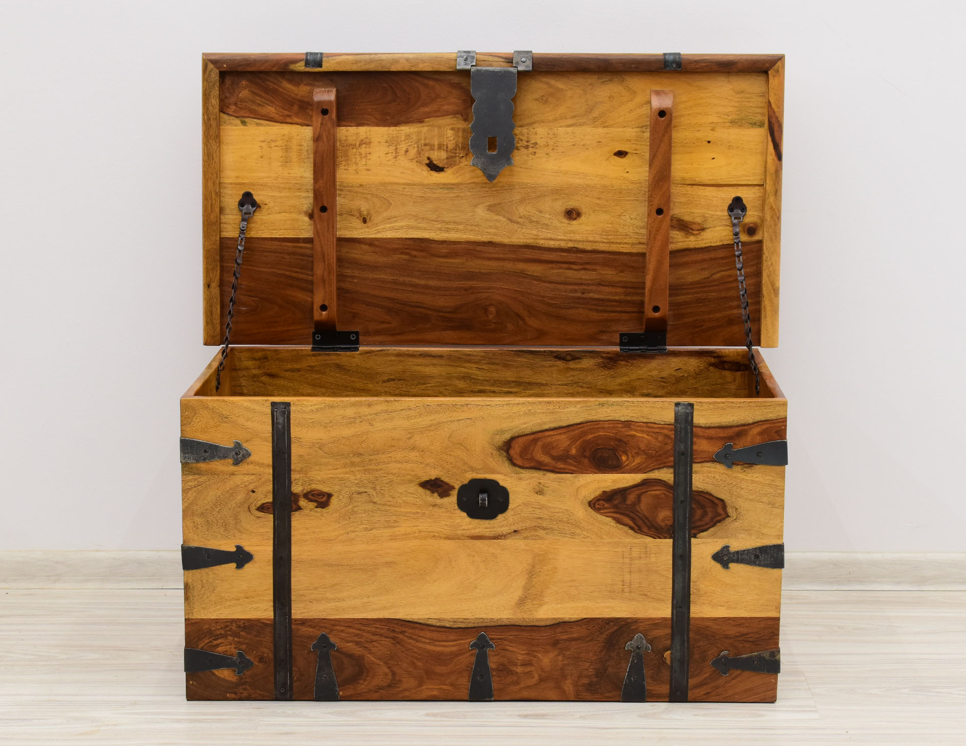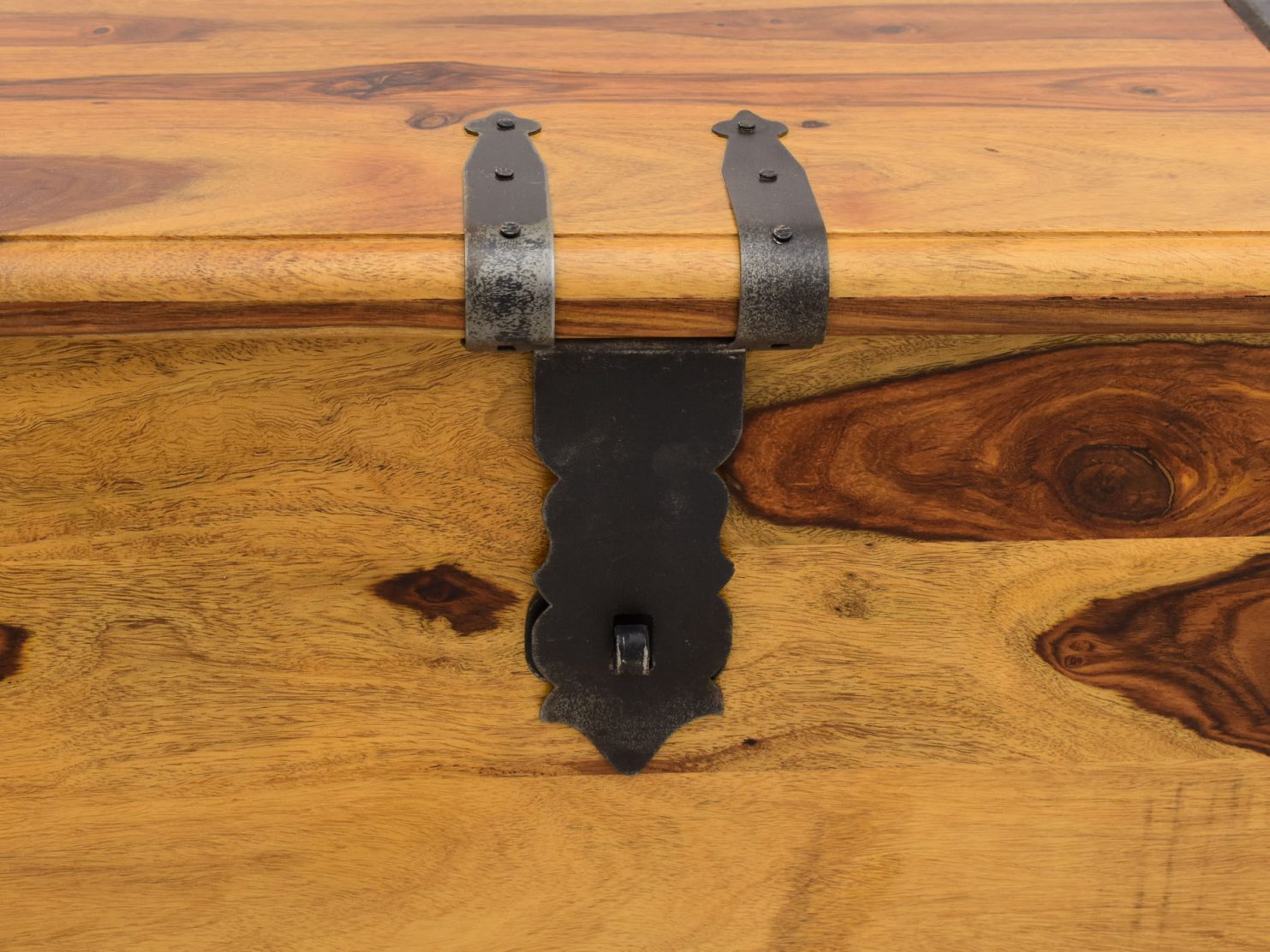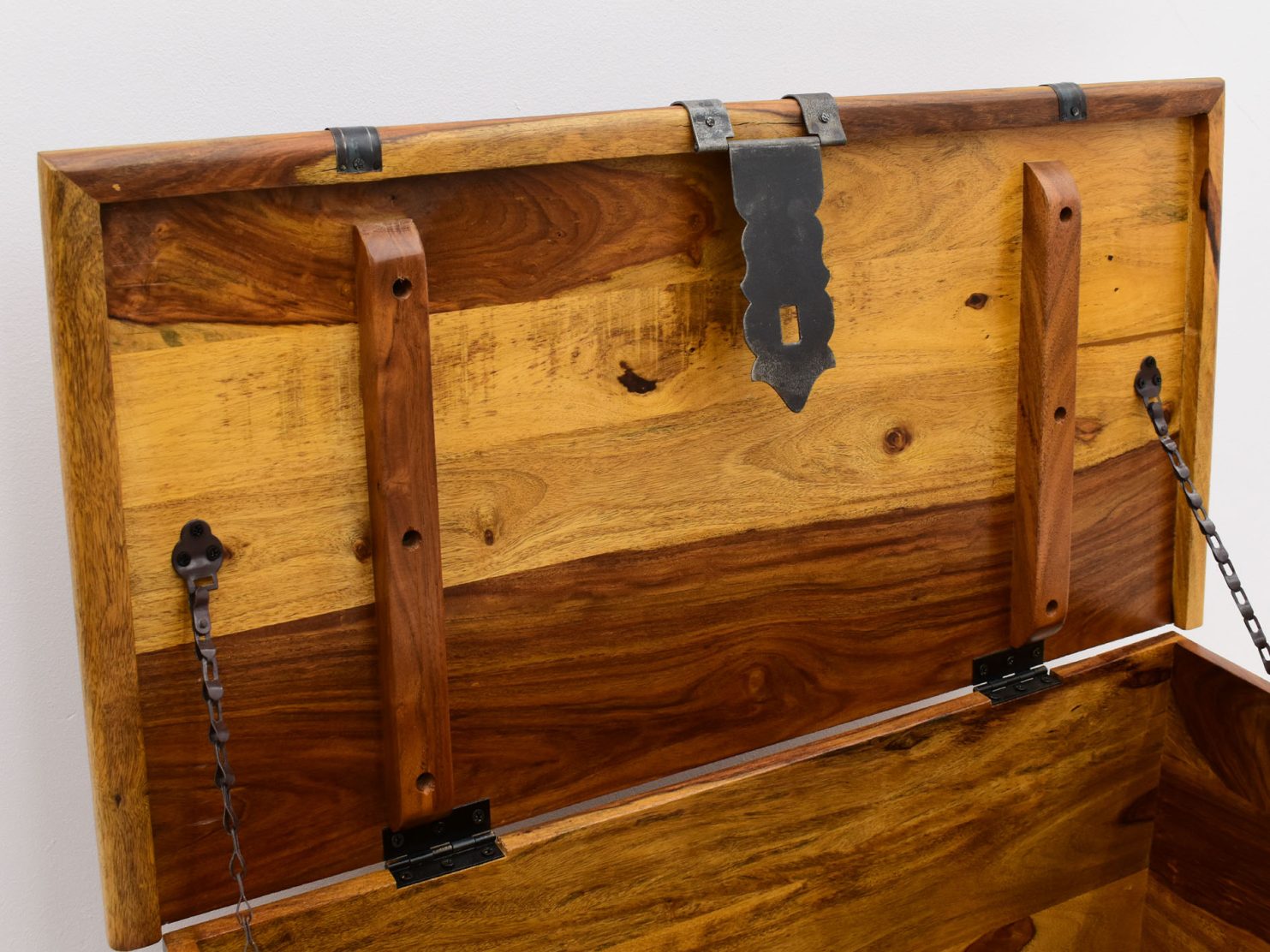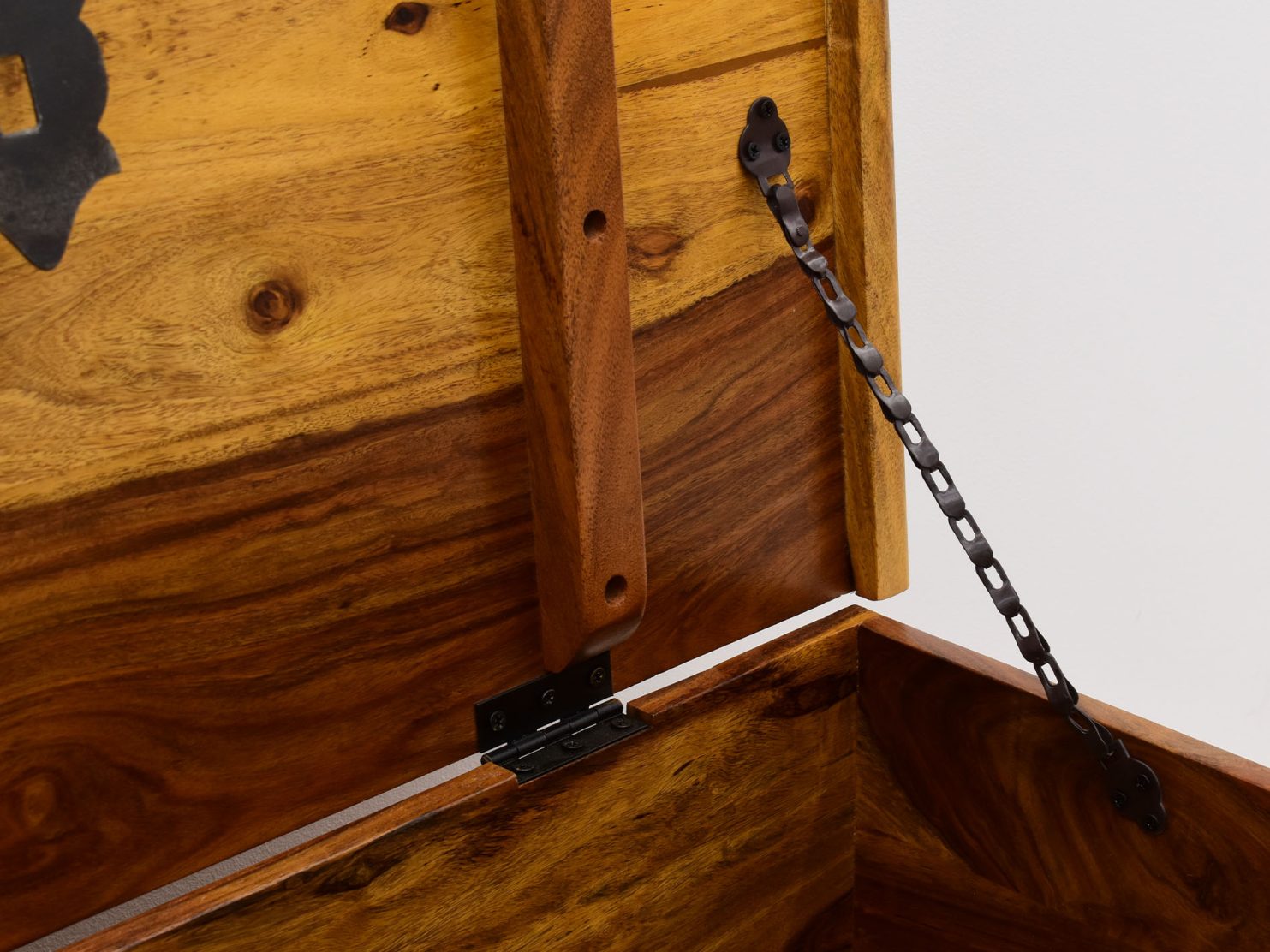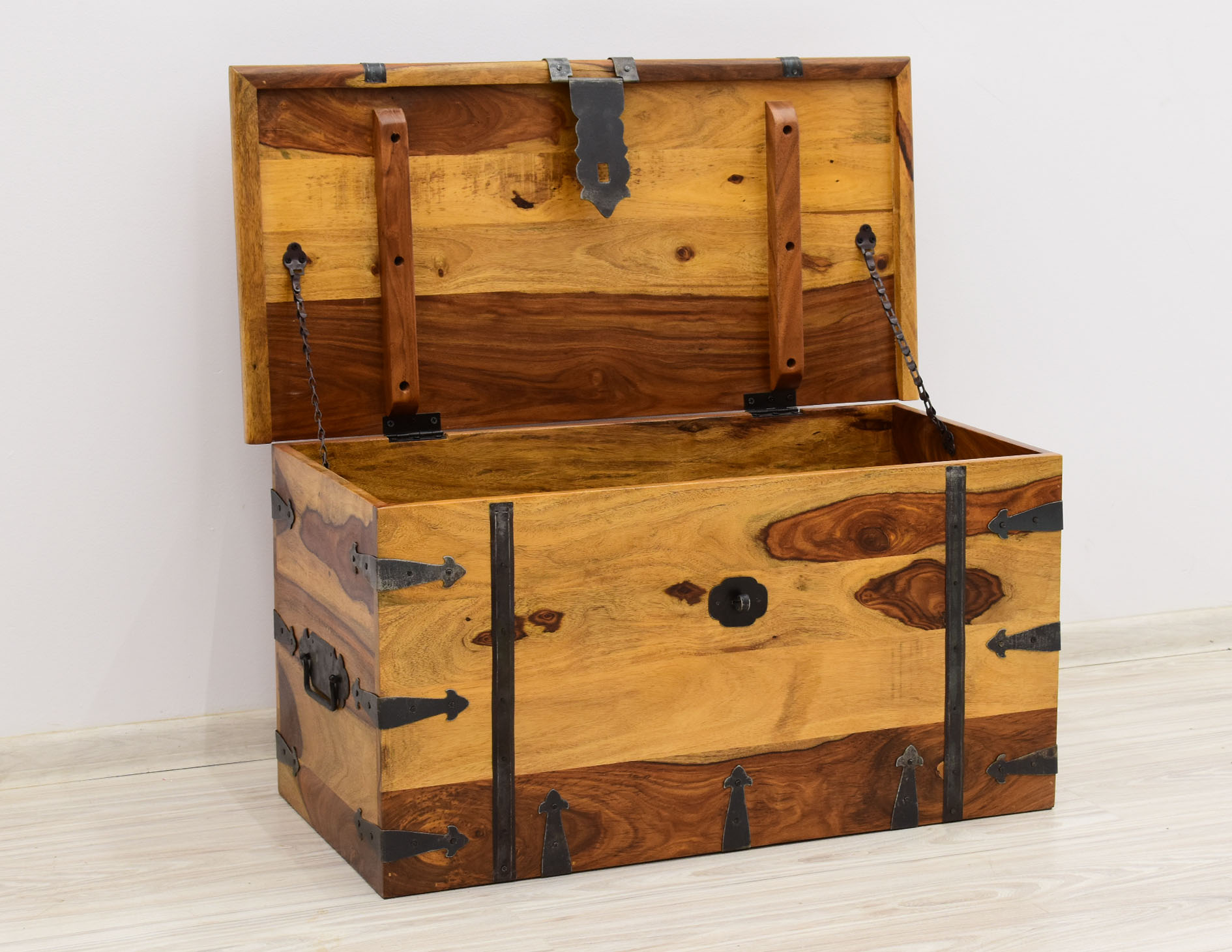 Indyjski kufer został wykonany w 100% z litego drewna palisandru. Jego jasnobrązowa barwa podkreśla unikatowość oleistych, nieregularnych słojów tego indyjskiego drewna. Jest to mebel wykonany w małej manufakturze, ozdobiony metalowymi okuciami, które przepasają cały mebel. Posiada wymiary 80/40/40cm. Będzie on doskonałym elementem aranżacji sypialni lub przedpokoju jako  orientalny schowek.