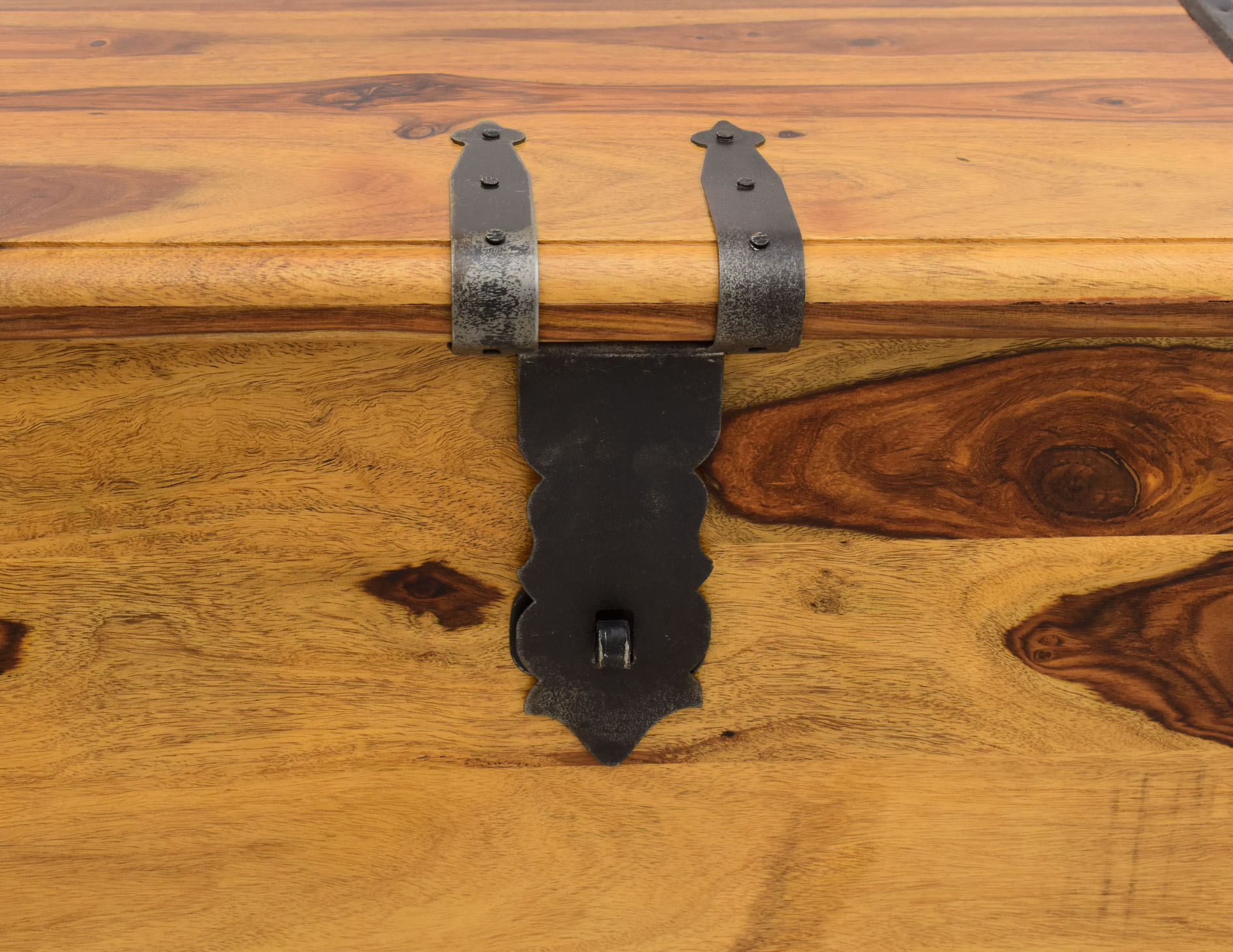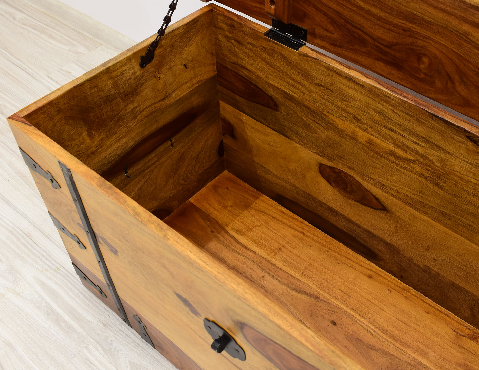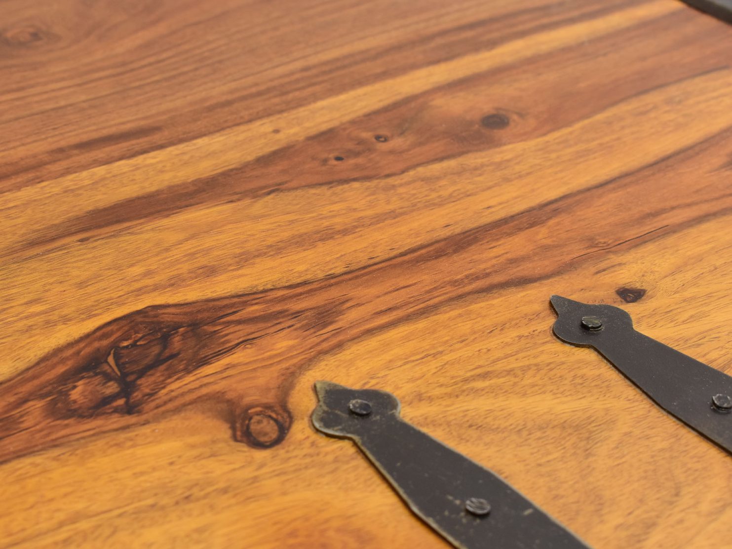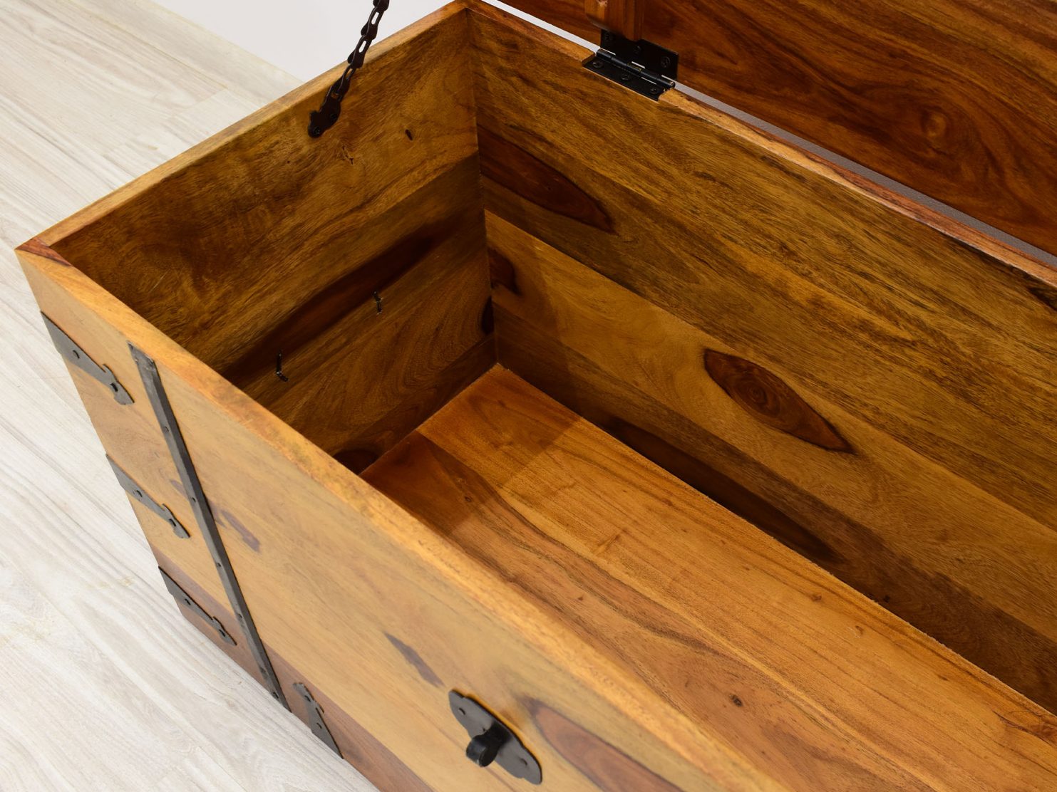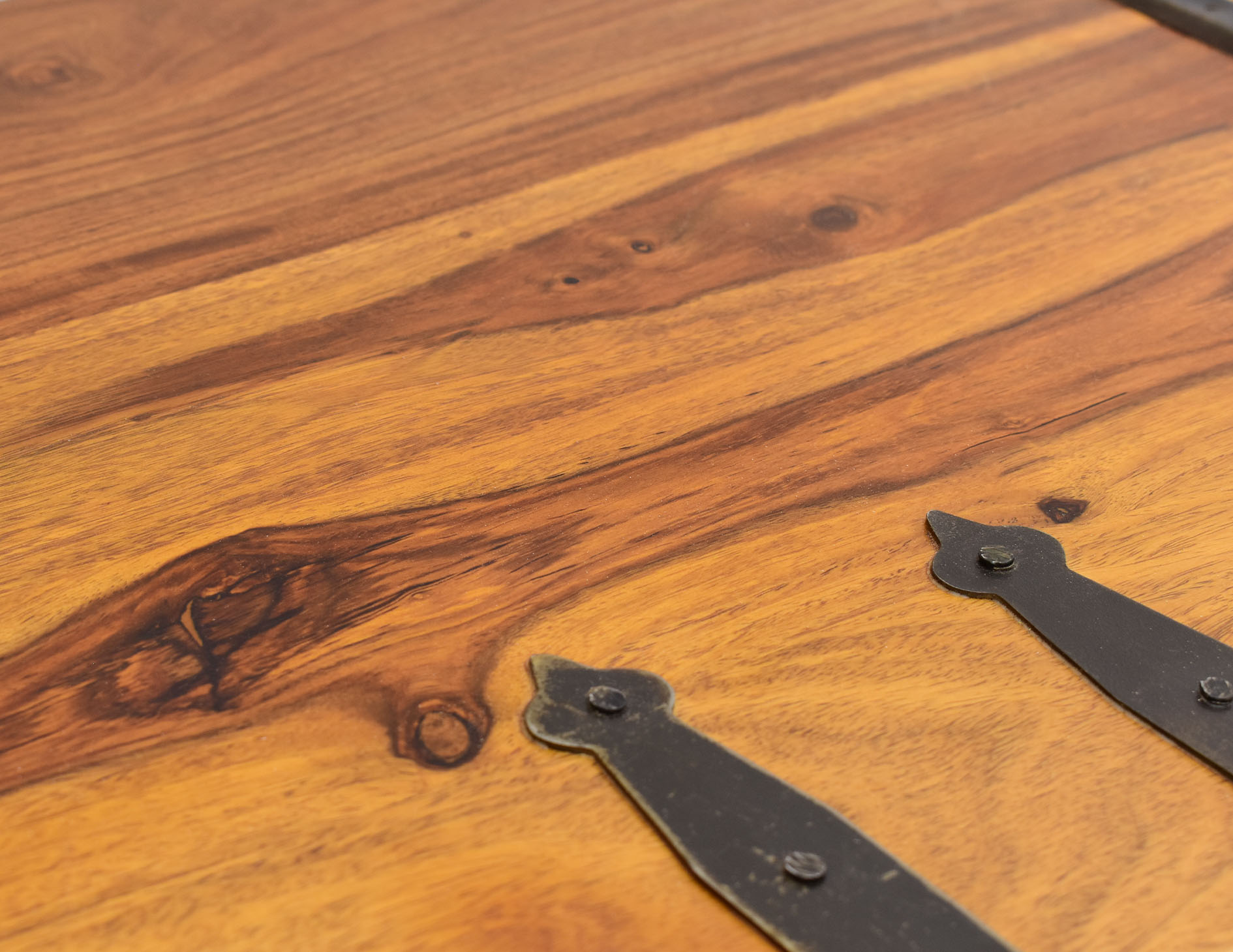 Indyjski kufer został wykonany w 100% z litego drewna palisandru. Jego jasnobrązowa barwa podkreśla unikatowość oleistych, nieregularnych słojów tego indyjskiego drewna. Jest to mebel wykonany w małej manufakturze, ozdobiony metalowymi okuciami, które przepasają cały mebel. Posiada wymiary 80/40/40cm. Będzie on doskonałym elementem aranżacji sypialni lub przedpokoju jako  orientalny schowek.