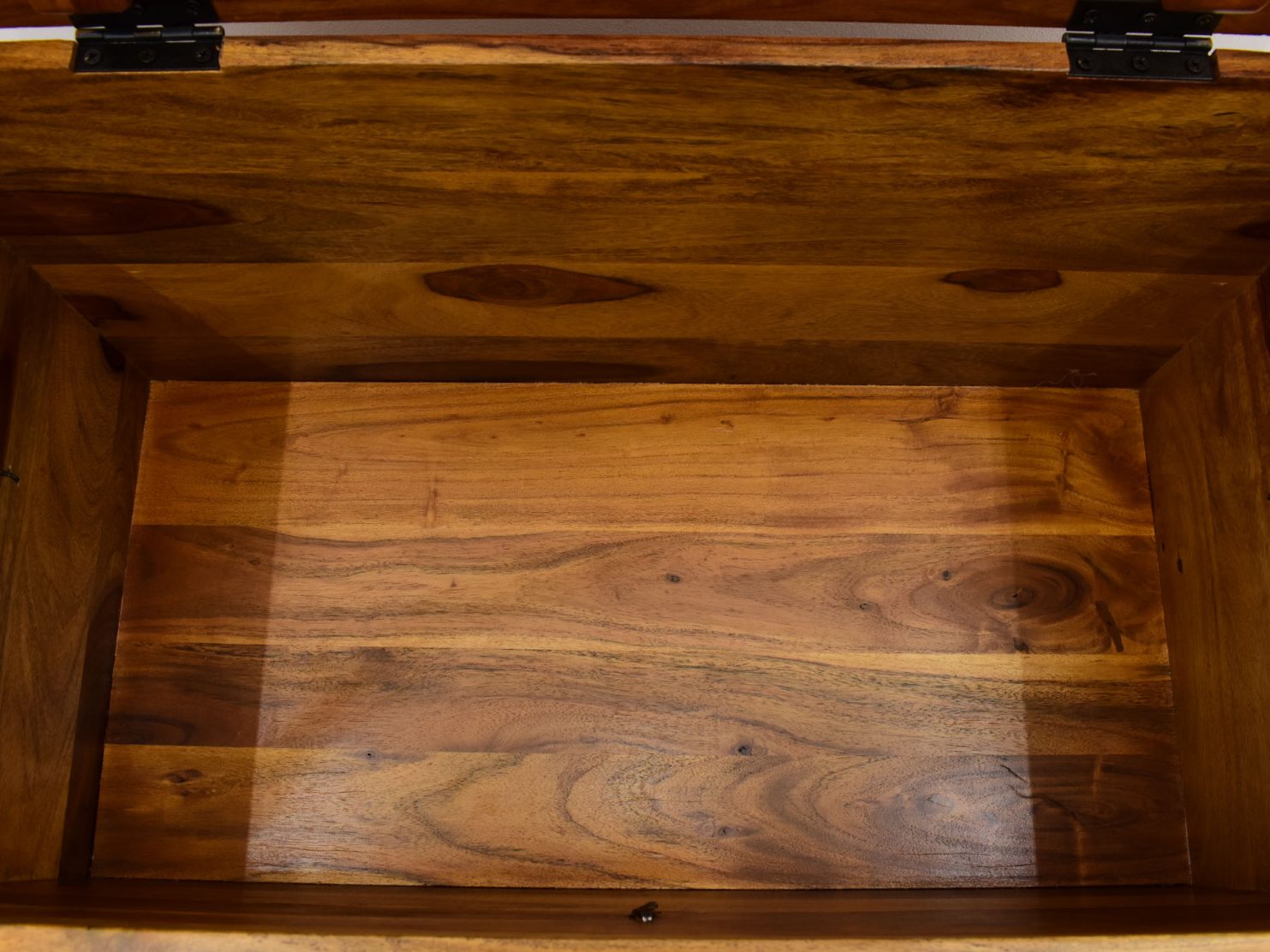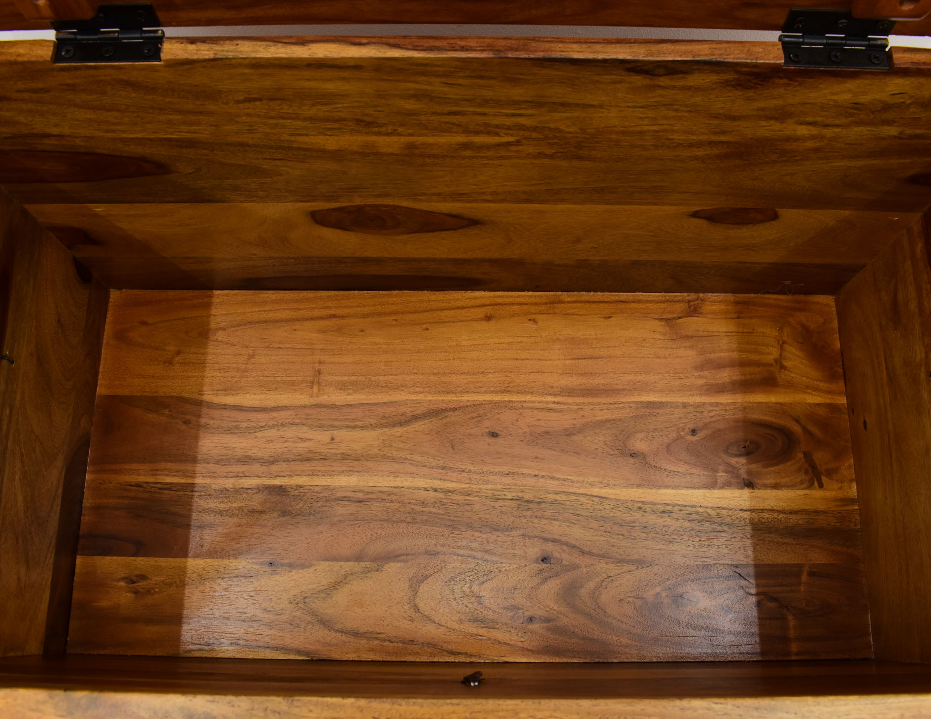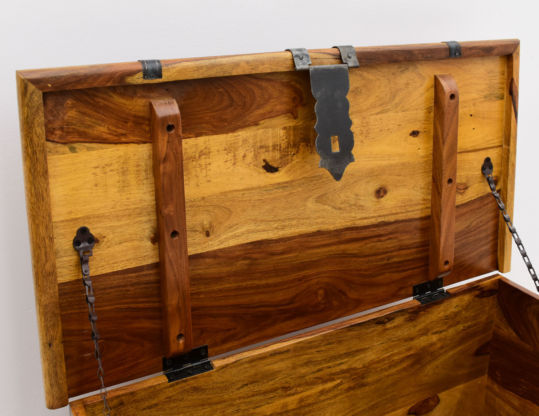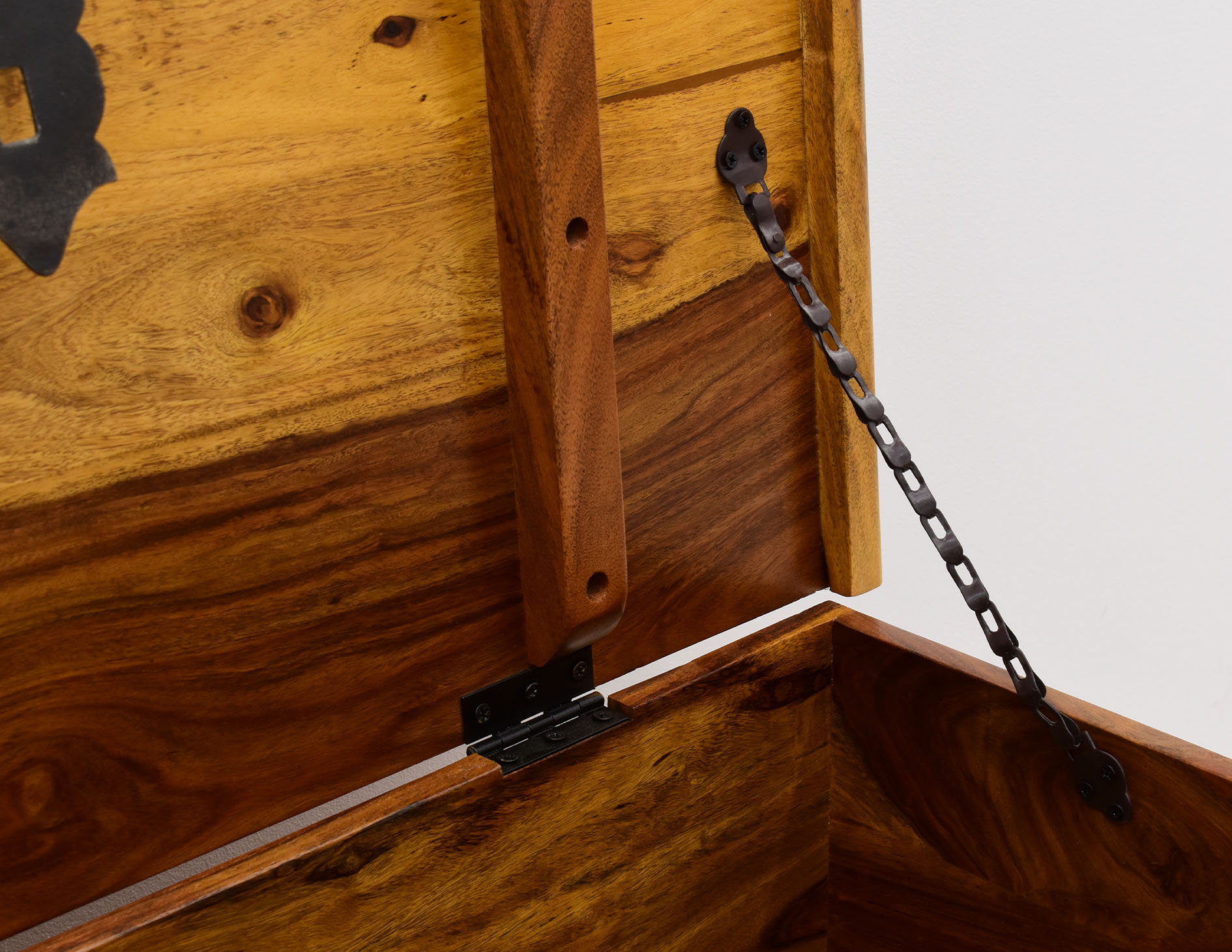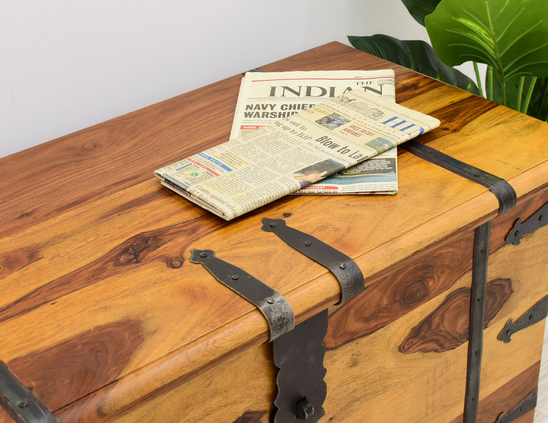 Indyjski kufer został wykonany w 100% z litego drewna palisandru. Jego jasnobrązowa barwa podkreśla unikatowość oleistych, nieregularnych słojów tego indyjskiego drewna. Jest to mebel wykonany w małej manufakturze, ozdobiony metalowymi okuciami, które przepasają cały mebel. Posiada wymiary 80/40/40cm. Będzie on doskonałym elementem aranżacji sypialni lub przedpokoju jako  orientalny schowek.
