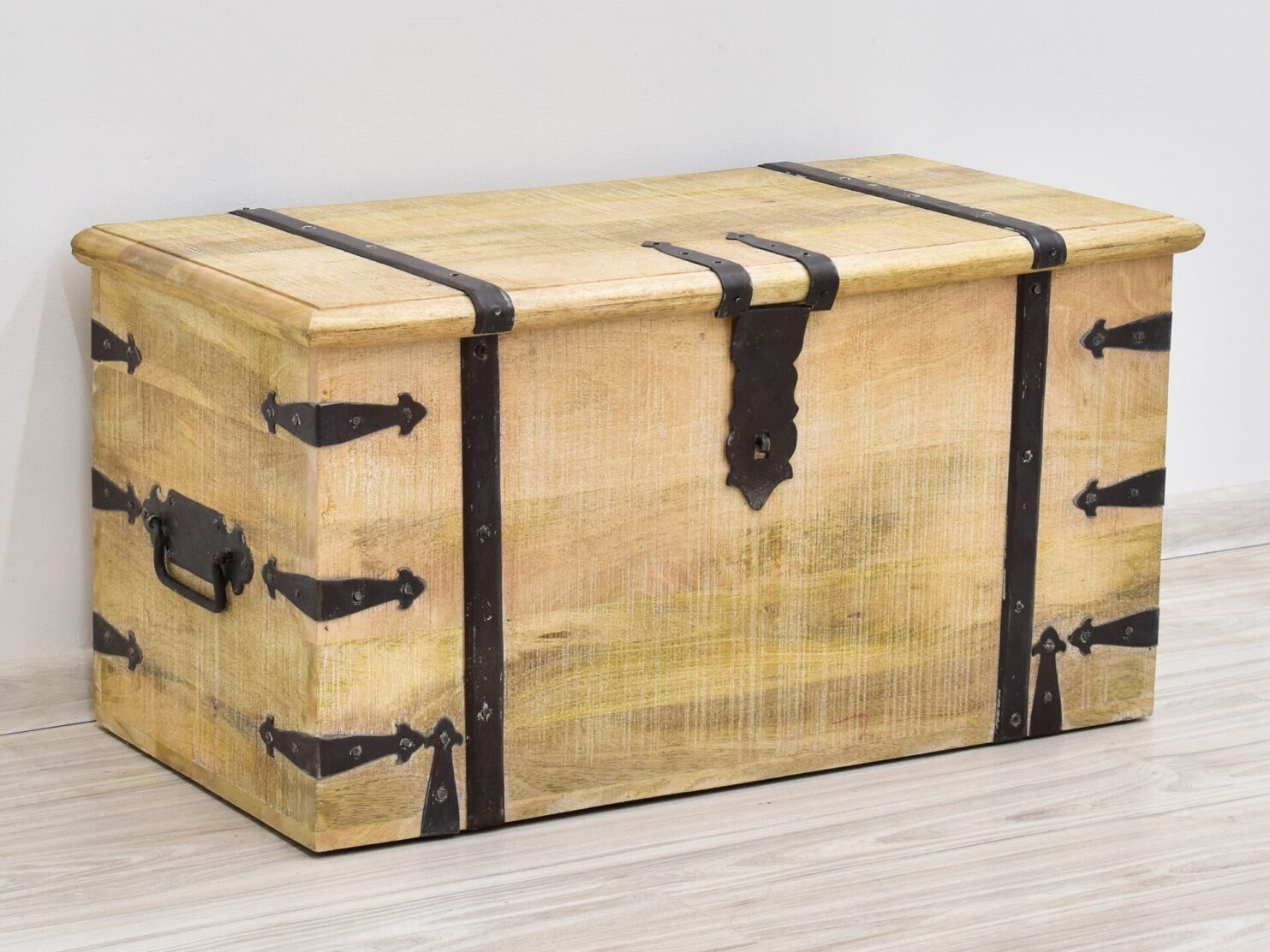 Kufer kolonialny wykonany z jasnego drewna mango, w 100% litego, został przepasany metalowymi listwami i okuciami. Unikatowa struktura egzotycznego drewna sprawia, że skrzynia wpisze się w nowoczesną aranżację przedpokoju. Takowy kufer umieszczony przy nogach łóżka, z tej samej kolekcji, stworzy stylową aczkolwiek nowoczesną przestrzeń sypialnianą. Nie jest to mebel pokaźnych rozmiarów. Ma wysokość 40cm, natomiast wieko ma rozmiary 80/40cm.