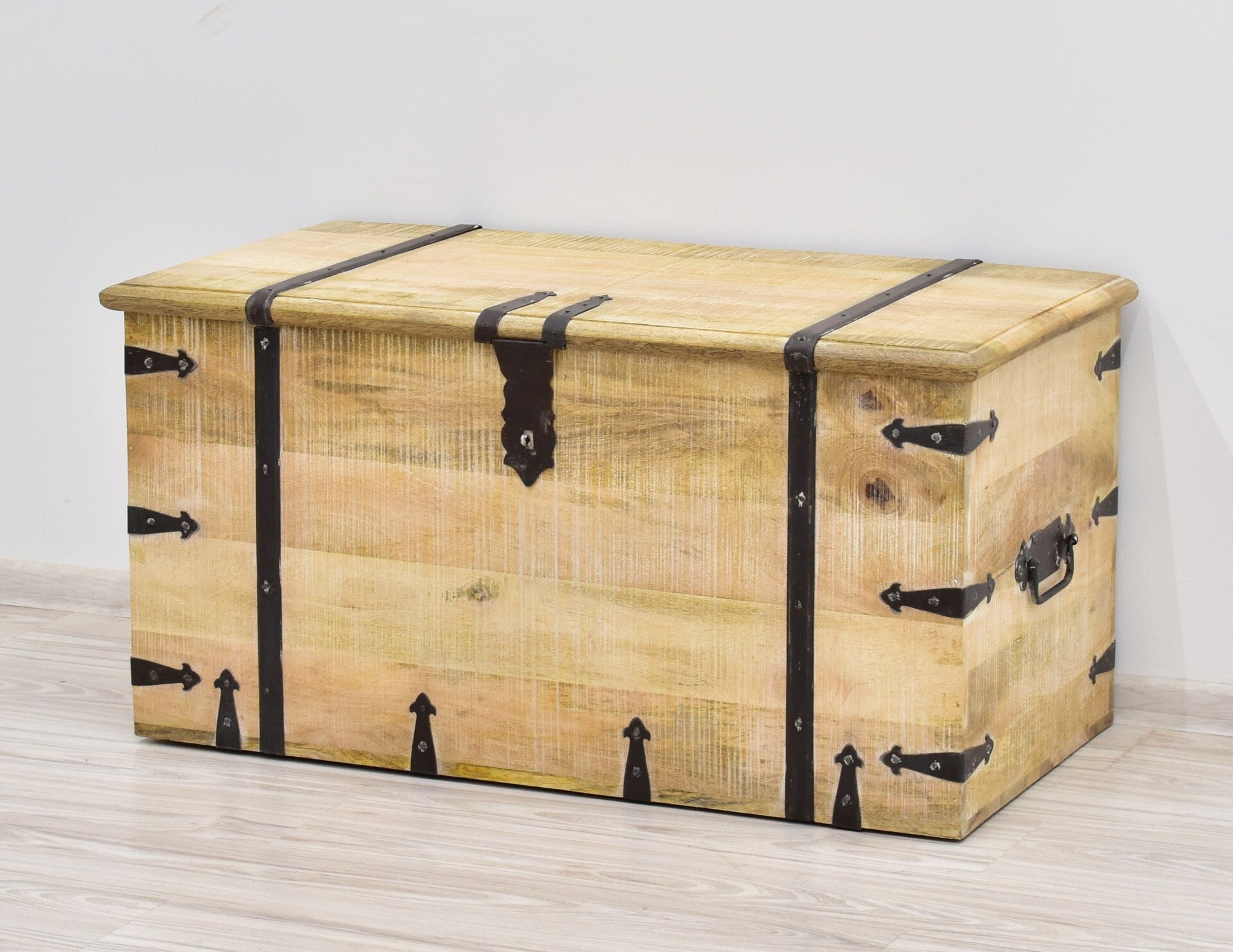 Duża skrzynia loft z mango wykonana została w indyjskich manufakturach. Kufer stworzony w 100%  z litego drewna mango i ozdobiony metalowymi okuciami oraz listwami. Mebel ten doda egzotycznego klimatu każdemu wnętrzu stylizowanemu na minimalistyczny nurt Loft. Ta metrowa skrzynia pomieści wiele przedmiotów i stanie się funkcjonalnym meblem w każdym przedpokoju czy nowoczesnej sypialni.