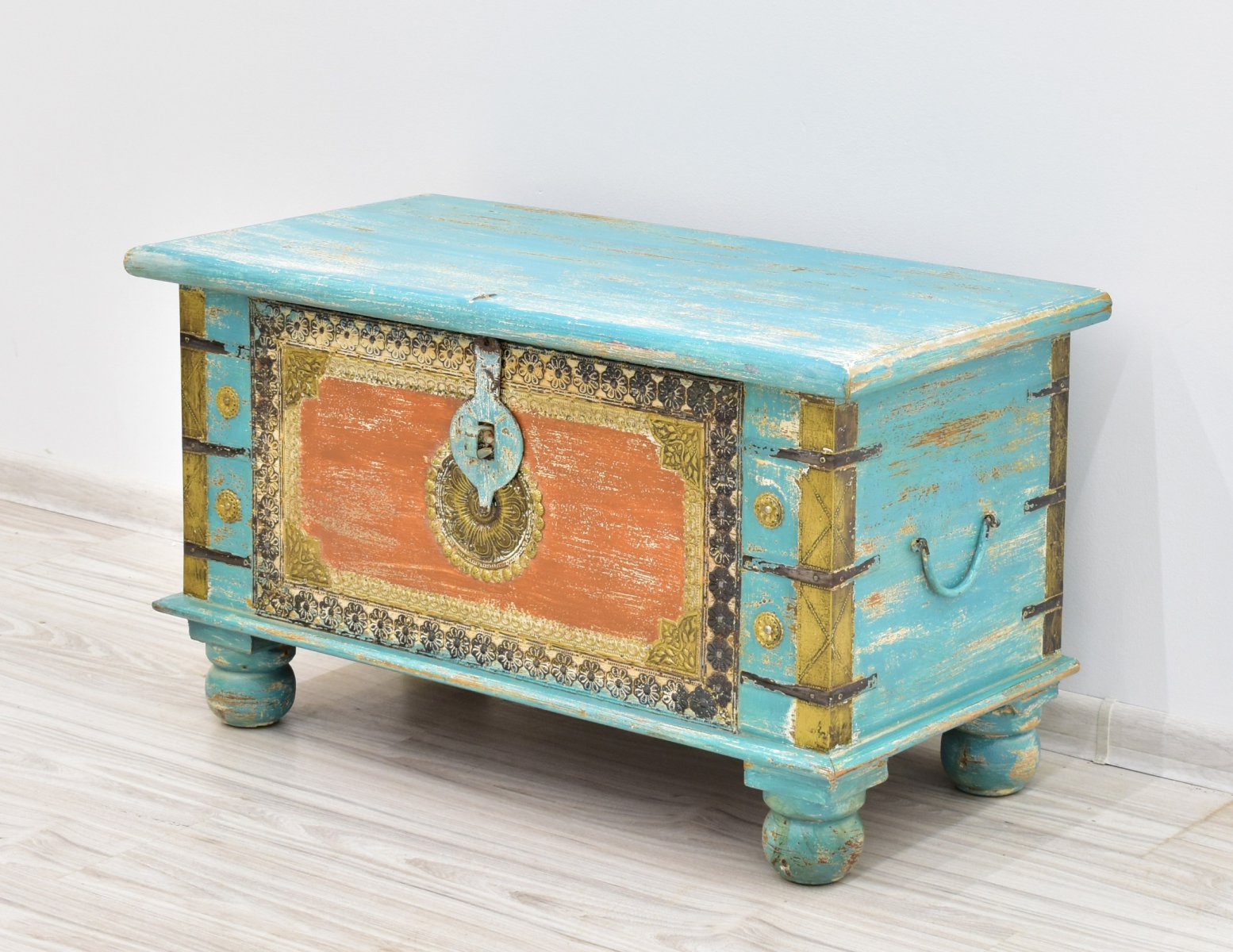 Ręcznie malowana skrzynia z egzotycznego drewna mango, kolorowa, przecierana, zdobiona na froncie. Mebel unikatowy.