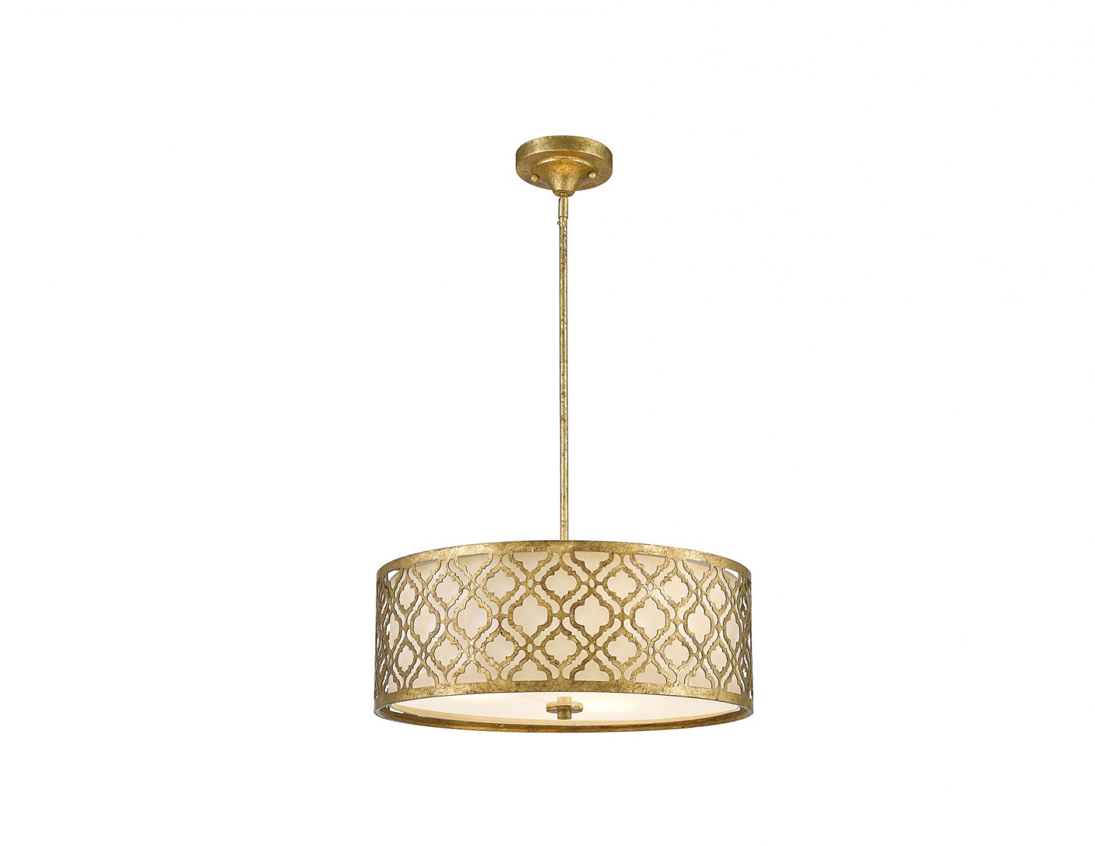 Lampa wisząca z serii Arabella wykonana z metalu, w ażurowe motywy w kolorze przecieranego złota. Spodnia warstwa abażura wykonana z jasnego lnu. Średnica lampy wynosi 53,3 cm, jej wysokość 20,3 cm. Wysokość lampy można regulować i kształtuje się od 34,3 cm do 132,1 cm. Źródło światła: 3 x 75W E27. Przewidywany czas realizacji ok. 2 tygodnie. W związku z tym, że produkt jest wykonywany i sprowadzany pod indywidualne zamówienie, klientowi nie przysługuje 14-dniowe prawo do odstąpienia od umowy.