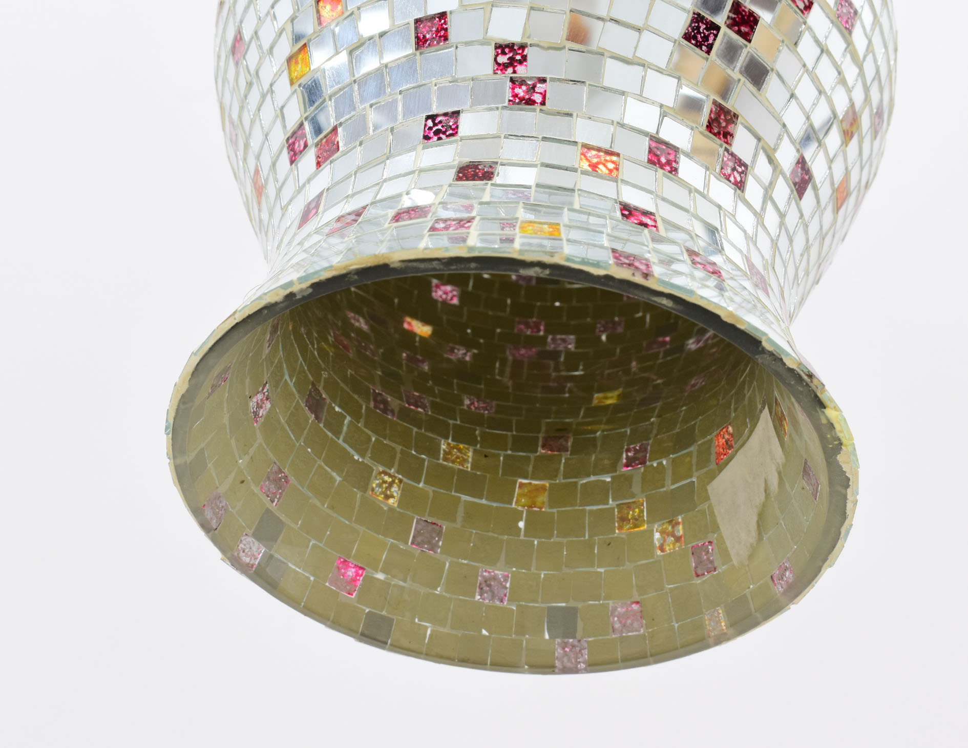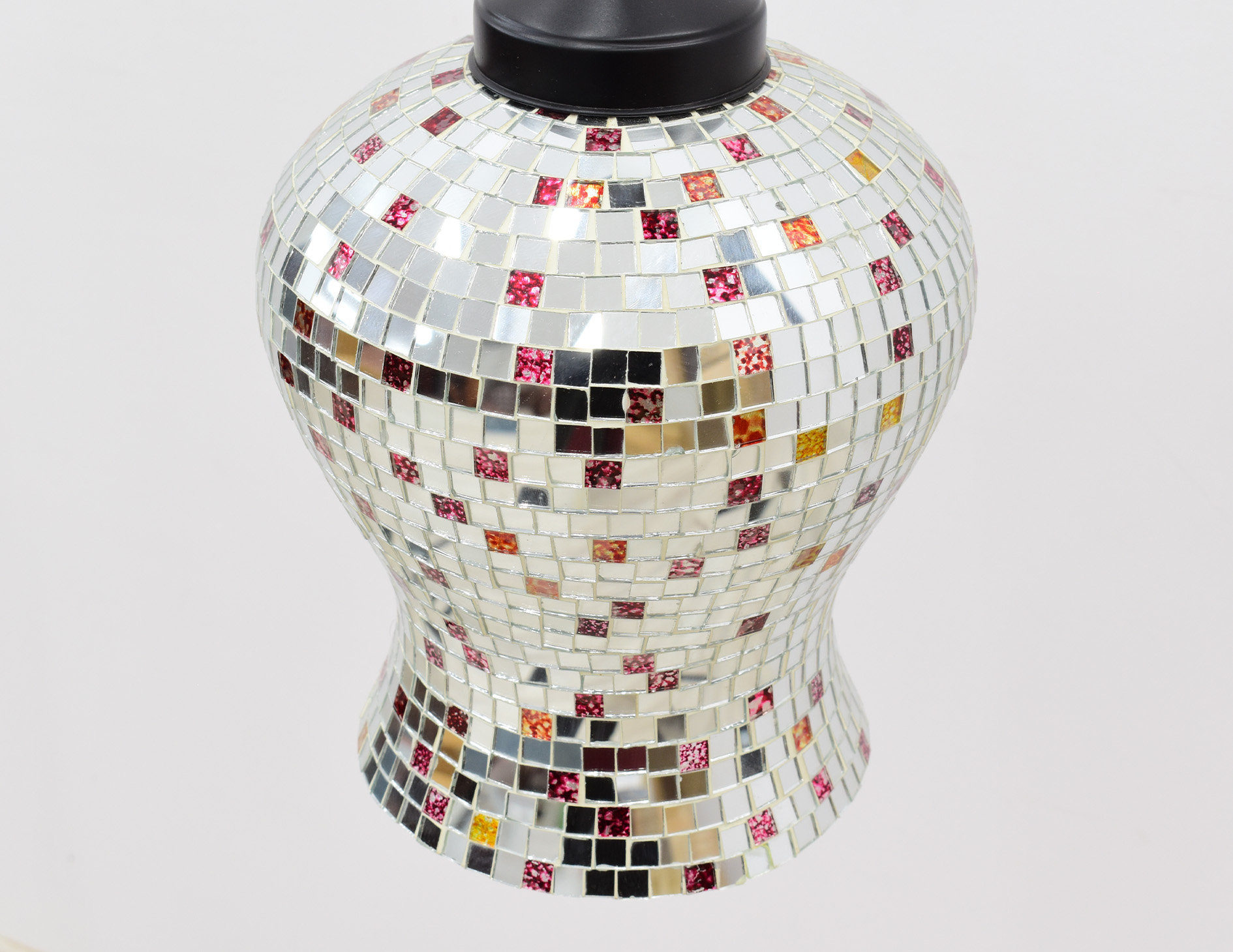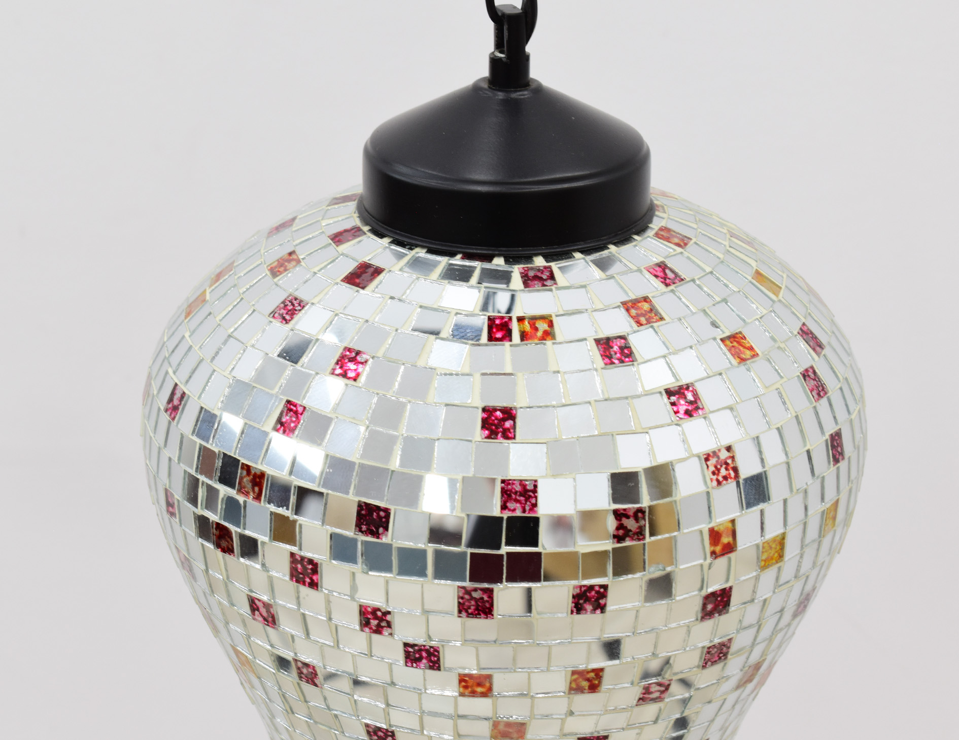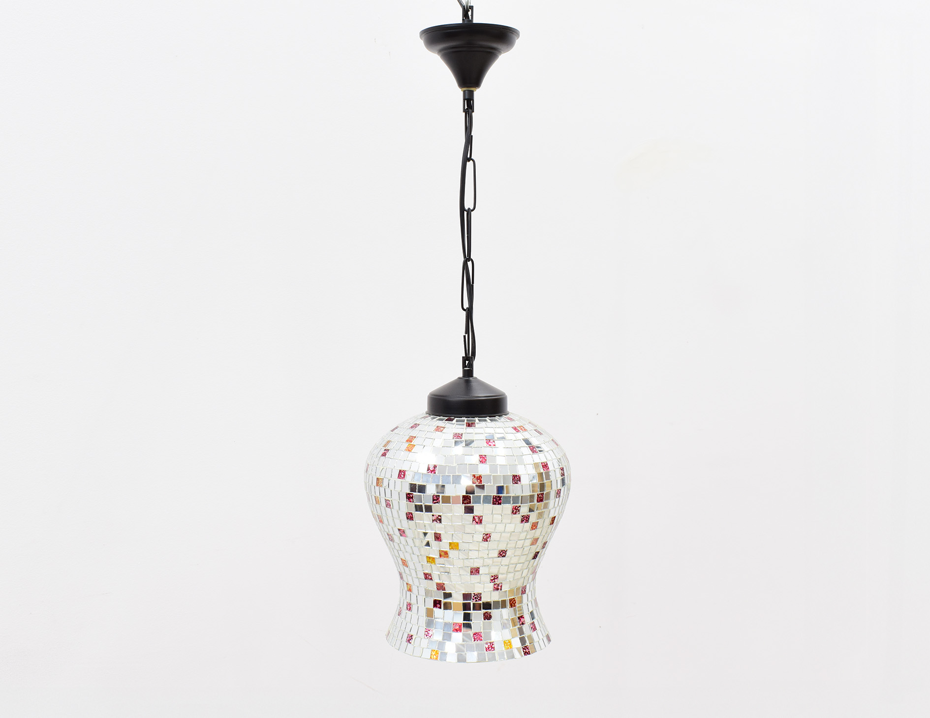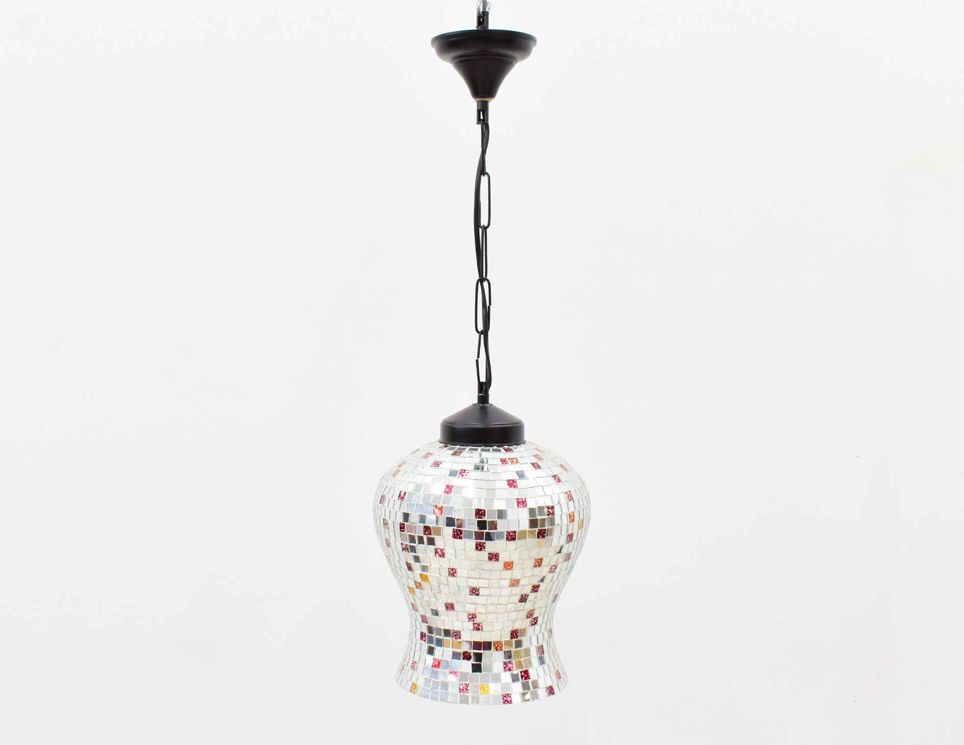 Stylizowana indyjska lampa wisząca z 1 źródłem światła. Średnica oprawy wynosi 22 cm, natomiast jej wysokość 30 cm. Wysokość zwisu można regulować na łańcuchu o długości 26 cm, wobec czego wysokość całkowitą można kształtować w zakresie 44-69 cm. Lampa wyposażona w oprawę na 1 żarówkę gwint E14. Towar drugiego gatunku objęty wyprzedażą ekspozycji ze względu na wady wizualne widoczne na zdjęciach.