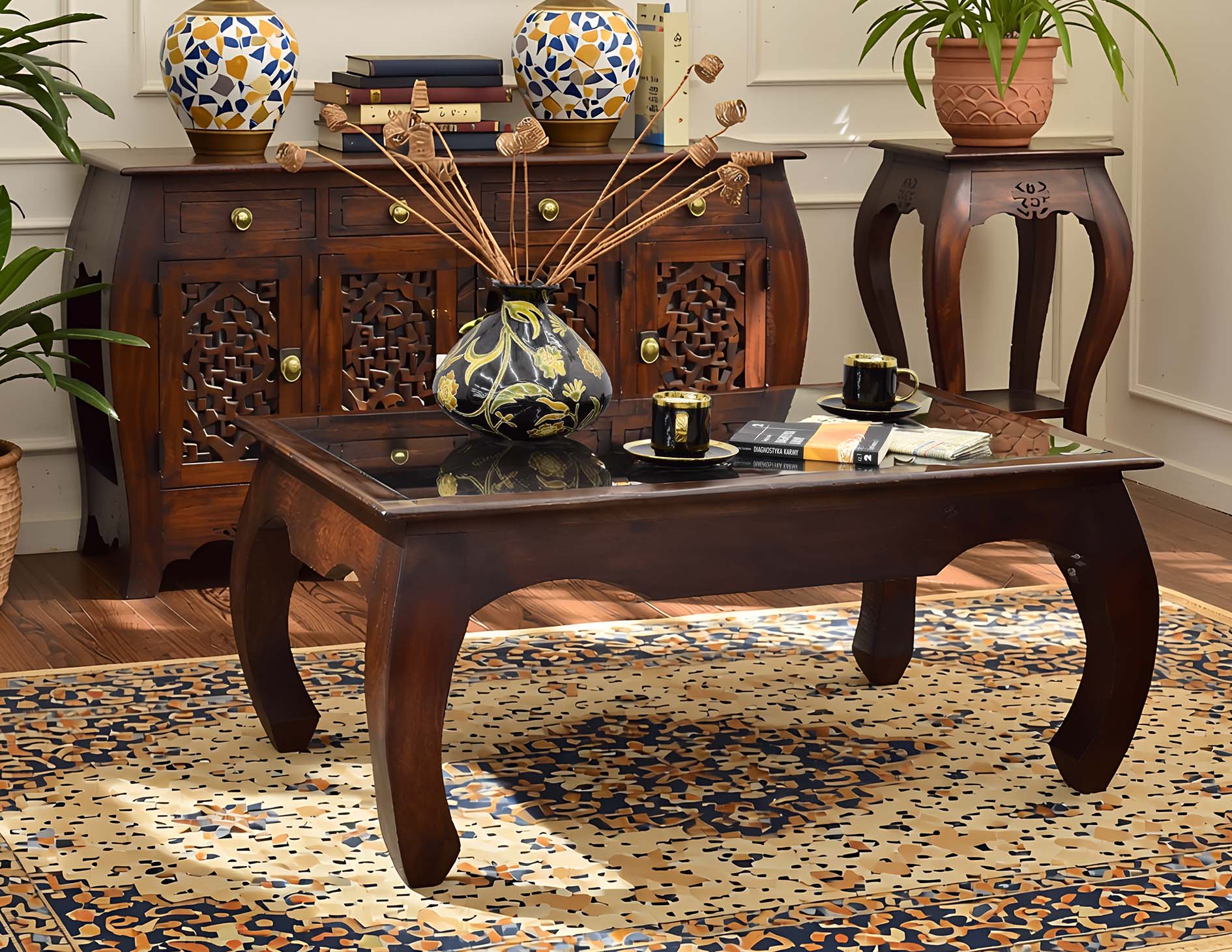 Unikatowy stolik kawowy, który posiada misterne rzeźbienia w blacie. Rzeźbienia te skupiają się wokół archaicznie przedstawionych postaci i figur geometrycznych. Całość okrywa wpuszczona w blat szyba. Dodatkowego orientalnego stylu dodają gięte na styl indyjski nogi. Stolik wykonany z drewna palisandru indyjskiego. Części drewniane to w 100% lite drewno.