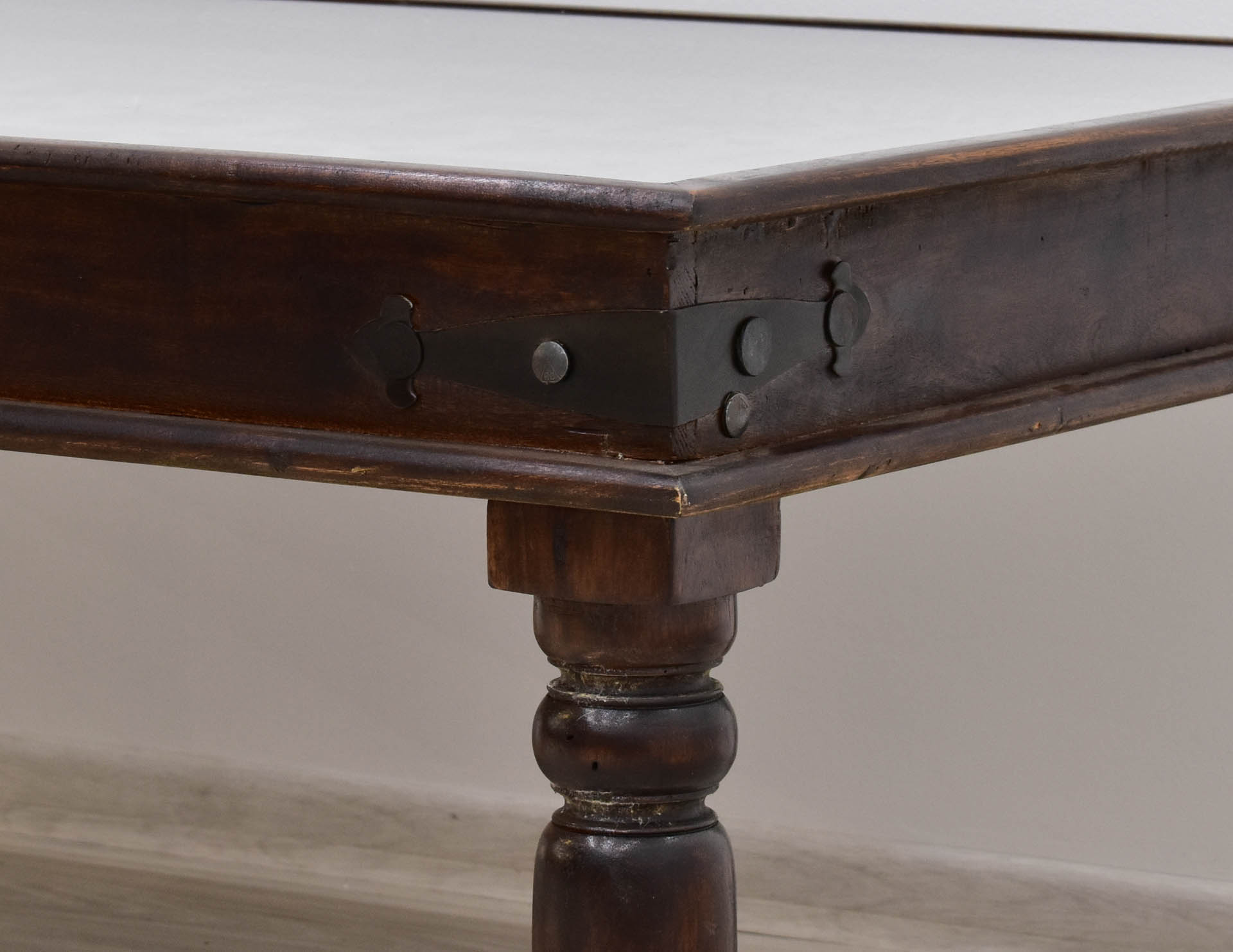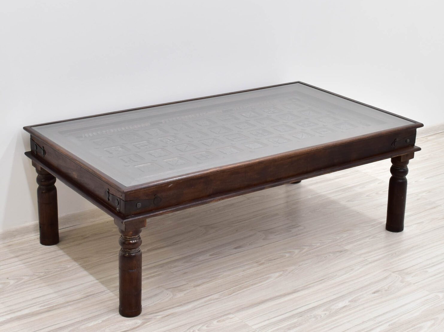 Ława kolonialna o wymiarach 140/80/48cm została wykonana w 100% z litego drewna akacji indyjskiej. Posiada rzeźbiony blat wybarwiony na ciemniejszy kolor, zabezpieczony wpuszczoną do środka ławy szybą. Ten indyjski stolik kawowy ma piękne masywne toczone nogi. Posiada delikatne metalowe okucia na rogach stołu. Ta egzotyczna ława jest wybarwiona na ciemny brąz co nadaje jej bardzo klasyczny wygląd, a rzeźbione detale stanowią unikatowy orientalny akcent. Każdy egzemplarz jest wyjątkowy, gdyż wykonany za pomocą rąk ludzkich w małych indyjskich manufakturach.