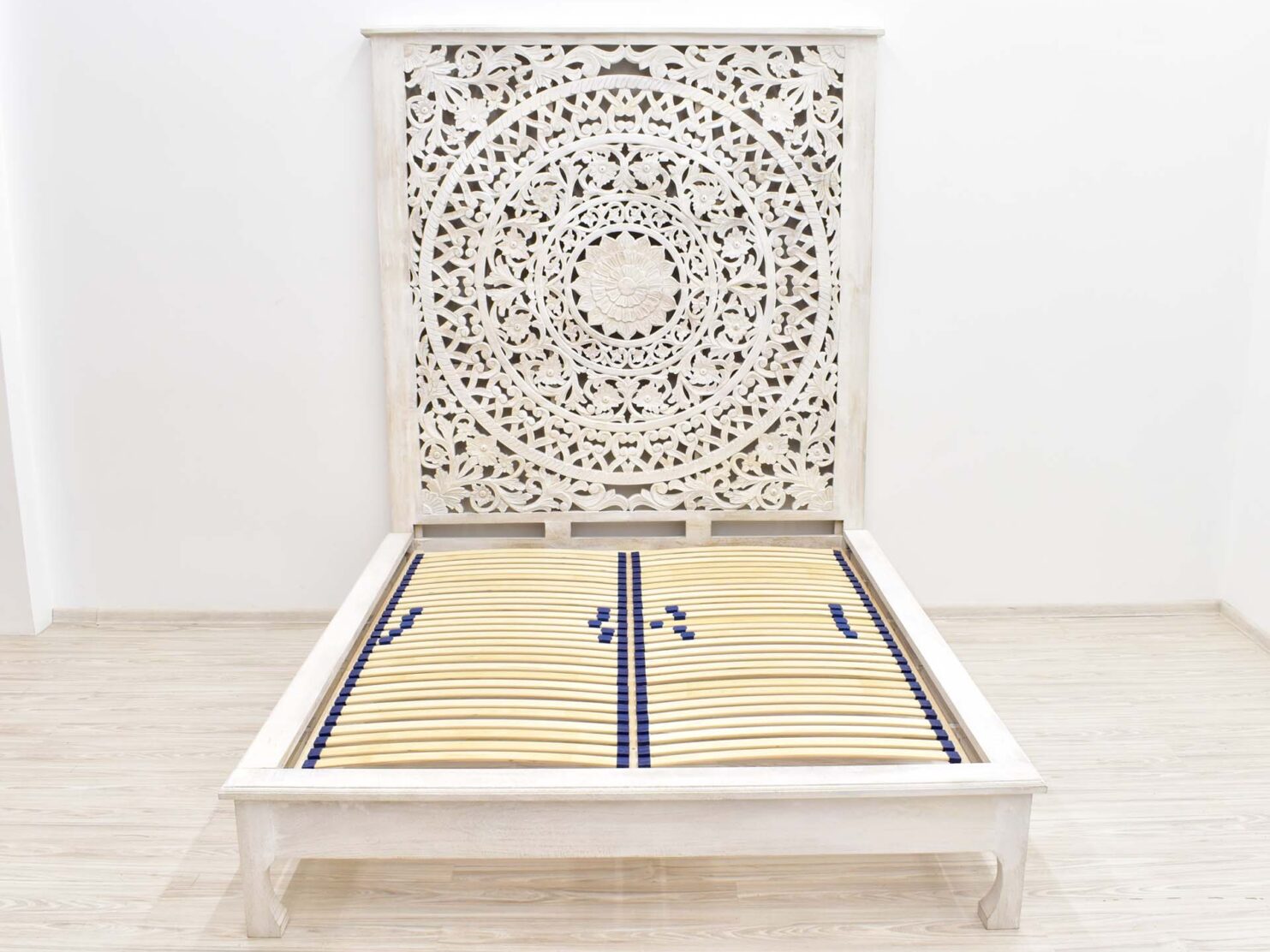Wyjątkowe kolonialne łóżko z ażurowym wezgłowiem przeznaczone pod rozmiar materaca 180×200 cm. Mebel ręcznie wytworzony w Indiach. Łóżko wyposażone dodatkowo w stelaż Twinpack widoczny na ostatnich zdjęciach. Do tego łóżka idealnie będą pasować szafki nocne z drewna mango.
