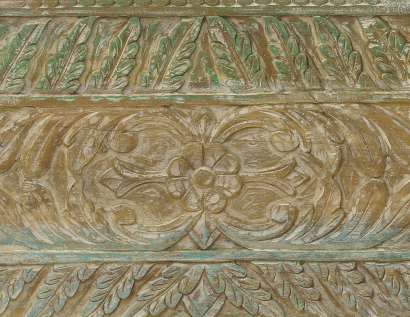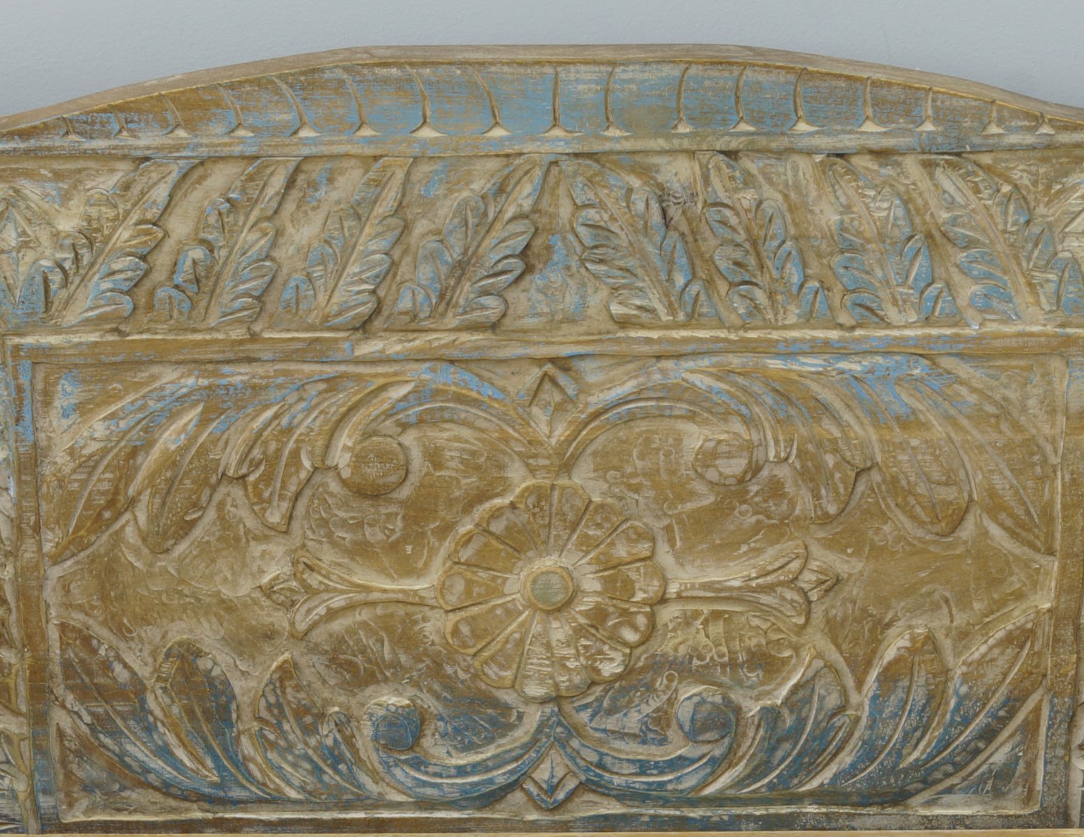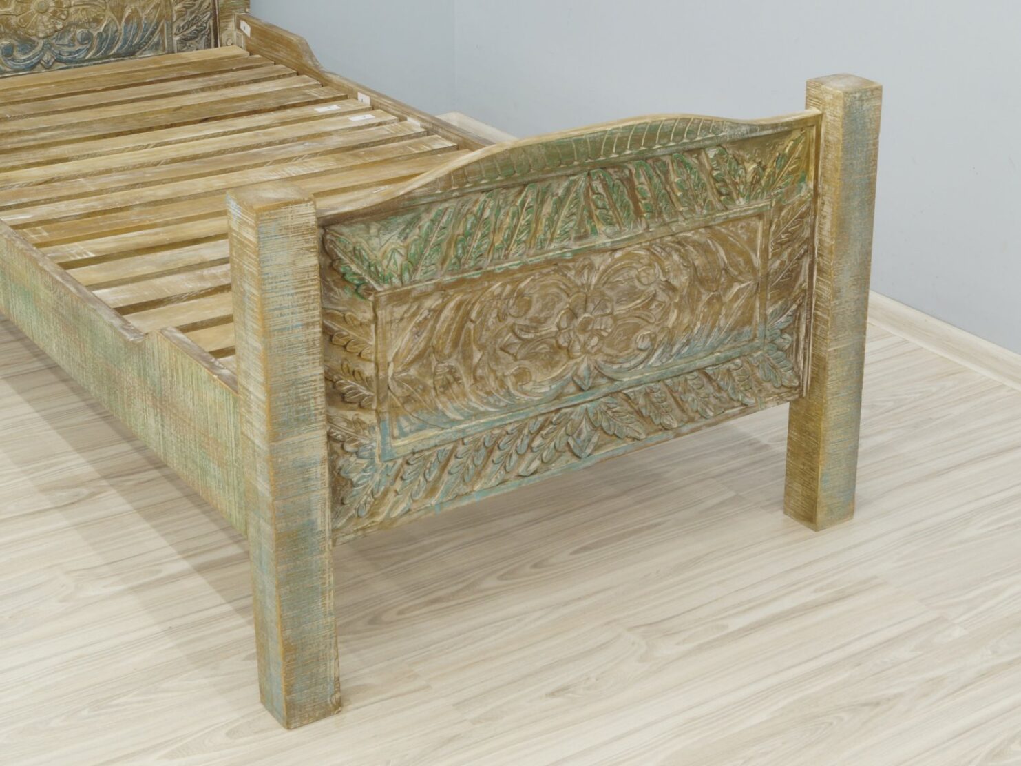 Łóżko indyjskie, pojedyncze stworzone z jasnego w 100% litego drewna mango. Jest to łóżko dostosowane pod materac 90x200cm, posiadające oryginalne hinduskie użebrowanie. Całość została udekorowana w trendzie Shabby Chick, czyli pomalowana warstwami na pastelowe kolory, następnie przecierana, tak aby uzyskać efekt postarzenia mebla. Wezgłowie i przynóże posiadają misterne, ręczne rzeźbienia, które dodają orientalnego charakteru i, razem z kolorami, przełamują surowy styl drewna mango.