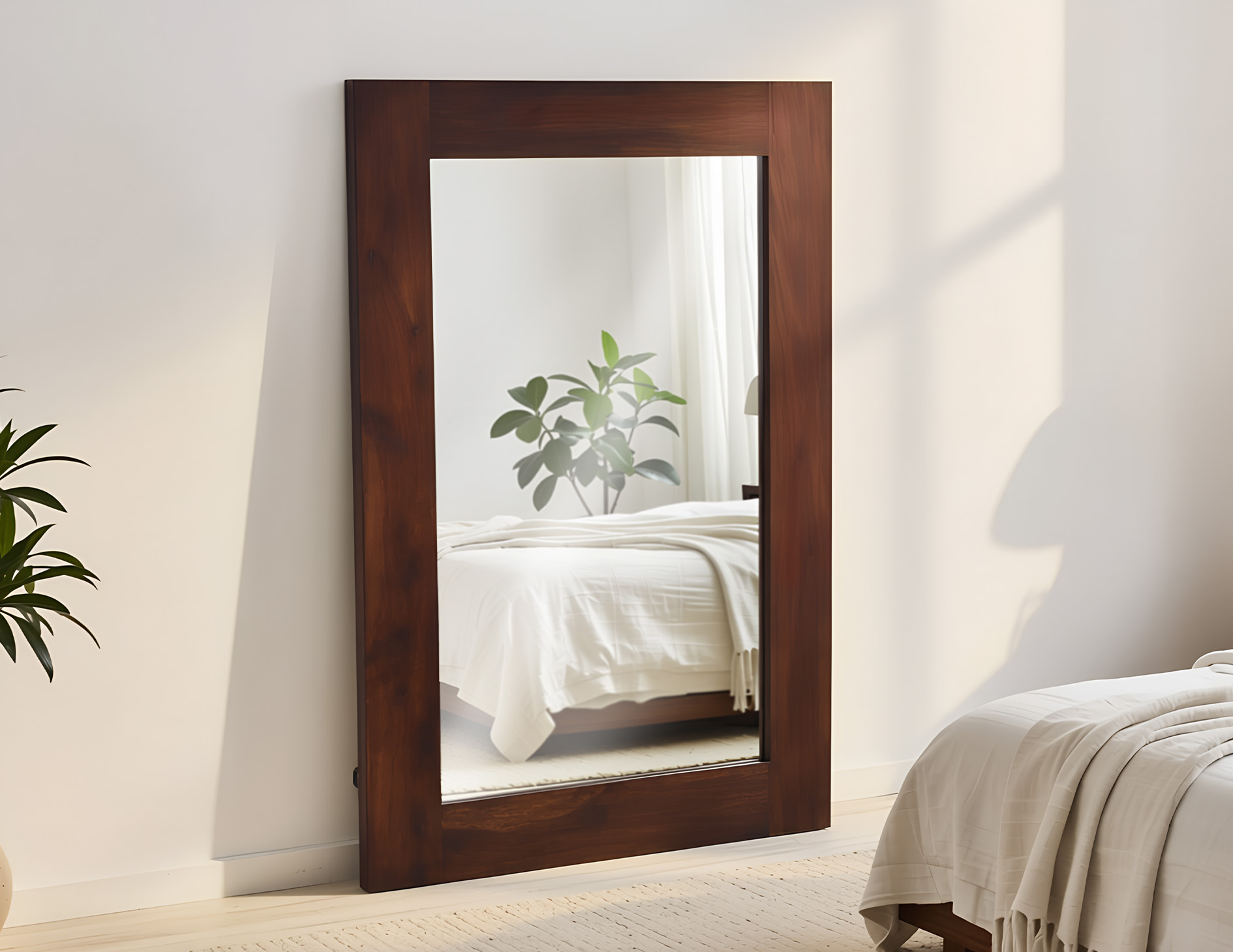 Lustro w prostej, drewnianej ramie wybarwionej na ciemny brąz. Piękna, masywna rama stworzona w 100% z litego palisandru stanowi doskonałą ozdobę tafli lustra, co czyni ten egzemplarz nowoczesnym, a zarazem eleganckim elementem dekoracyjnym. Szerokość ramy lustra wynosi 12 cm.