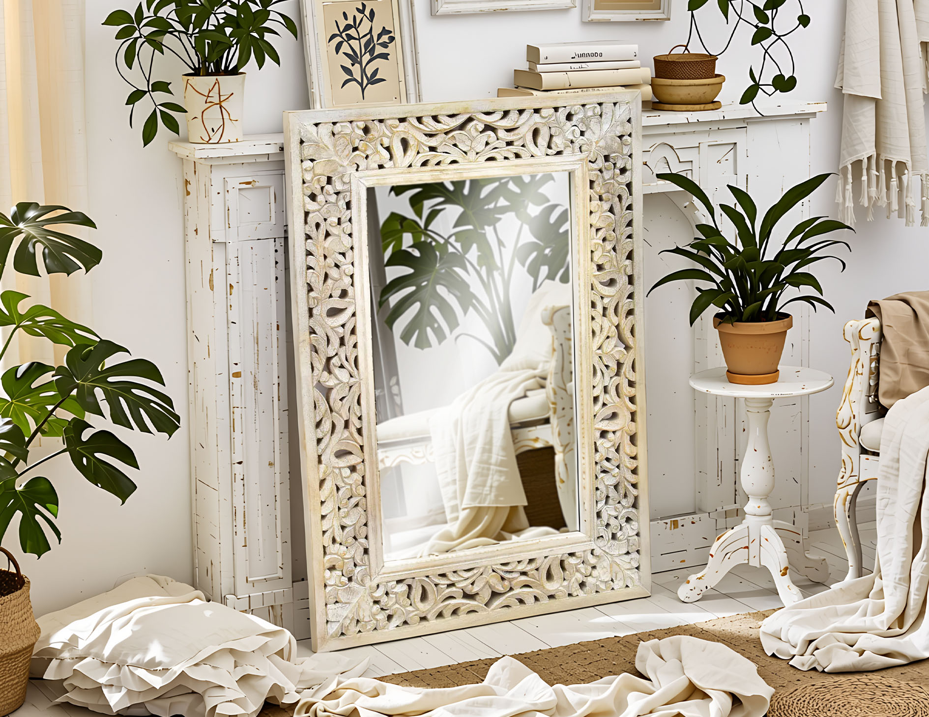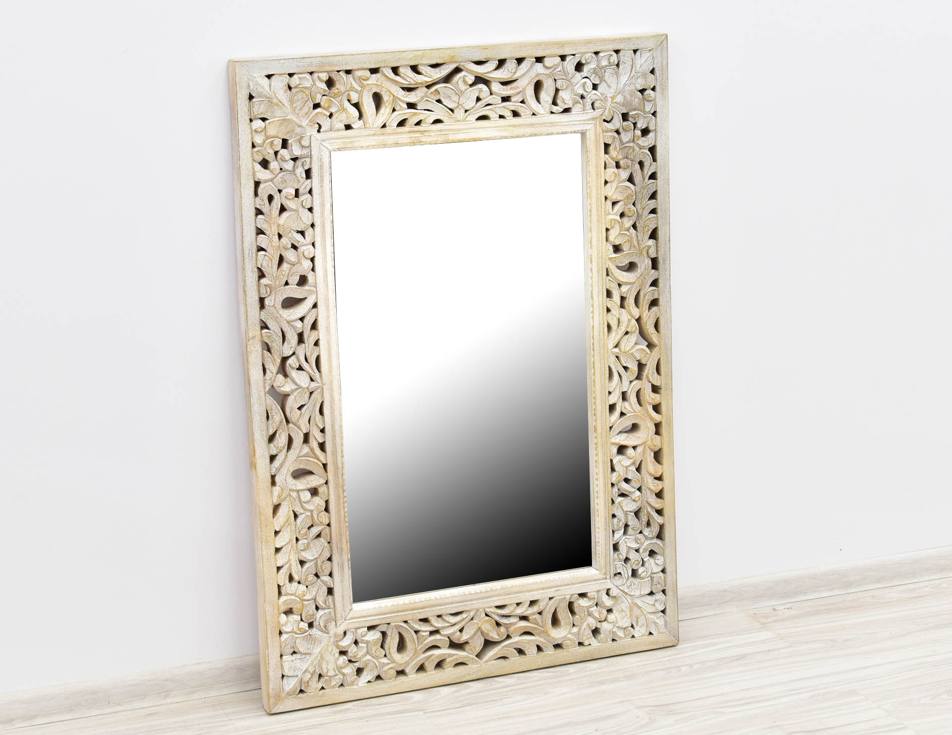 Lustro kolonialne w ramie z litego drewna mango. Szeroka rama lustra eksponuje unikatowy, ażurowy, rzeźbiony ręcznie motyw. Drewno zostało zabarwione na biało, a następnie stylowo przetarte.