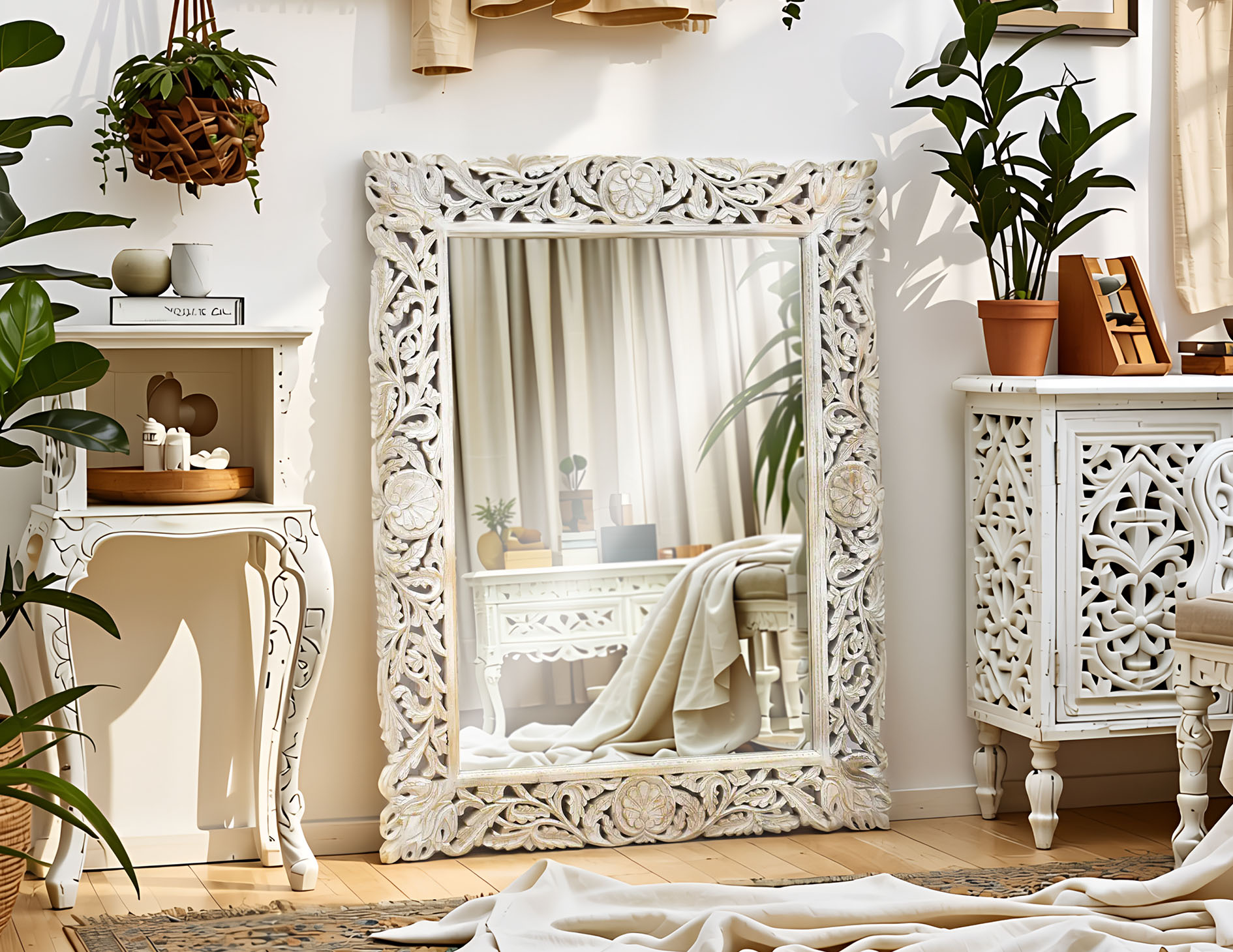 Lustro kolonialne w masywnej ramie wykonanej w 100% z litego drewna mango. Misterne rzeźbienia, w postaci ażurowych motywów roślinnych, stanowią niezwykłą ozdobę dla tafli lustra. Cała rama wybarwiona została na biało i stylowo przetarta.