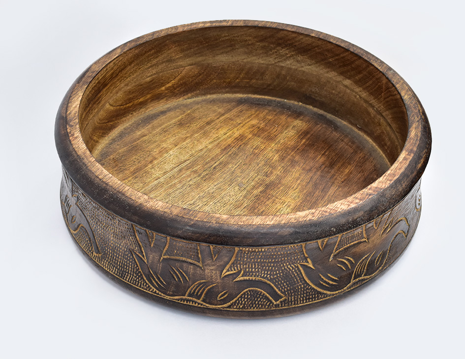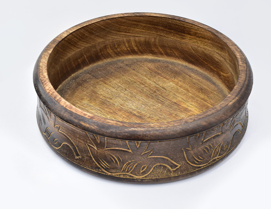 Półmisek ręcznie wytworzony oraz misternie rzeźbiony. Powstał w Indiach z litego drewna. Doskonała ozdoba kolonialnie urządzonego salonu lub nietuzinkowy pomysł na prezent.