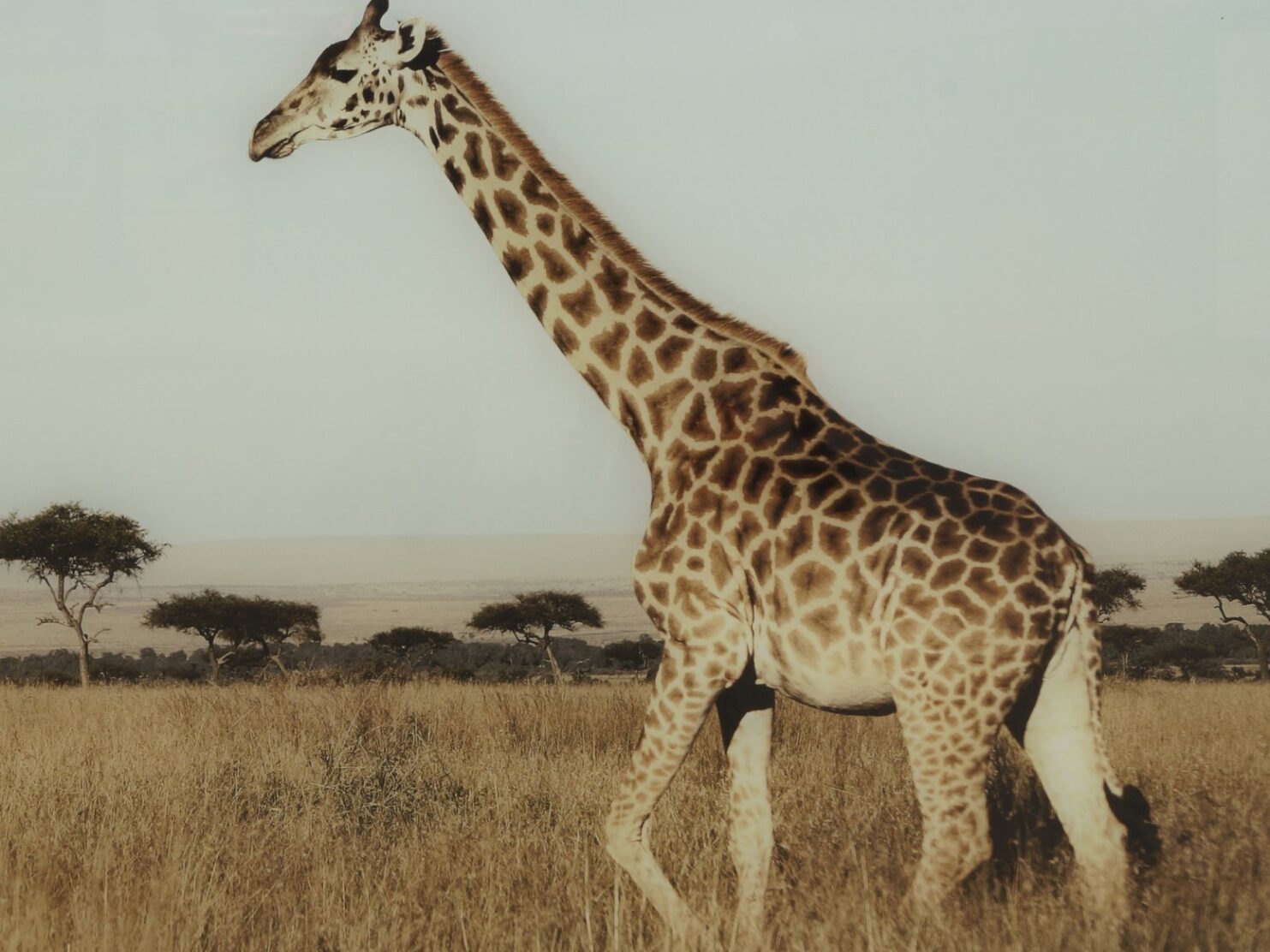 Szklany obraz przedstawiający naturalny krajobraz sawanny afrykańskiej, a na niej dostojną żyrafę. Obraz ten wykonany został przy użyciu druku cyfrowego, dzięki czemu jest niezwykle wyraźny. Druk zabezpieczony szkłem.