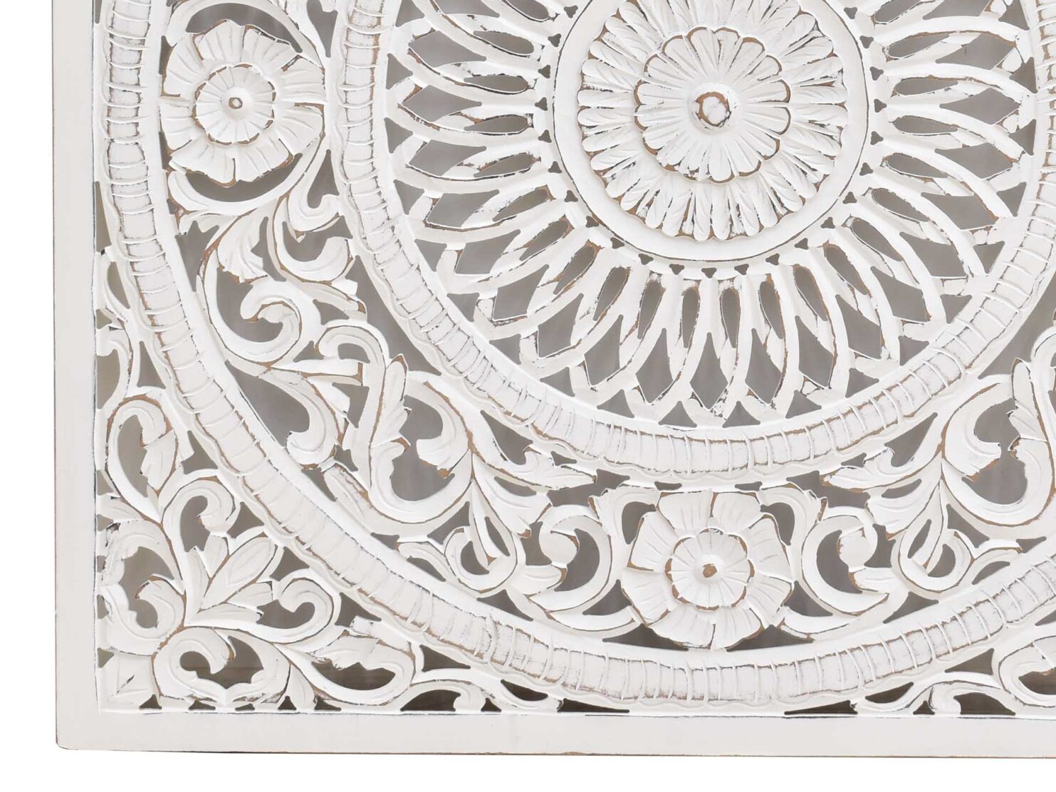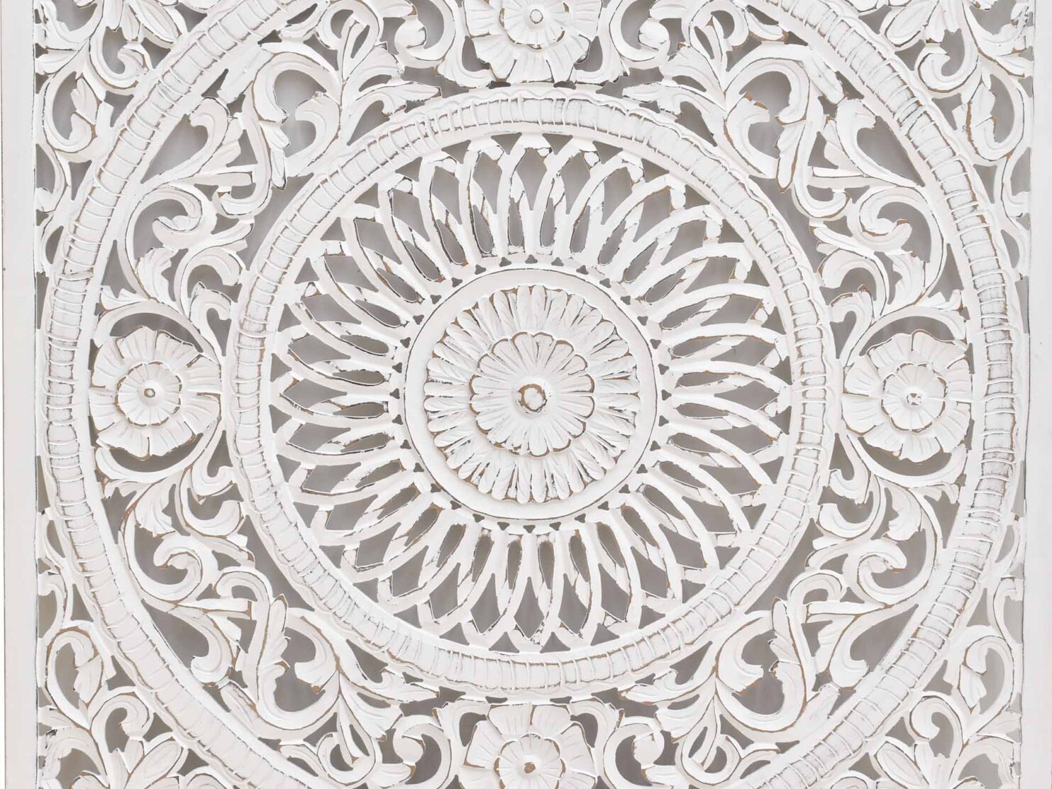 Panel ścienny stworzony w Indiach. Posiada wzór w kształcie rozety z motywami roślinnymi. Pomalowany na biały kolor. Stanie się unikatową ozdoba każdego salonu bądź sypialni. Posiada uchwyty do zawieszenia na ścianie.