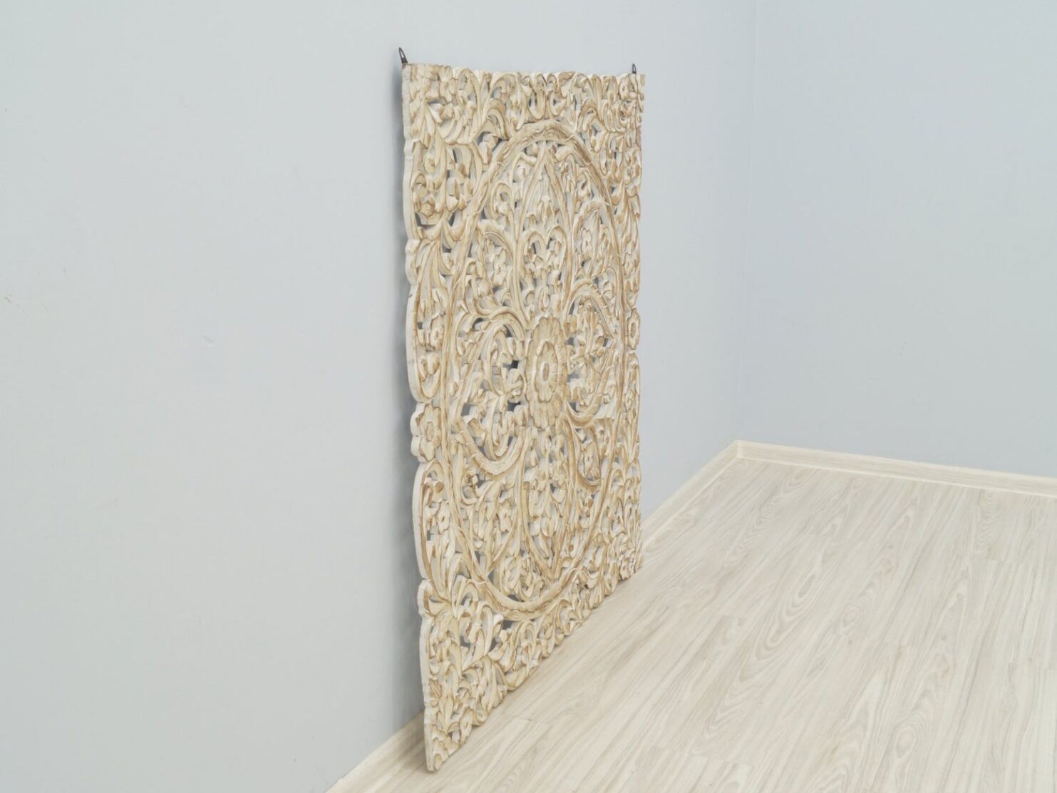 Indyjski, stylowy panel ścienny, który swoim unikatowym wzorem ozdobi każdą stylową sypialnię czy nawet salon. Panel skupia się w kształt kwadratu z niezwykłą rozetą w środku.