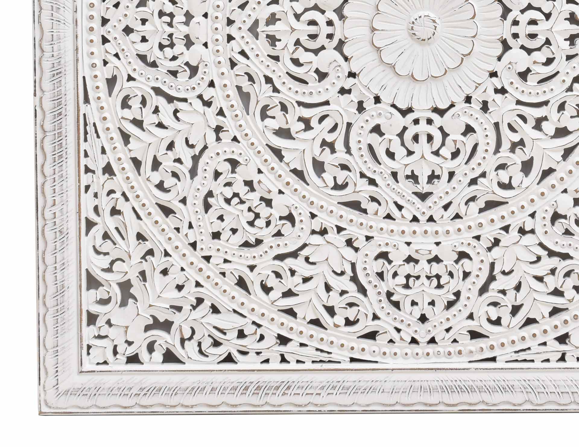 Panel indyjski w kształcie kwadratu o boku 121 cm. Owa dekoracja została pomalowana na biało, a następnie przetarta w stylu antycznym. Może stanowić stylowy akcent w salonie bądź sypialni. Panel posiada uchwyty do mocowania na ścianie.