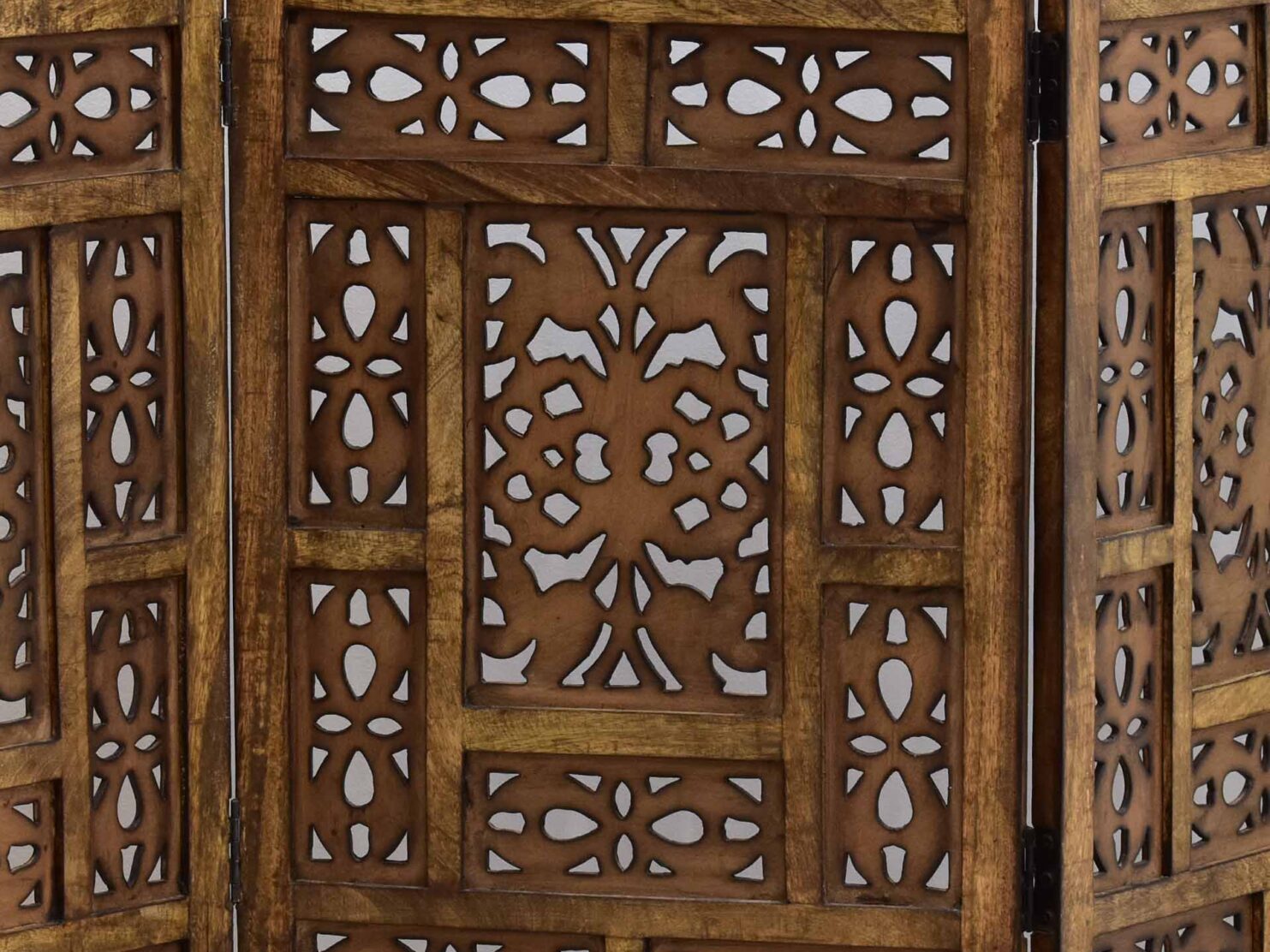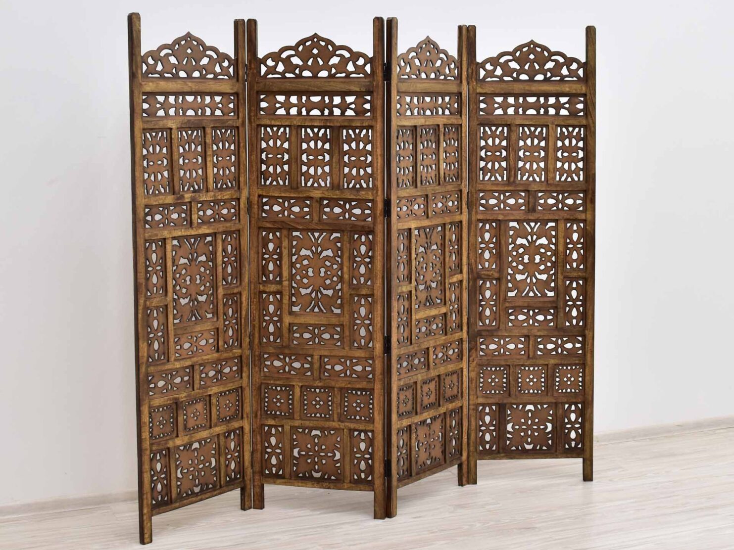 Składający się z czterech części parawan indyjski. Ta nietuzinkowa praktyczna ozdoba została wybarwiona na brązowy kolor. Każdy panel ma wymiary 50x180cm.