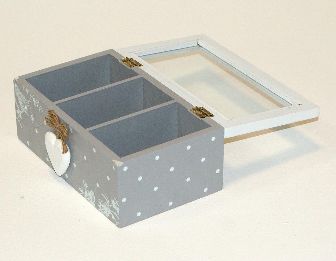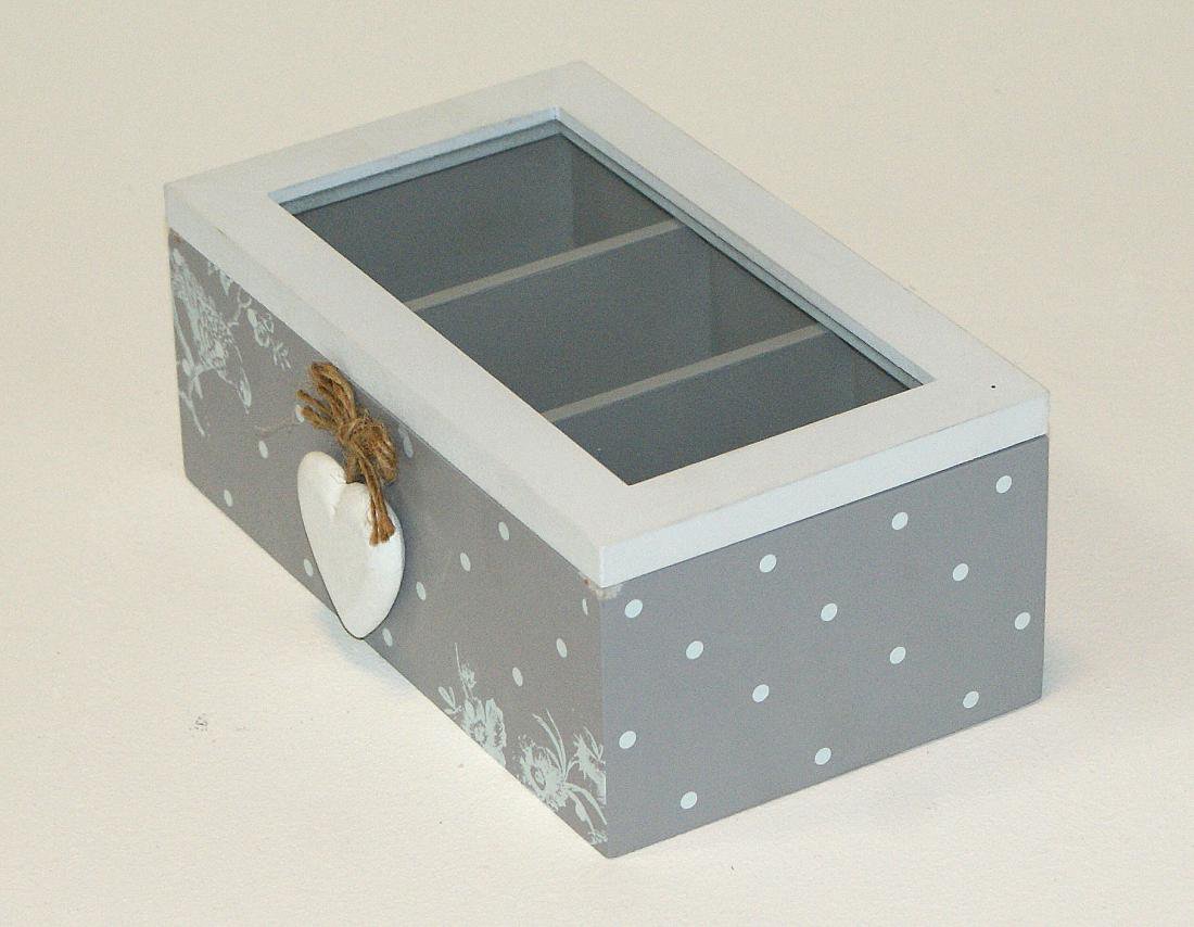 Pudełko na herbatę w stylu Vintage. Wytworzone z drewna, pomalowane na szaro i biało, udekorowane kropkami. Posiada przeszklone wieczko i trzy pojemne przegródki na herbatę. Dodatkowo udekorowane serduszkiem na sznureczku.