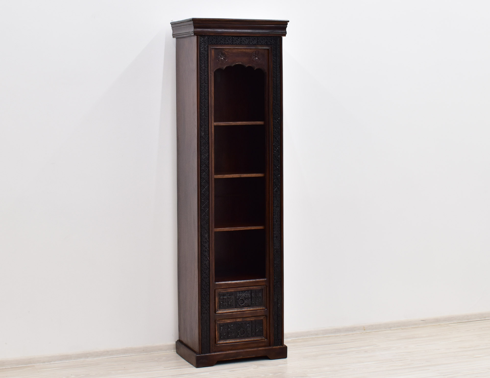 Regał kolonialny wykonany z litego drewna akacji indyjskiej, wybarwiony w ciemnym odcieniu brązu. Mebel masywny, ręcznie rzeźbiony z ciemnym ornamentem na szufladach i po bokach bryły, masywnymi uchwytami z metaloplastyki. Regał wyposażony w 2 szuflady oraz 4 półki. Mebel wybarwiony w ciemnym odcieniu brązu.