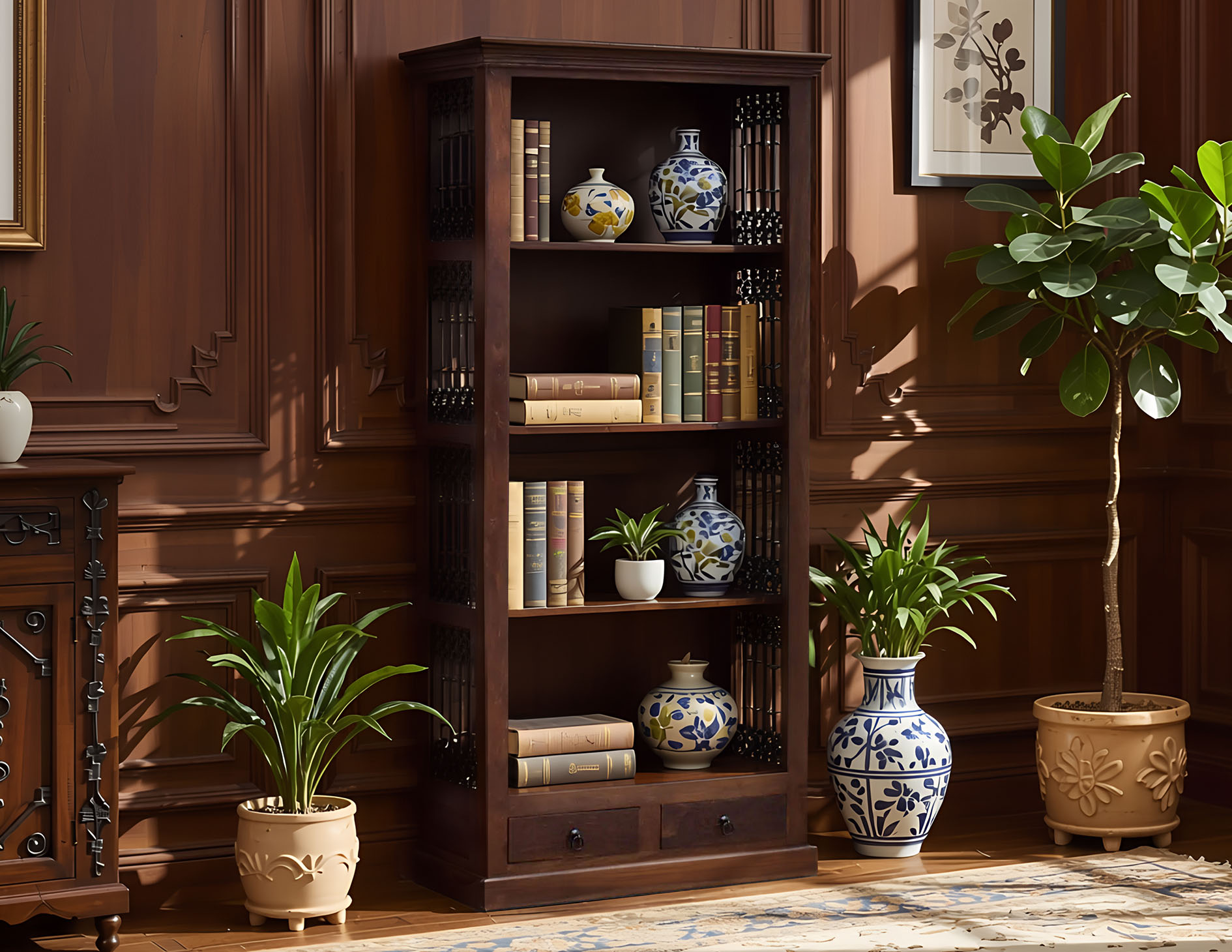 Regał kolonialny ręcznie wykonany w Indiach w 100% z litego drewna palisandru indyjskiego.