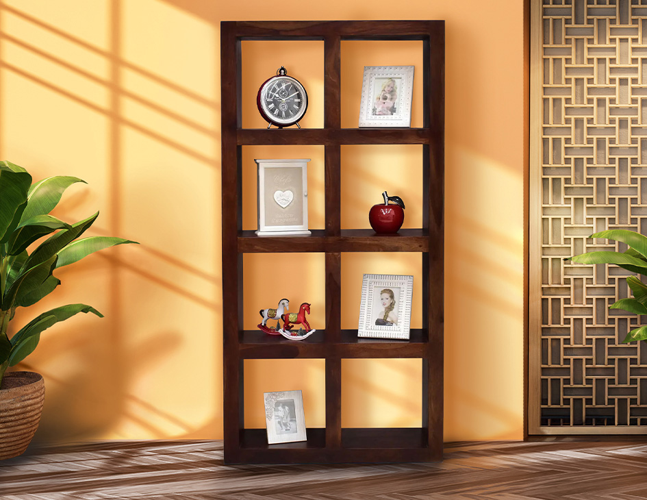 Regał kolonialny z ośmioma wnękami. Jest to masywny mebel, który nie posiada tylnej ścianki, oparty na prostej konstrukcji z drewna palisandru indyjskiego. Stworzony został w 100% z litego drewna wybarwionego na jasny brąz. Funkcjonalność i surowy styl wpisują jego w nowoczesną, minimalistyczną przestrzeń.