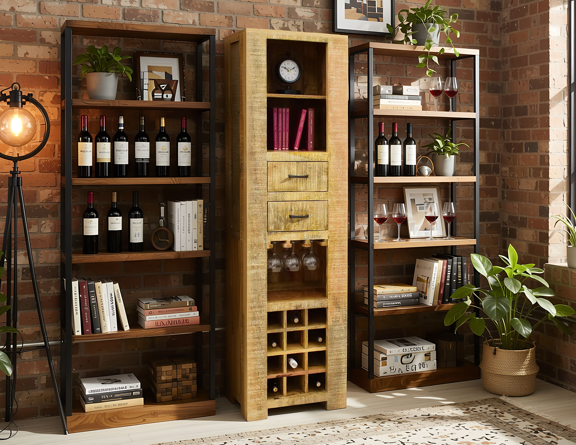 Regał na wino kolonialny indyjski Loft lite drewno mango z szufladami