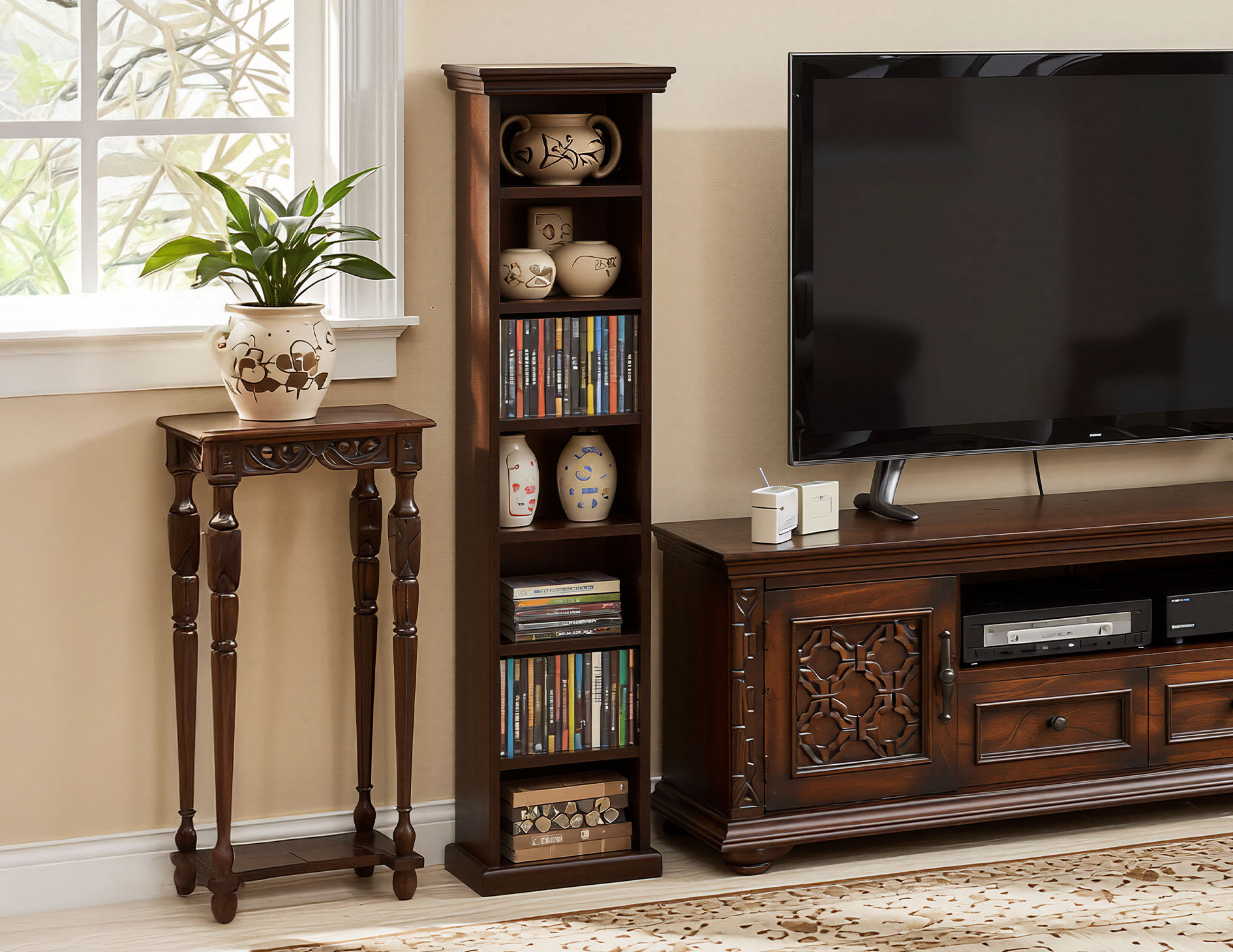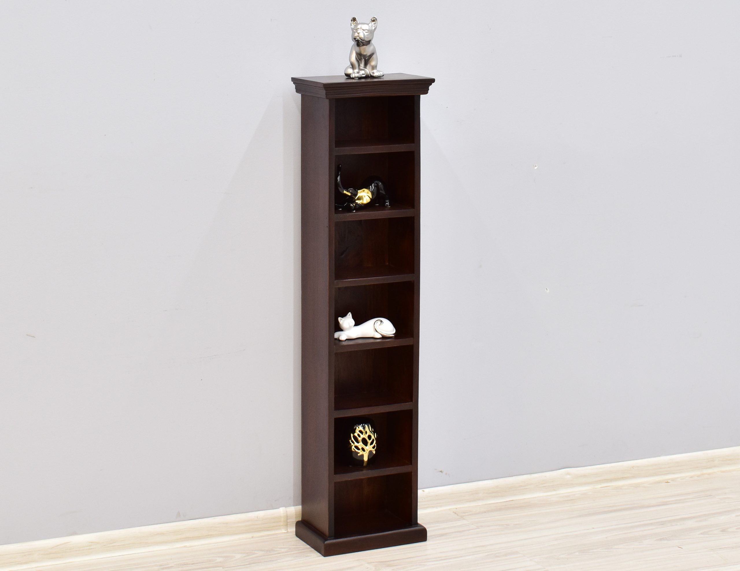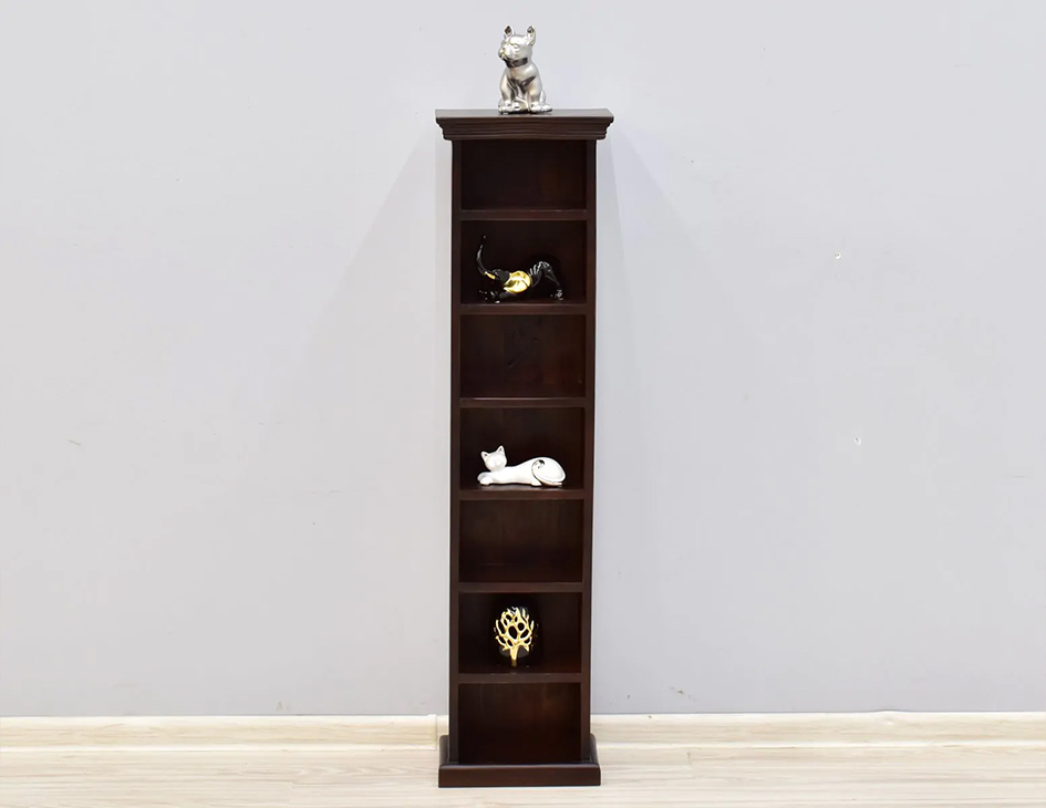 Wysoka szafka kolonialna, która posiada siedem półek na płyty CD, może znaleźć zastosowanie jako mały regał na na pamiątki. Wykonana z litego drewna palisandru indyjskiego w kolorze ciemnego brązu.